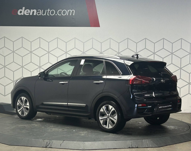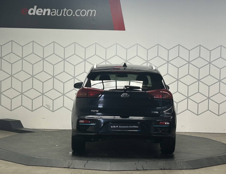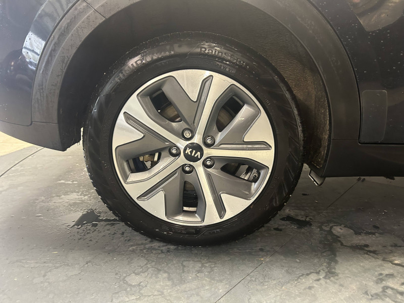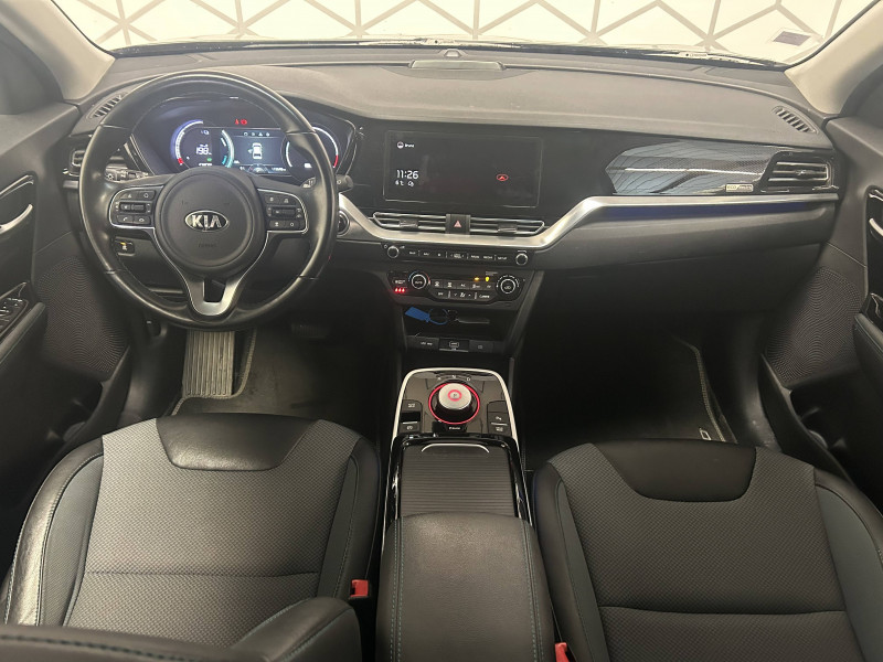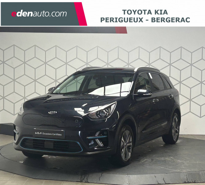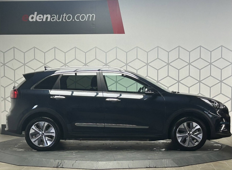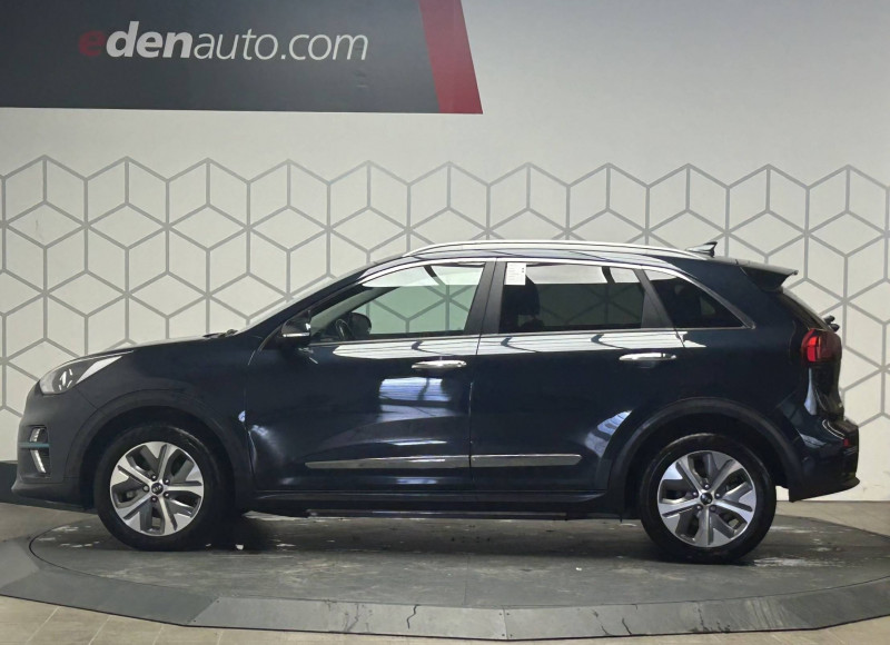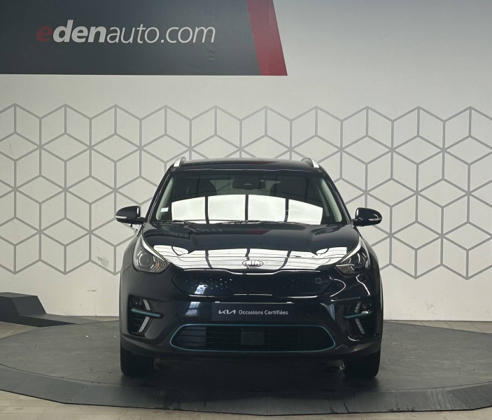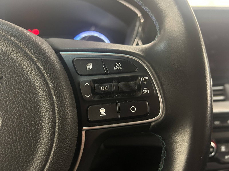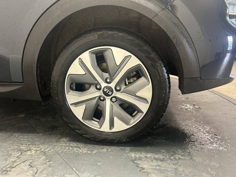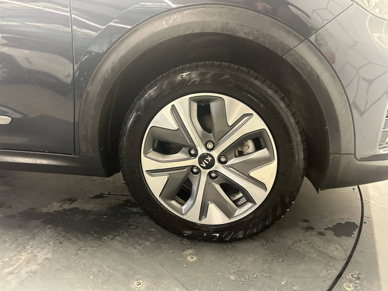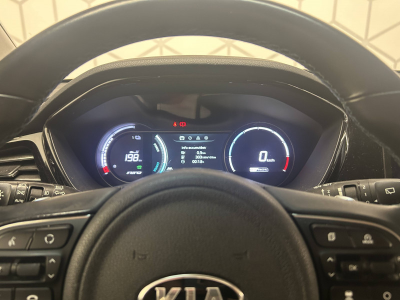 7 airbags dont un airbag genoux conducteur / ABS avec répartiteur électronique de freinage (EBD) / Accoudoir central AR avec porte-gobelets intégrés / Accoudoir central AV avec compartiment de rangement et prise de recharge USB / Aide au maintien dans la file (LKA) / Airbags frontaux, latéraux AV, rideaux AV et AR et genoux côté conducteur / Alerte de vigilance du conducteur (DAW) / Allumage automatique des projecteurs de croisement en fonction de la luminosité / Appuis-tête AV et AR réglables en hauteur et en inclinaison (à l'AV uniquement) / Assistance active à la conduite dans les embouteillages (LFA) / Bac de rangement et porte-bouteille dans les contre-portes AV / Becquet AR noir laqué intégré au hayon avec feux de stop à LED / Boucliers AV et AR couleur carrosserie avec inserts noir laqué et bleu anodisé / Câble de recharge pour prise domestique / Câble de recharge type 2 (T2-T2) 32A / Calandre pleine avec trappe d'accès à la prise de recharge / Caméra de recul avec lignes de guidage dynamiques / Chargeur embarqué monophasé 7,2 kW / Climatisation automatique avec fonction "Driver Only" / Combiné d'instrumentation Supervision 7'' / Compartiment range-lunettes / Compartiments de rangement sous le plancher de coffre / Connectique USB / Console centrale avec coffre de rangement et 2 porte-gobelets repliables / Console centrale avec éclairage d'ambiance (6 couleurs au choix: blanc, gris, bronze, rouge, vert et bleu) / Console centrale avec plateau de rangement inférieur équipé d'un tapis antidérapant en caoutchouc / Contrôle d'énergie prédictif (Predictive Energy Control, PEC) / Crochets de fixation dans le coffre / Diffuseur d'air aux places AR / Direction assistée asservie à la vitesse / Eclairage dans le coffre / Eclairage de la prise de recharge / Ecran tactile couleur 10,25", système de navigation, fonction ECO-DAS, cartographie Europe, mise àà jour de la cartographie et services connectés Kia Live offerts pendant 7 ans, compatibilité Android Auto et Apple CarPlay / Entourage des aérateurs bleu anodisé / Géolocalisation des bornes de recharge via la navigation embarquée et les services connectés Kia Connect Live / Grille de radiateur avec volets de refroidissement actifs / Inserts noir laqué sur console centrale, contre-portes, sérigraphie bleu anodisé sur le volant / Jantes en alliage 17" finition diamantée / Kia Charge: service dédié de recharge en itinérance (application et carte de recharge) / Kit de dépannage en cas de crevaison / Lève-vitre conducteur électrique à fonction séquentielle / Modulation automatique de la puissance de freinage régénératif à la décélération / Ouverture et démarrage sans clé "Smart Key" / Palettes de modulation de la puissance de freinage régénératif au volant / Pare-soleil avec miroir de courtoisie illuminé (conducteur et passager) / Poche aumonière au dos du siège passager AV / Poignées de portes extérieures et protections latérales finition chrome / Poignées de portes intérieures finition chrome satiné / Porte-bouteille dans les contre-portes AR / Prise Combo 2 (CCS) / Programmation de la recharge et de la température de l'habitacle / Projecteurs AV à technologie dite de "projection" / Radars de parking AV/AR / Radio/MP3/DAB, 6 HP, avec commandes au volant / Rails de toit finition aluminium satiné / Rétroviseur intérieur électrochrome / Rétroviseurs extérieurs avec embase noir laqué / Rétroviseurs extérieurs avec répétiteurs de clignotant LED / Rétroviseurs extérieurs couleur carrosserie / Sélecteur de modes de conduite Eco+, Eco, Confort et Sport avec possibilité de paramétrage / Sellerie tissu / cuir de synthèse noir avec surpiqûres bleu anodisé / Surlignage des passages de roues en composite noir / Système DAB (Digital Audio Broadcasting) : système de radiodiffusion sonore numérique / Système de freinage d'urgence autonome avec détection des piétons (FCA) / Système de gestion intelligente des feux de route (HBA) / Système de son virtuel déconnectable (émet un léger son à basse vitesse afin de prévenir les piétons distraits) / Système de téléphonie mains-libres Bluetooth avec reconnaissance vocale / Système Intelligent de Régénération (Smart Regen System, SRS): Modulation automatique de la puissance de freinage régénératif à la décélération (Coasting Guide Control, CGC) et contrôle d'énergie prédictif (Predictive Energy Control, PEC) / Système Kia Connect - services télématiques offerts pendant 7 ans / Témoin de niveau bas du liquide de lave-glace / Verrouillage automatique des portières en roulant / Volant et levier de vitesses cuir