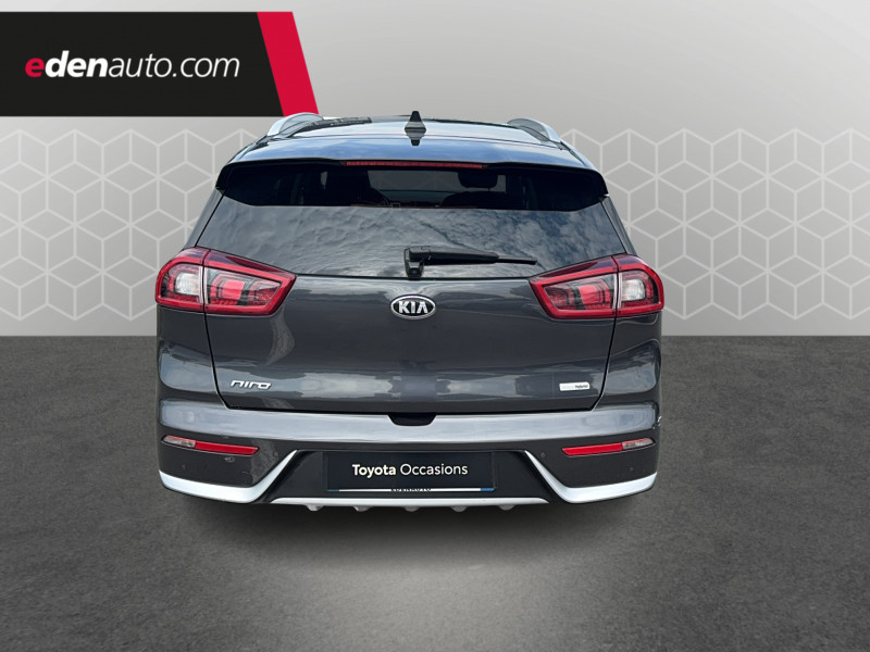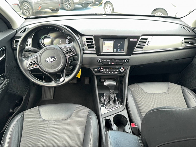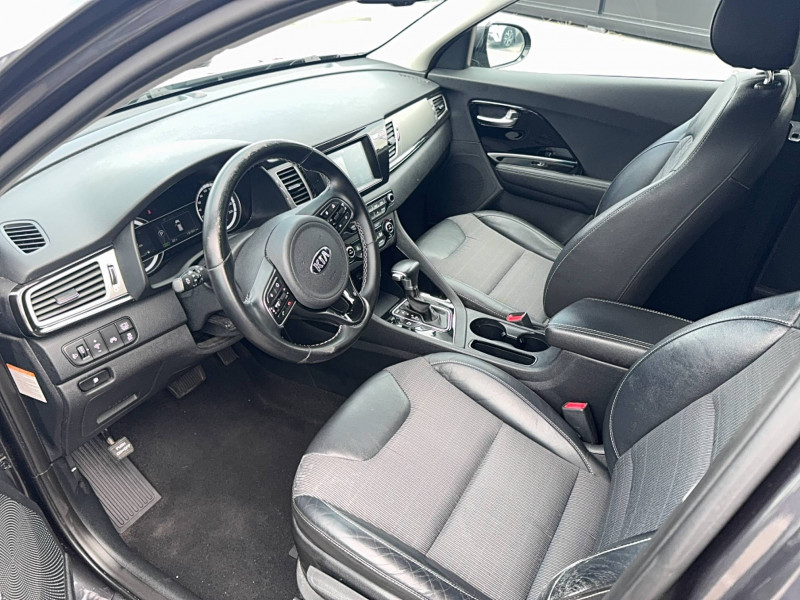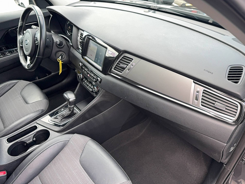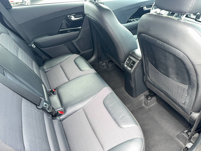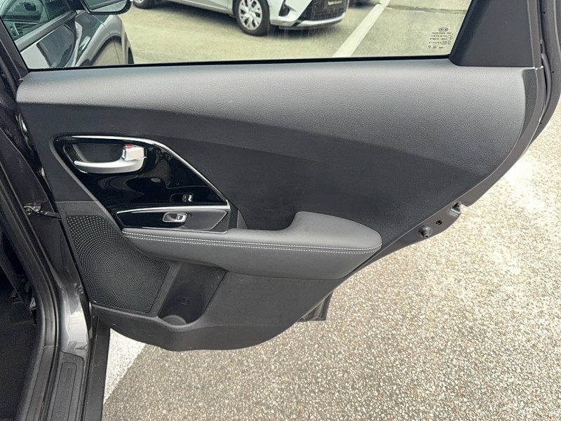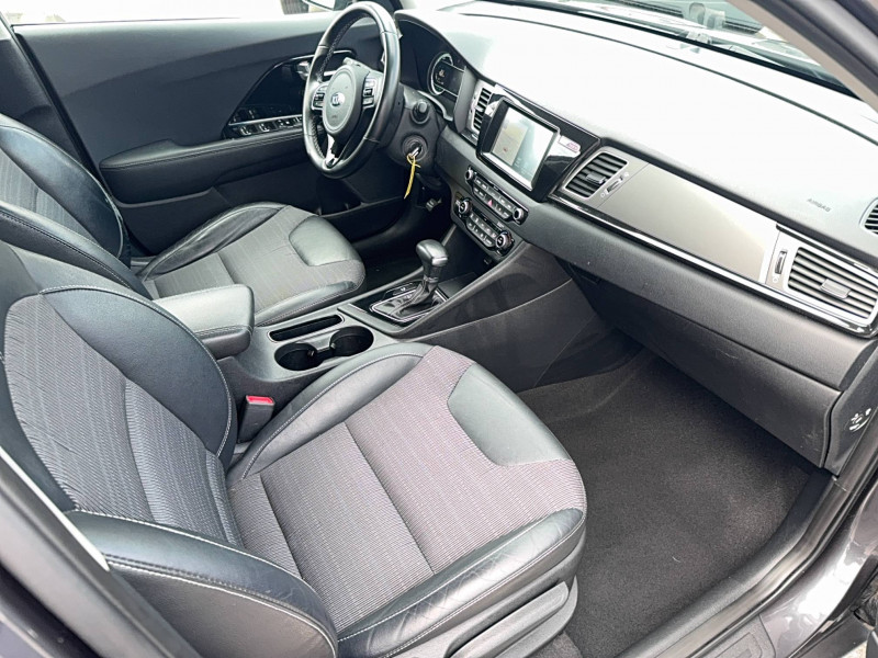ABS avec répartiteur électronique de freinage (EBD) / Accoudoir central AR avec porte-gobelets intégrés / Alerte de vigilance du conducteur (DAA) / Allumage automatique des projecteurs en fonction de la luminosité / Assistance active au maintien de voie (LKAS) / Becquet AR noir laqué intégré au hayon / Boucliers AV et AR couleur carrosserie / Caméra de recul avec lignes de guidage dynamiques / Compartiments de rangement sous le plancher de coffre / Compteur de tableau de bord central LCD TFT SuperVision 4.2" / Connectique audio AUX et USB / Connectique de chargement USB à l'intérieur de l'accoudoir central AV / Crochets de fixation dans le coffre / Diffuseur d'air aux places AR / Direction à assistance électrique asservie à la vitesse / Inserts noir laqué sur la console centrale, les contre-portes et le volant / Kit de dépannage en cas de crevaison / Lève-vitre conducteur AV électrique à fonction séquentielle et anti-pincement / Ouverture de la trappe à essence de l'intérieur du véhicule / Pare-soleil avec miroir de courtoisie illuminé (conducteur et passager) / Pédalier et repose-pieds finition aluminium / Poignées de portes extérieures avec inserts aspect chrome / Poignées de portes extérieures couleur carrosserie / Poignées de portes intérieures finition chrome / Projecteurs AV à technologie dite de "projection" / Purificateur d'air (ioniseur) / Radio/MP3 avec écran LCD 5", 6HP (dont 2 tweeters) et commandes au volant / Rails de toit finition aluminium satiné / Régulateur de couple et assistance au contre-braquage (VSM) / Rétroviseur intérieur anti-éblouissement (technologie électrochrome) / Rétroviseurs extérieurs avec embase noir laqué / Rétroviseurs extérieurs avec répétiteurs de clignotant LED / Rétroviseurs extérieurs couleur carrosserie / Seuils de portes finition aluminium badgés "Niro" / Surlignage des passages de roues en composite noir / Système de fixation ISOFIX sur sièges AR / Système de navigation avec écran couleur tactile 7", fonction ECO, cartographie Europe, mise à jour de la cartographie pendant 7 ans, services TomTom Live pendant 7 ans, compatibilité Androïd Auto / Témoin de niveau bas du liquide de lave-glace / Témoin de non-bouclage des ceintures AV et AR / Verrouillage automatique des portes asservi à la vitesse / Volant et pommeau de levier de vitesses gainés cuir
