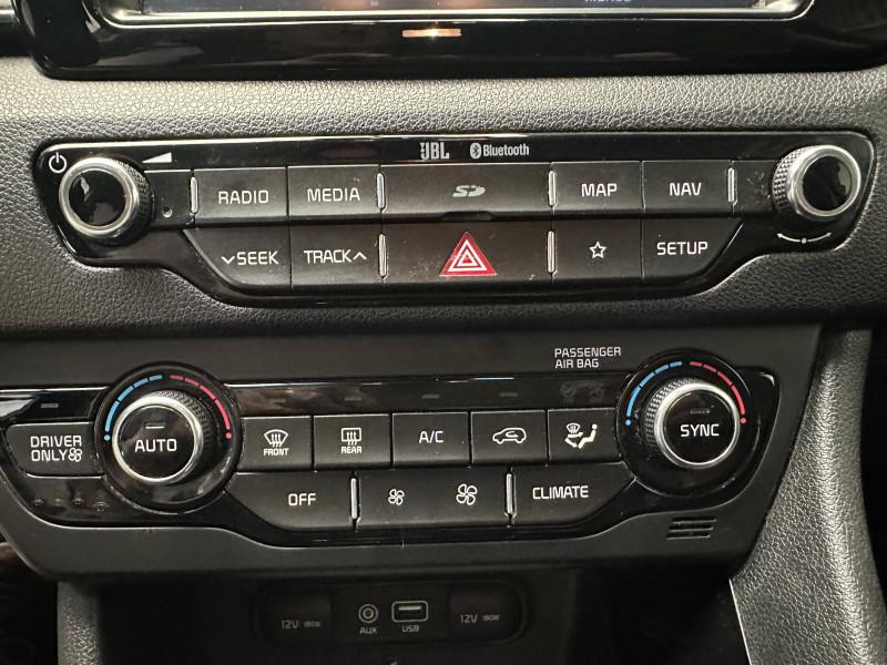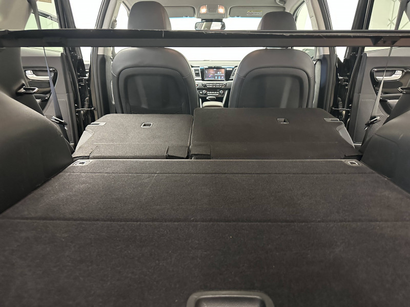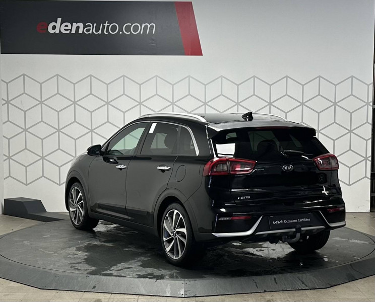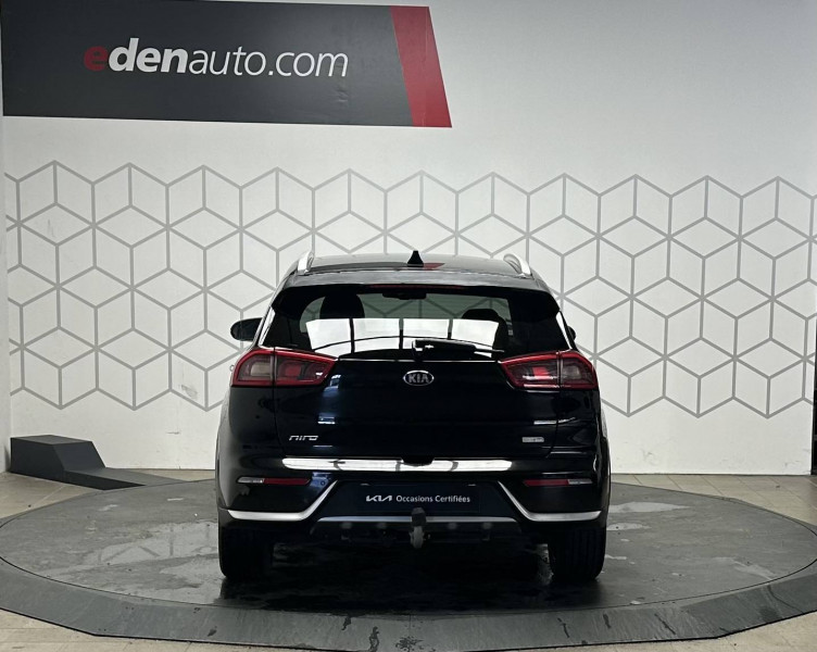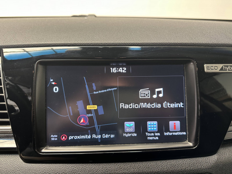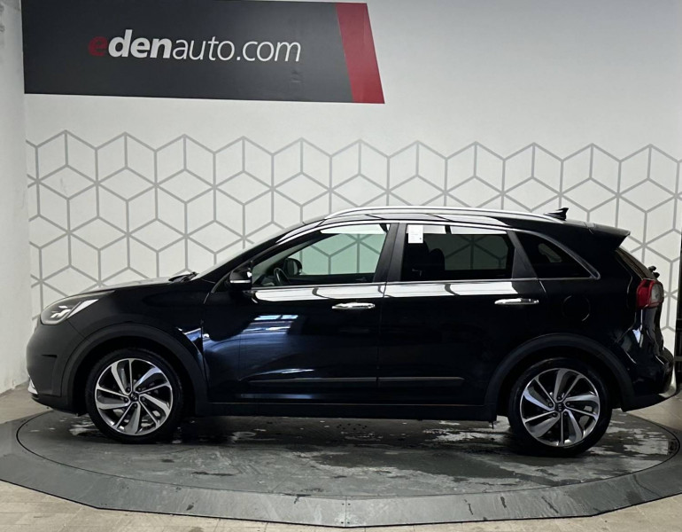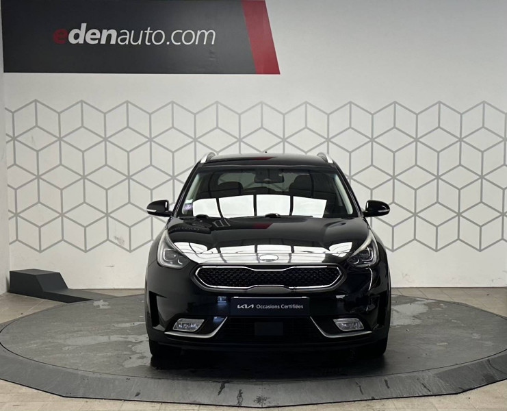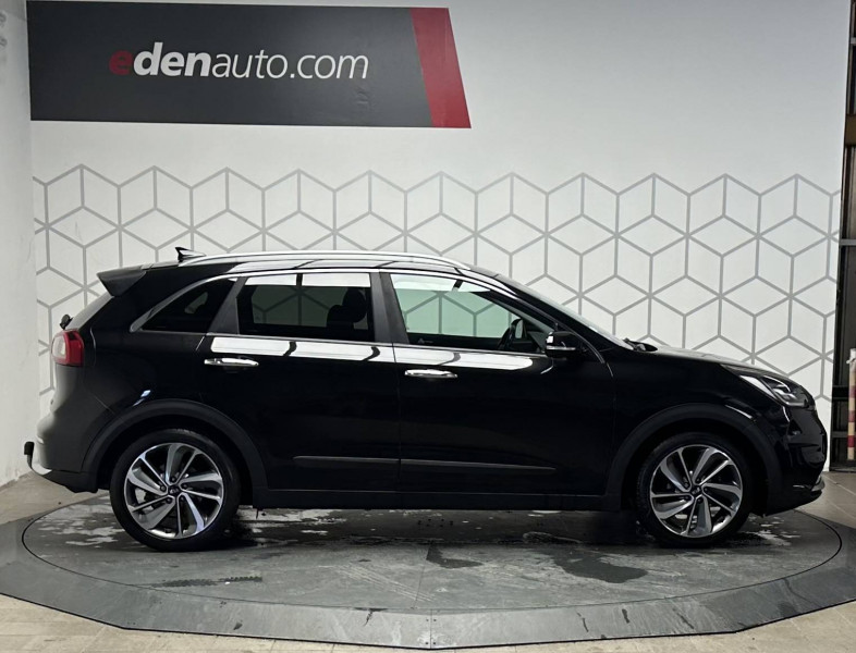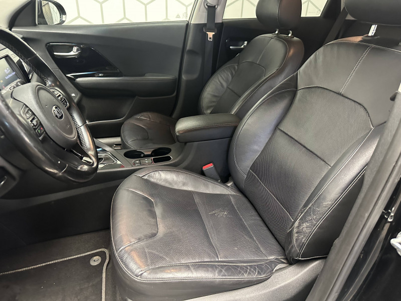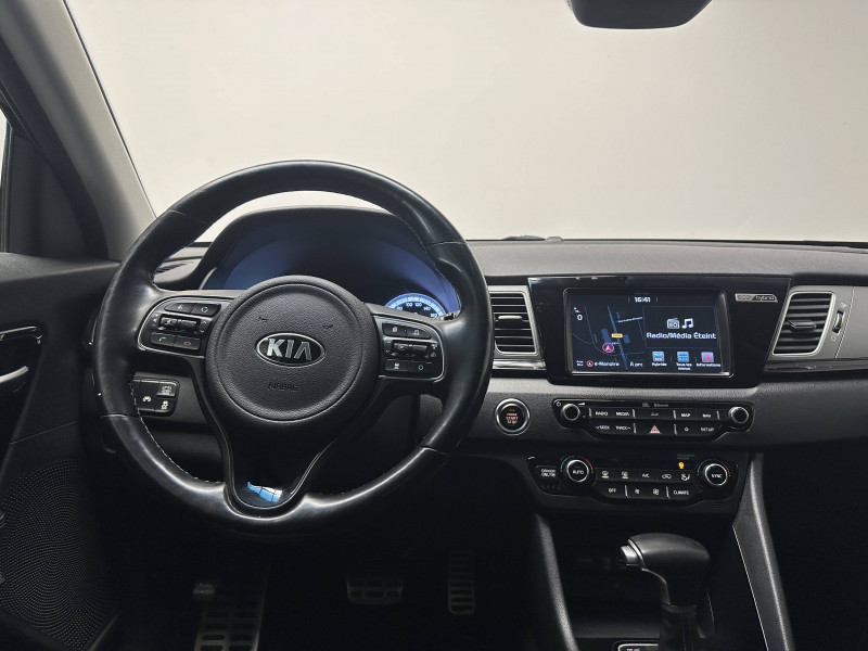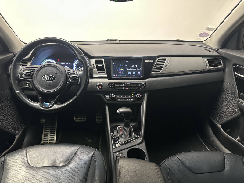 ABS avec répartiteur électronique de freinage (EBD) / Accoudoir central AR avec porte-gobelets intégrés / Alerte de vigilance du conducteur (DAA) / Allumage automatique des projecteurs en fonction de la luminosité / Assistance active au maintien de voie (LKAS) / Becquet AR noir laqué intégré au hayon / Boucliers AV et AR couleur carrosserie / Caméra de recul avec lignes de guidage dynamiques / Compartiments de rangement sous le plancher de coffre / Compteur de tableau de bord central LCD TFT SuperVision 4.2" / Connectique audio AUX et USB / Connectique de chargement USB à l'intérieur de l'accoudoir central AV / Crochets de fixation dans le coffre / Diffuseur d'air aux places AR / Direction à assistance électrique asservie à la vitesse / Inserts noir laqué sur la console centrale, les contre-portes et le volant / Kit de dépannage en cas de crevaison / Lève-vitre conducteur AV électrique à fonction séquentielle et anti-pincement / Ouverture de la trappe à essence de l'intérieur du véhicule / Pare-soleil avec miroir de courtoisie illuminé (conducteur et passager) / Pédalier et repose-pieds finition aluminium / Poignées de portes extérieures avec inserts aspect chrome / Poignées de portes extérieures couleur carrosserie / Poignées de portes intérieures finition chrome / Projecteurs AV à technologie dite de "projection" / Purificateur d'air (ioniseur) / Radio/MP3 avec écran LCD 5", 6HP (dont 2 tweeters) et commandes au volant / Rails de toit finition aluminium satiné / Régulateur de couple et assistance au contre-braquage (VSM) / Rétroviseur intérieur anti-éblouissement (technologie électrochrome) / Rétroviseurs extérieurs avec embase noir laqué / Rétroviseurs extérieurs avec répétiteurs de clignotant LED / Rétroviseurs extérieurs couleur carrosserie / Seuils de portes finition aluminium badgés "Niro" / Surlignage des passages de roues en composite noir / Système de fixation ISOFIX sur sièges AR / Système de navigation avec écran couleur tactile 7", fonction ECO, cartographie Europe, mise à jour de la cartographie pendant 7 ans, services TomTom Live pendant 7 ans, compatibilité Androïd Auto / Témoin de niveau bas du liquide de lave-glace / Témoin de non-bouclage des ceintures AV et AR / Verrouillage automatique des portes asservi à la vitesse / Volant et pommeau de levier de vitesses gainés cuir