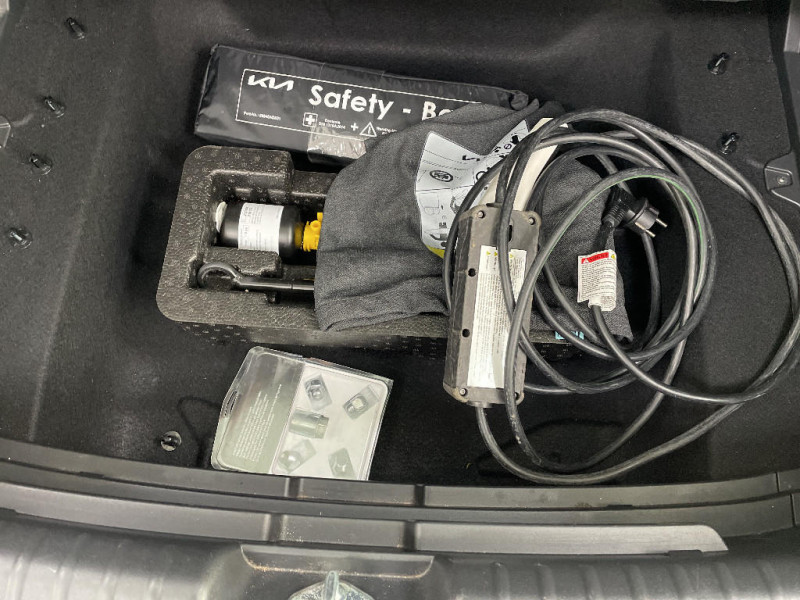 Ecran tactile couleur 10,25'' avec compatibilité via câble USB Android Auto et Apple CarPlay / Peinture Blanc Céleste / Combiné d'instrumentation 100 % digital 10.25'' / Bouclier de protection finition chrome / Moulures de bas de portes et arches de roues contrastées noir laqué / Aérateurs aux places AR / Kia Charge: service dédié de recharge en itinérance (application et carte de recharge) / Eclairage d'ambiance personnalisable / Inserts finition carbone brut sur le tableau de bord / Plancher de coffre modulable / Accès et démarrage mains libres (Smart Key) / Allumage automatique des projecteurs en fonction de la luminosité / Poches aumônières au dos des sièges AV / Climatisation automatique avec fonction "Driver Only" / Caméra de recul avec lignes de guidage dynamiques / Gestion intelligente des feux de route (HBA) / Alerte de vigilance du conducteur (DAW) / Assistance active à la conduite dans les embouteillages (LFA) / Câble de recharge pour prise domestique / Câble de recharge type 2 (T2-T2) 32A / Coques de rétroviseurs couleur noir laqué / Aide au maintien dans la file (LKA) / Programmation de la recharge et de la température de l'habitacle / Prise Combo 2 (CCS) / Lève-vitres électriques AV séquentiel côté conducteur / Assistance active à la conduite sur autoroute (HDA) / Ecran tactile d'infodivertissement 8" avec compatibilité Android Auto et Apple CarPlay / Palettes au volant (modulation de la puissance du freinage régénératif) / Palettes de modulation de la puissance de freinage régénératif avec mode i-Pedal / Modulation automatique de la puissance de freinage régénératif (Smart Regenerative Braking System / Géolocalisation des bornes de recharge (Navigation / Kia Connect) / Lève-vitres AV et AR électriques, séquentiels à l'AV
