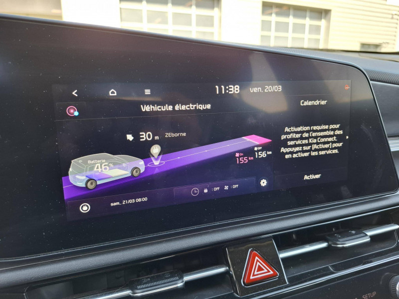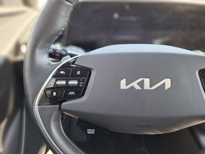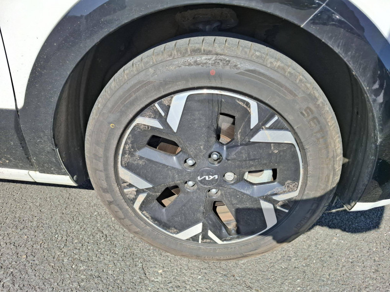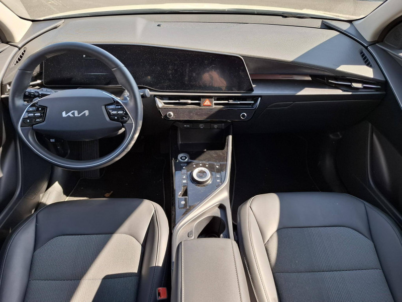 Accès et démarrage mains libres (Smart Key) / Accoudoir central AR avec porte-gobelets intégrés / Accoudoir central AV avec compartiment de rangement / Aérateurs aux places AR / Aide au maintien dans la file (LKA) / Airbags frontaux, latéraux AV, rideaux AV et AR, central AV et genoux côté conducteur / Alerte de vigilance du conducteur (DAW) / Allumage automatique des projecteurs en fonction de la luminosité / Assistance active à la conduite dans les embouteillages (LFA) / Assistance active à la conduite sur autoroute (HDA) / Bouclier de protection finition chrome / Câble de recharge pour prise domestique / Câble de recharge type 2 (T2-T2) 32A / Caméra de recul avec lignes de guidage dynamiques / Climatisation automatique avec fonction "Driver Only" / Combiné d'instrumentation 100 % digital 10.25'' / Coques de rétroviseurs couleur noir laqué / Eclairage d'ambiance personnalisable / Ecran tactile couleur 10,25'' avec compatibilité Android Auto et Apple CarPlay, système de navigation avec cartographie Europe et services connectés Kia Connect Live offerts pendant 7 ans / Géolocalisation des bornes de recharge (Navigation / Kia Connect) / Gestion intelligente des feux de route (HBA) / Inserts finition carbone brut sur le tableau de bord / Kia Charge: service dédié de recharge en itinérance (application et carte de recharge) / Lève-vitres AV et AR électriques, séquentiels à l'AV / Modulation automatique de la puissance de freinage régénératif (Smart Regenerative Braking System 2.0) / Moulures de bas de portes et arches de roues contrastées noir laqué / Palettes au volant (modulation de la puissance du freinage régénératif) / Palettes de modulation de la puissance de freinage régénératif avec mode i-Pedal / Pare-soleil avec miroir de courtoisie illuminé (conducteur et passager) / Peinture Blanc Céleste / Plancher de coffre modulable / Poches aumônières au dos des sièges AV / Prise Combo 2 (CCS) / Programmation de la recharge et de la température de l'habitacle / Rails de toit finition noir laqué / Rétroviseur intérieur électrochrome / Sélecteur de vitesse rotatif électronique (SBW) / Sellerie mixte tissu/cuir artificiel noir fusain / Système audio RDS, 6 HP (dont 2 tweeters), avec commandes au volant / Système DAB (Digital Audio Broadcasting) : système de radiodiffusion sonore numérique / Système de freinage d'urgence autonome avec détection des voitures/piétons/cyclistes (FCA 1.5) avec fonction croisement / Système de navigation avec cartographie Europe et services connectés Kia Connect Live offerts pendant 7 ans / Système de pré-conditionnement de la batterie assurant une température de batterie optimale pour la recharge rapide / Système de téléphonie mains-libres Bluetooth avec reconnaissance vocale et streaming audio / Volant chauffant / Volant en cuir artificiel