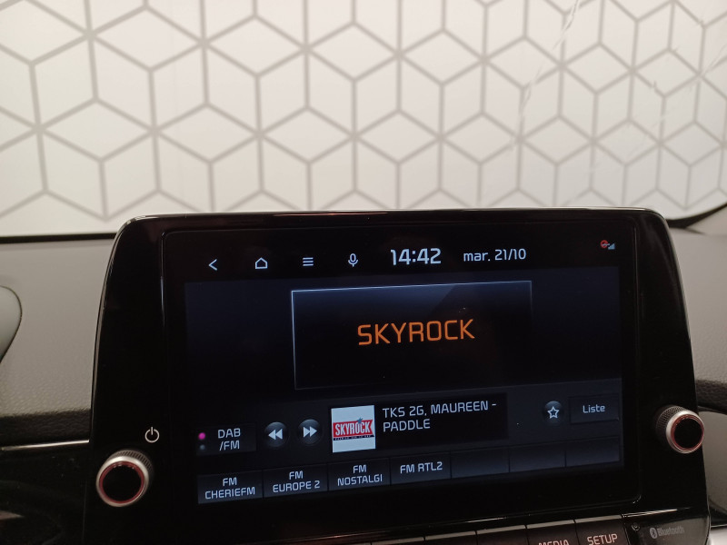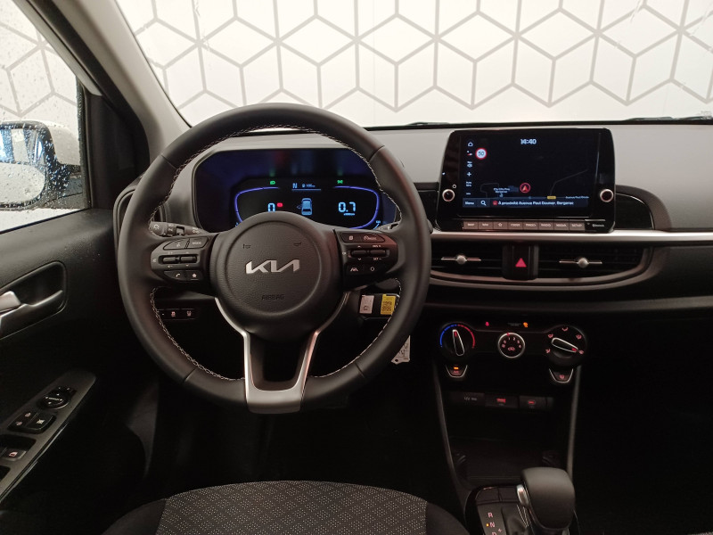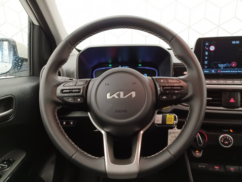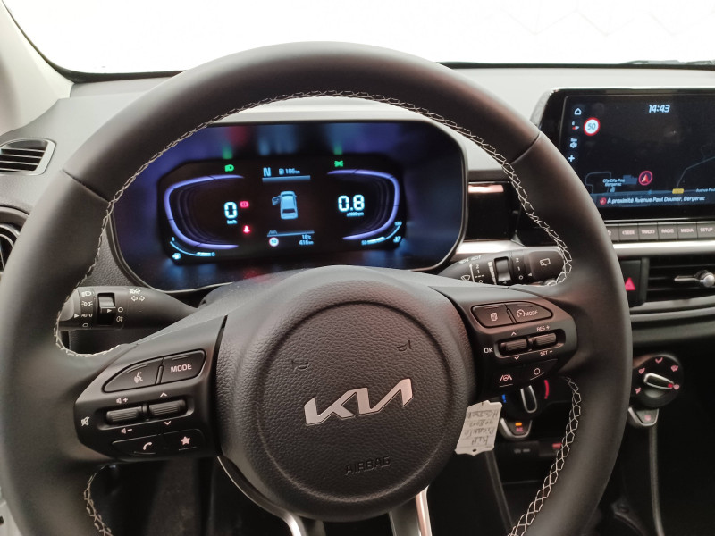 5 places / Aide au maintien dans la file (LKA) / Airbags frontaux conducteur et passager (déconnectable passager) / Alerte de présence des passagers AR / Alerte de vigilance du conducteur (DAW) / Allumage automatique des projecteurs en fonction de la luminosité / Assistance active à la conduite (LFA) / Boîte de vitesse robotisée / Cache-bagages / Ceintures de sécurité AR à 3 points (X3) / Combiné d'instrumentation digital avec écran « Supervision » 4.2'' / Compte-tours / Connectique USB à l'AV / Console centrale AV avec double compartiment de rangement / Contrôle de traction (TCS) / Direction à assistance électrique (MDPS) / Eclairage dans le coffre / Ecran tactile 8" compatible avec Android Auto et Apple CarPlay / Inserts finition aluminium sur la planche de bord / Jantes en acier 14" avec enjoliveurs / Kit de réparation anti-crevaison / Lève-vitres AV électriques avec descente/montée à impulsion côté conducteur / Pare-soleil avec miroir de courtoisie (conducteur et passager) / Plafonnier à l'AV / Poche aumônière au dos du siège conducteur et du passager / Poignées de portes extérieures couleur carrosserie / Poignées de portes intérieures finition aluminium / Pommeau de levier de vitesse en matière synthétique / Prise 12 V sur la console centrale AV / Reconnaissance des panneaux de limitation avec régulation de vitesse (ISLA) / Rétroviseurs extérieurs couleur carrosserie / Services télématiques Kia Connect offerts pendant 7 ans / Système audio 6 HP dont 2 tweeters AV / Système de freinage ABS avec répartiteur électronique de freinage EBD / Système de freinage d'urgence autonome avec détection des voitures, piétons et cyclistes (FCA) / Système de gestion intelligente des feux de route (HBA) / Système de navigation avec cartographie Europe, services connectés Kia Connect Live et services télématiques Kia Connect offerts pendant 7 ans / Système de téléphonie mains-libres Bluetooth avec reconnaissance vocale et streaming audio / Système ISOFIX à 3 points d'ancrage sur sièges latéraux AR / Volant en matière synthétique