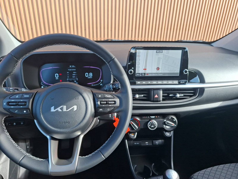 Aide au maintien dans la file (LKA) / Airbags frontaux conducteur et passager (déconnectable passager) / Alerte de présence des passagers AR / Alerte de vigilance du conducteur (DAW) / Allumage automatique des projecteurs en fonction de la luminosité / Assistance active à la conduite dans les embouteillages (LFA) / Boîte de vitesse manuelle 5 / Cache-bagages / Ceintures de sécurité AR à 3 points (X3) / Combiné d'instrumentation digital avec écran « Supervision » 4.2'' / Compte-tours / Configuration 5 places / Connectique USB à l'AV / Console centrale AV avec double compartiment de rangement / Contrôle de traction (TCS) / Direction à assistance électrique (MDPS) / Eclairage dans le coffre / Ecran tactile 8" compatible avec Android Auto et Apple CarPlay / Inserts finition aluminium sur la planche de bord / Jantes en acier 14" avec enjoliveurs / Kit de dépannage en cas de crevaison / Lève-vitres AV électriques avec descente/montée à impulsion côté conducteur / Pare-soleil avec miroir de courtoisie (conducteur et passager) / Plafonnier à l'AV / Poche aumonière au dos du siège conducteur / Poignées de portes extérieures couleur carrosserie / Poignées de portes intérieures finition aluminium / Pommeau de levier de vitesses gainé cuir / Prise 12 V sur la console centrale AV / Reconnaissance des panneaux de limitation avec régulation de vitesse (ISLA) / Rétroviseurs extérieurs couleur carrosserie / Services télématiques Kia Connect offerts pendant 7 ans / Système audio 6 HP dont 2 tweeters AV / Système de freinage ABS avec répartiteur électronique de freinage EBD / Système de freinage d'urgence autonome avec détection des voitures, piétons et cyclistes (FCA) / Système de gestion intelligente des feux de route (HBA) / Système de navigation avec cartographie Europe, services connectés Kia Connect Live et services télématiques Kia Connect offerts pendant 7 ans / Système de téléphonie mains-libres Bluetooth avec reconnaissance vocale et streaming audio / Système ISOFIX à 3 points d'ancrage sur sièges latéraux AR / Volant en matière synthétique