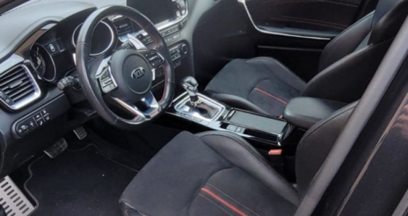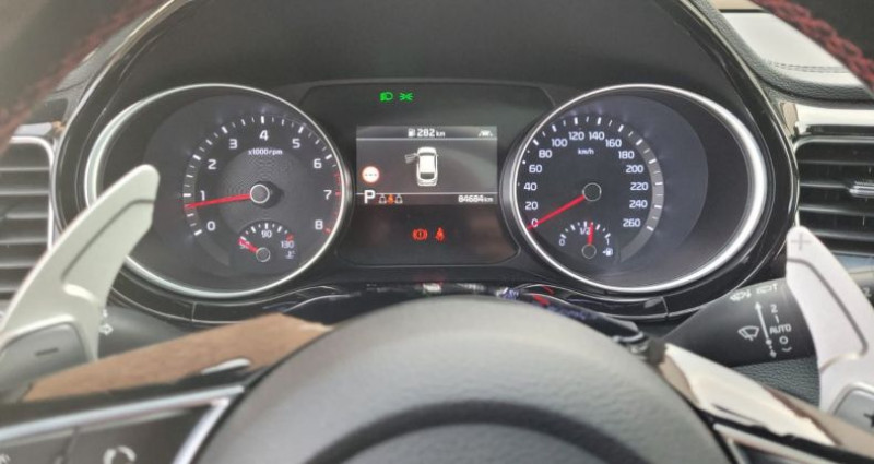 OPTIONS ET ÉQUIPEMENTS : Audio - Télécommunications : - Prise USB à charge accélérée sur la partie inférieure de la planche de bord - Radio MP3, 6 haut-parleurs (dont 2 tweeters), avec commandes au volant Conduite : - Allumage automatique des projecteurs - Assistance au démarrage en côte - Capteur de pluie - Frein de stationnement électronique (EPB) - Limiteur de vitesse - Palettes de changement de rapports au volant Couleur : - Peinture métallisée Extérieur : - Caméra de recul avec lignes de guidage actives - Compartiments de rangement sous le plancher de coffre - Double sortie d'échappement - Feux arrière à LED - Feux de jour à LED - Hayon à ouverture électrique mains-libres - Jantes en alliage 18 pouces - Ligne de vitrage chromée - Projecteurs Full LED - Radars de stationnement arrière - Rétroviseurs extérieurs rabattables électriquement avec répétiteur de clignotant LED - Vitres arrière et lunette arrière surteintées Intérieur : - Accoudoir central avant coulissant avec coffre de rangement - Banquette arrière rabattable 40/20/40 - Climatisation automatique bi-zone - Direction à assistance électrique asservie à la vitesse - Lève-vitres électriques avant et arrière, séquentiels et antipincement - Ordinateur de bord - Pare-soleil avec miroir de courtoisie illuminé conducteur et passager - Poches aumônières au dos des sièges avant - Pommeau de levier de vitesses en cuir - Pédalier et repose-pied aspect aluminium - Réglages lombaires électriques sur sièges AV - Rétroviseur intérieur électrochrome - Sellerie GT cuir/suédine noir avec surpiqûres rouges - Siège conducteur réglable en hauteur - Siège conducteur à réglages électrique, 4 axes, avec mémorisation (2 positions) - Siège passager avant réglable en hauteur - Sièges arrières chauffants - Sièges avant chauffants - Spots de lecture avant et arrière - Verrouillage automatique des portières en roulant - Volant chauffant - Volant cuir avec méplat - Volant réglable en hauteur et en profondeur Pack : - Appuies-tête avant et arrière règlables en hauteur - Coques de rétroviseurs noir laqué - Diffuseur arrière GT - Extracteurs d'air arrière - Ouverture et démarrage sans clé ?Smart Key? - Poignées de portes intérieures finition chrome satiné - Rétroviseurs extérieurs électriques et dégivrants - Système de fixation ISOFIX sur sièges arrière - Systèmes avancés d'aide à la conduite - Témoin d'alerte pour niveau de liquide lave-glace Sécurité : - ABS avec répartiteur électronique de freinage (EBD) - Airbags frontaux, latéraux et rideaux - Assistance active au maintien de voie - Assistance au freinage d'urgence - Contrôle de pression des pneus ( TPMS ) - Kit de dépannage en cas de crevaison - Reconnaissance des panneaux de limitation de vitesse - Système de surveillance des angles morts Autres équipements et informations : - Accoudoir central arrière avec porte-gobelets intégrés - Alerte vigilance conducteur - Appuis-tête avant réglables en inclinaison - Bacs de rangement dans les contre-portes avant et arrière - Becquet arrière avec troisième feu de stop à LED - Compteur de tableau de bord rétro-éclairé ?Supervision? avec écran couleur TFT LCD 4,2? - Connectique audio AUX et USB - Contrôle électronique de la trajectoire (ESC) - Désembuage automatique du pare-brise - Détecteur de trafic arrière - Eclairage dans le coffre - Ecran tactile couleur 10.25, système de navigation avec cartographie Europe, services connectés TomTom LIVE offerts pendant 7 ans, compatibilité Android Auto et Apple CarPlay - Grille de calandre noir laqué avec entourage chrome fumé - Inserts noir laqué au niveau de la console centrale et des ouïes d'aération du tableau de bord - Moulures de bas de portes avec insert rouge - Prise 12 volts sur la partie inférieure de la planche de bord - Système audio premium JBL comprenant 8 hauts-parleurs dont 2 tweeters, un caisson de basse et un amplificateur externe - Système de gestion intelligente des feux de route (HBA) - Système de téléphonie mains-libres Bluetooth avec reconnaissance vocale et fonction streaming audio (selon compatibilité du téléphone) - Système télématique UVO Connect offert pendant 7 ans - Sélecteur de conduite DRIVE MODE (Normal ou Sport) - Toit vitré ouvrant / entrebâillant électriquement, avec rideau occultant électrique