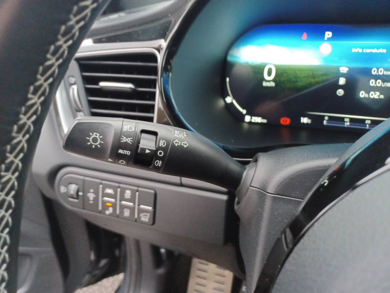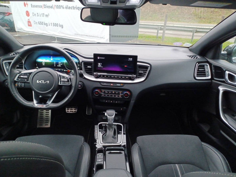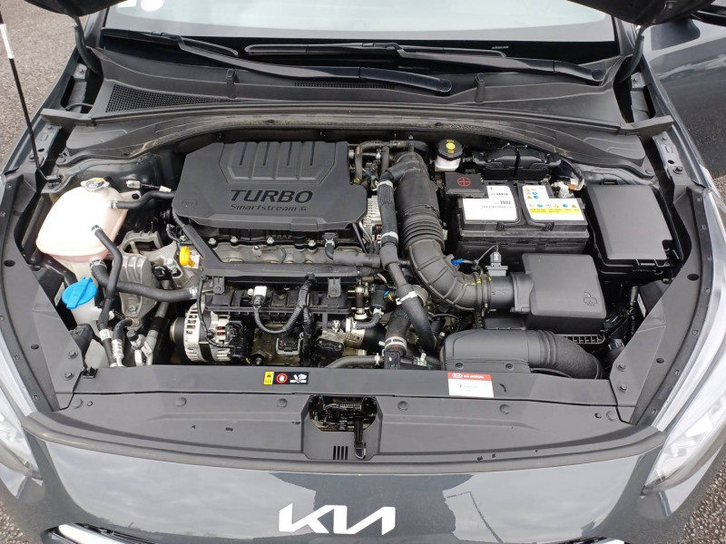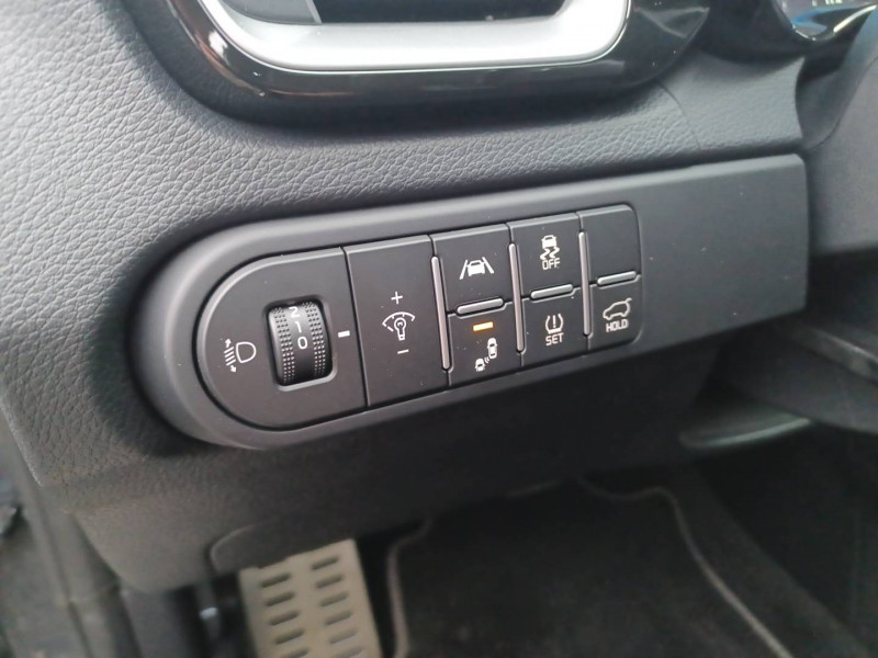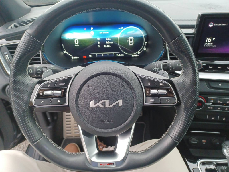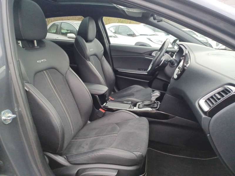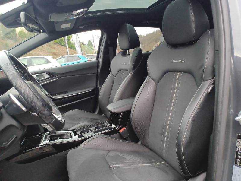 ABS avec répartiteur électronique de freinage (EBD) / Accoudoir central AR avec porte-gobelets intégrés / Accoudoir central AV coulissant avec compartiment de rangement / Aide au maintien dans la file (LKA) / Alerte de vigilance du conducteur (DAW) / Allumage automatique des projecteurs en fonction de la luminosité / Assistance active à la conduite dans les embouteillages (LFA) / Assistance active au maintien de voie (LKA) / Avertissement de sécurité de sortie du véhicule (SEW) / Bacs de rangement dans les contre-portes AV et AR / Becquet AR avec troisième feu stop LED intégré / Caméra de recul avec lignes de guidage dynamiques / Combiné d'instrumentation 100 % digital 12.3'' / Compartiment range-lunettes / Compartiments de rangement sous le plancher de coffre / Connectique audio USB / Contour de calandre aspect chrome satiné et application noir laqué sur grille de calandre / Coques de rétroviseurs couleur noir laqué / Direction à assistance électrique asservie à la vitesse / Eclairage dans le coffre / Ecran tactile couleur 10.25", système de navigation avec cartographie Europe et services connectés Kia LIVE offerts pendant 7 ans, compatibilité Android Auto et Apple CarPlay / Extracteurs d'air pour les places AR / Hayon AR électrique à ouverture mains-libres / Inserts noir laqué au niveau de la console centrale et des ouïes d'aération du tableau de bord / Kit de dépannage en cas de crevaison / Lève-vitres AV et AR électriques, séquentiels et anti-pincement / Ligne de vitre chromée / Moulures de bas de portes avec insert gris / Ouverture et démarrage sans clé "Smart Key" / Pare-soleil avec miroir de courtoisie illuminé (conducteur et passager) / Pédalier et repose-pieds aspect aluminium / Poches aumonières au dos des sièges AV / Poignées de portes intérieures finition chrome satiné / Pommeau de levier de vitesses gainés cuir perforé / Prise 12 V sur la partie inférieure de la planche de bord / Prise USB à charge accélérée sur la partie inférieure de la planche de bord / Rétroviseur intérieur électrochromatique (ECM) / Sélecteur de conduite DRIVE MODE (Normal ou Sport) / Sellerie GT-line cuir/suédine noir avec surpiqûres grises / Siège conducteur à réglages électrique, 4 axes, avec mémorisation / Sièges AV à réglage lombaire électrique / Spots de lecture AV et AR / Système anti-collision avec détection des angles morts (BCA) / Système de détection de trafic AR (RCCW) / Système de fixation ISOFIX sur sièges AR / Système de freinage d'urgence autonome avec détection des voitures et des piétons (FCA) / Système de gestion automatique des feux de route (HBA) / Système de téléphonie mains libres Bluetooth avec commandes au volant avec reconnaissance vocale (téléphone non fourni) / Système Stop & Go de coupure du moteur à l'arrêt (ISG) / Système UVO Connect - services télématiques offerts pendant 7 ans / Témoin de niveau bas du liquide de lave-glace / Toit vitré, ouvrant / entrebâillant électriquement, avec rideau occultant électrique et éclairage intérieur à LED / Verrouillage automatique des portières en roulant / Volant chauffant / Volant et pommeau de levier de vitesses gainés cuir