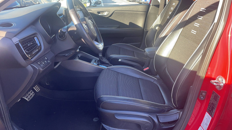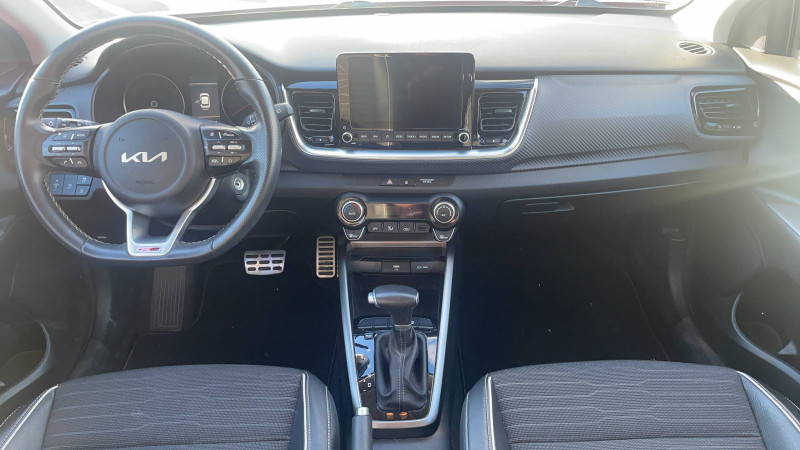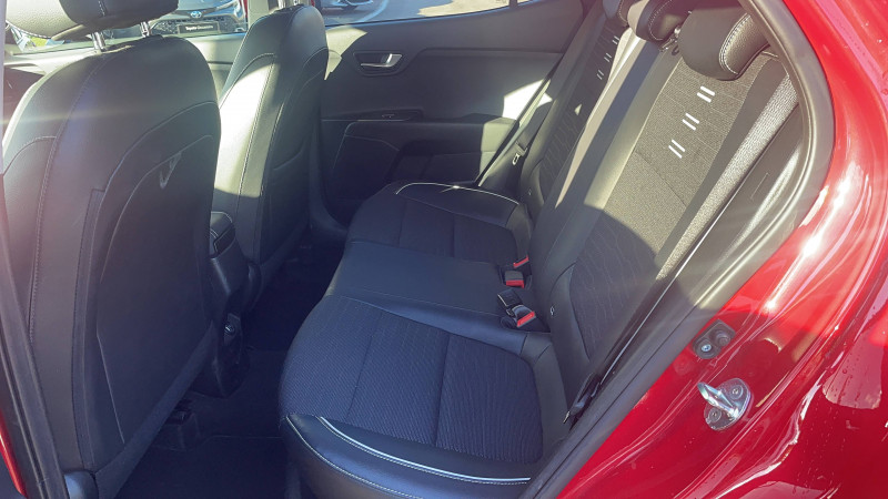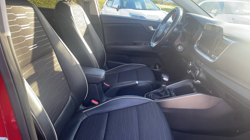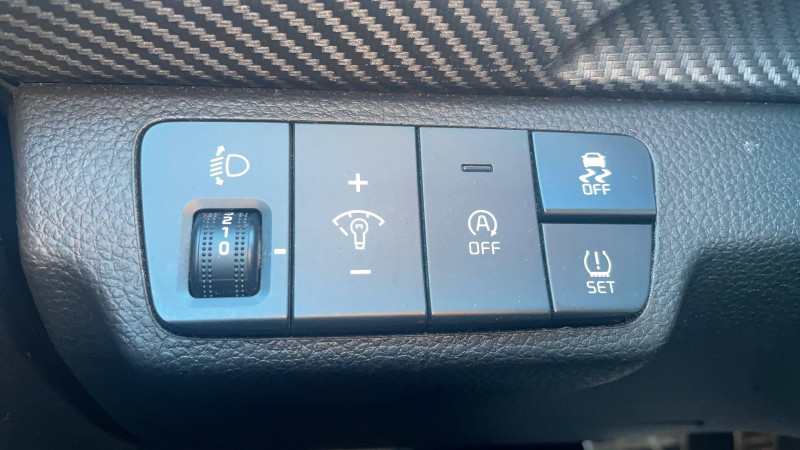 ABS avec répartiteur électronique de freinage (EBD) / Aide au maintien dans la file (LKA) / Airbags frontaux conducteur et passager (déconnectable passager) / Alerte de vigilance du conducteur (DAW) / Allumage automatique des projecteurs en fonction de la luminosité / Antenne de toit type "aileron de requin" / Assistance active à la conduite (LFA) / Boucliers AV/AR / Cache-bagages / Calandre avec application noir laqué avec effet "formes de diamants" et contour finition aluminium / Caméra de recul avec lignes de guidage dynamiques / Ceintures de sécurité AR à 3 points (X3) / Combiné d'instrumentation avec écran "Supervision" 4.2'' / Compartiment range-lunettes / Connectique de chargement USB au dos de la console centrale / Connectique USB à l'AV / Console centrale AV avec accoudoir central et compartiment de rangement intégré / Console centrale AV avec double compartiment de rangement / Console centrale AV avec double porte-gobelets / Diffuseur AR avec double sortie d'échappement esthétique / Direction assistée électrique (MDPS) / Eclairage dans le coffre / Ecran tactile 8'' compatible Android Auto et Apple CarPlay / Insert finition carbone sur la planche de bord / Inserts aluminium satiné au niveau de la console centrale / Inserts de prise d'air noir laqué (ou reprenant la couleur du toit en cas de peinture bi-ton) sur le bouclier AV / Inserts noir laqué au niveau des ouïes d'aération du tableau de bord / Lève-vitres AR électriques verrouillables par le conducteur / Lève-vitres AV électriques avec descente/montée à impulsion côté conducteur / Ligne de vitres chromée / Pare-soleil avec miroir de courtoisie illuminé (conducteur et passager) / Pédalier finition métal / Plafonnier à l'AV / Poche aumonière au dos du siège passager AV / Poignées de portes extérieures couleur carrosserie / Poignées de portes intérieures finition chrome satiné / Pommeau de levier de vitesses gainé cuir / Prise 12 V sur la console centrale AV / Projecteurs AV à technologie dite de "projection" avec éclairage statique d'intersection / Rails de toit finition aluminium satiné / Régulateur de couple et assistance au contre-braquage (VSM) / Rétroviseur intérieur avec réglage manuel jour/nuit / Sélecteur de mode de conduite (Normal, Eco, Sport) / Sellerie cuir de synthèse/tissu noir avec inserts et surpiqûres blancs / Surlignage des passages de roues en composite noir / Système audio avec 6 HP dont 2 tweeters AV / Système de contrôle vectoriel du couple (TVBB) / Système de fixation ISOFIX sur sièges AR latéraux / Système de freinage d'urgence autonome avec détection des piétons et des cyclistes (FCA) / Système de gestion intelligente des feux de route (HBA) / Système de navigation avec cartographie Europe et services connectés Kia Live offerts pendant 7 ans / Système de téléphonie mains-libres Bluetooth avec reconnaissance vocale et streaming audio / Système de verrouillage automatique des portes en roulant / Système Kia Connect - services télématiques offerts pendant 7 ans / Volant à méplat gainé de cuir et perforé