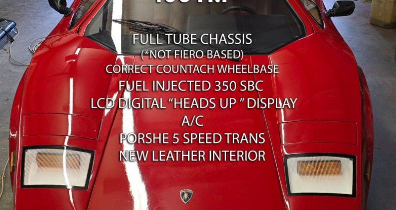 - Année : 1990 - Type : Replica Lamborghini Countach - Moteur : 350 Chevrolet, 400 ch - Boîte de vitesses : Porsche 5 vitesses - Intérieur : Cuir neuf, couleur brun - Équipement : Caméra de recul, Stereo Alpine, Affichage de vitesse sur écran de tableau de bord - État extérieur : Peinture en bon état (8 sur 10), 2 éclats notables - État intérieur : Excellent (9 sur 10) - Gauges et éclairage fonctionnels, sauf jauge d'essence - Localisation : Proche de Columbia SC, États-Unis. Provenance : South Carolina. Disponibilité : environ 7 semaines, clés en main. 62 500 € tout compris (importation, taxes, procédure d'immatriculation). Annonce publiée le 17/12/2025
