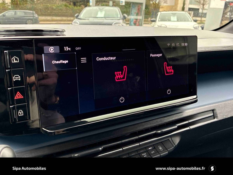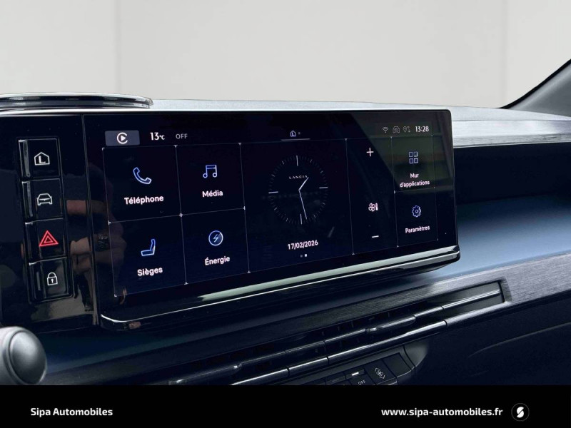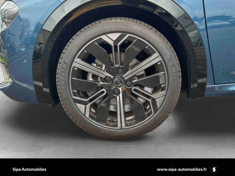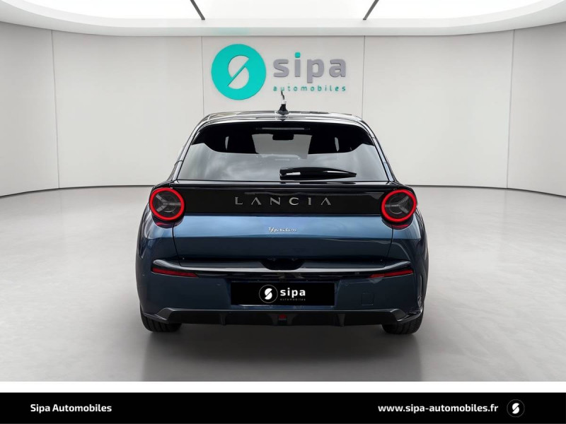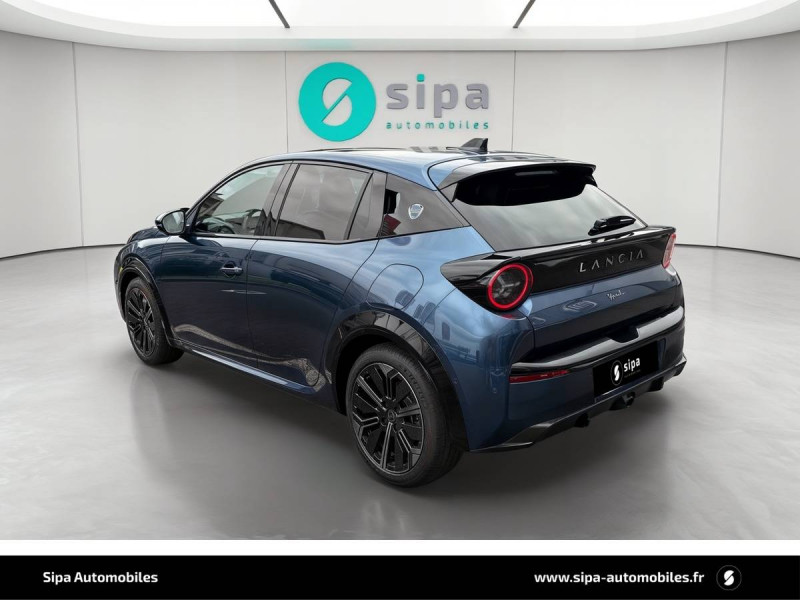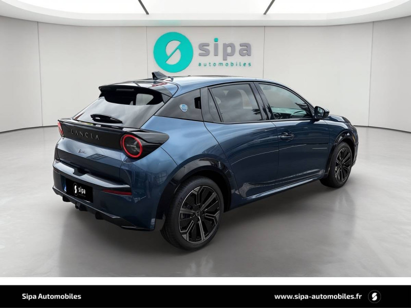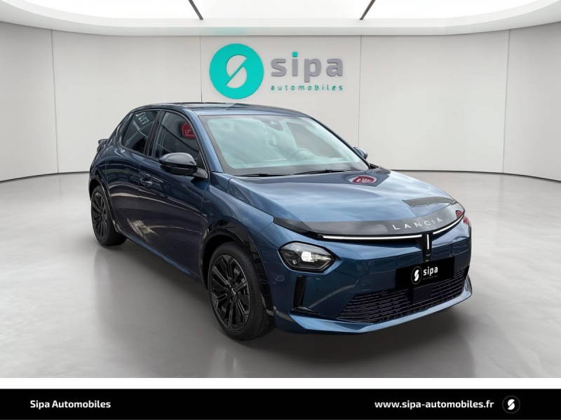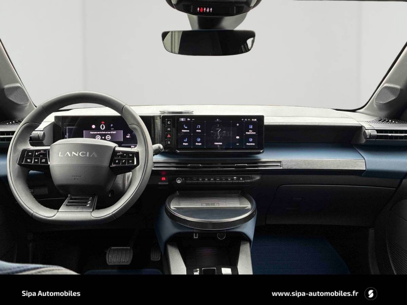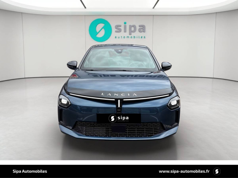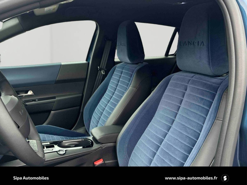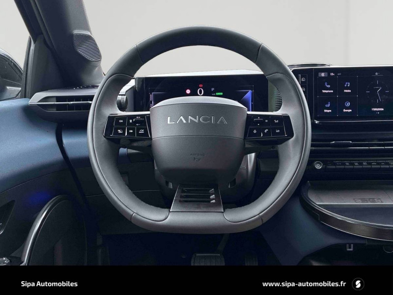 6 airbags (conducteur et passagers AV, latéraux, rideaux, genoux conducteur) / Alerte de collision AV (FCW) / Assistant de maintien dans la voie (LKA) / Assistant de vitesse intelligent (ISA) / Boîte automatique 1 rapports / Câble de recharge Type 2 Mode 3 / Capteur de pression des pneumatiques TPMS / Chargeur embarqué 7 kW (OBC) / Chargeur induction pour smartphone / Conduite autonome de niveau 2 / Contours de vitres, arches de roues et calandre glossy black / Contrôl de traction / Coques de rétroviseurs noires / Détecteur d'angles morts / Détection de fatigue du conducteur / Eclairage d'ambiance 8 couleurs / Ecran central tactile 10,25" avec système d'infodivertissement SALA / Freinage d'urgence autonome reconnaissance piétons & cyclistes / Gestion automatique des feux de croisement et feux de route / Jantes 17" Diamante Scuro 205/45 R17 H 88 / Pompe à chaleur / Prises USB type C x2 AR / Prise USB type C AV / Projecteurs Full-Led avec signature lumineuse Calice / Rétroviseurs intérieur électrochrome / Sellerie Velours Bleu Lancia / Siège conducteur électrique avec réglage des lombaires / Siège conducteur et passager chauffants / Système d'appel d'urgence automatique e-Call / Tableau de bord 10,25" TFT / Vitres AR privatives