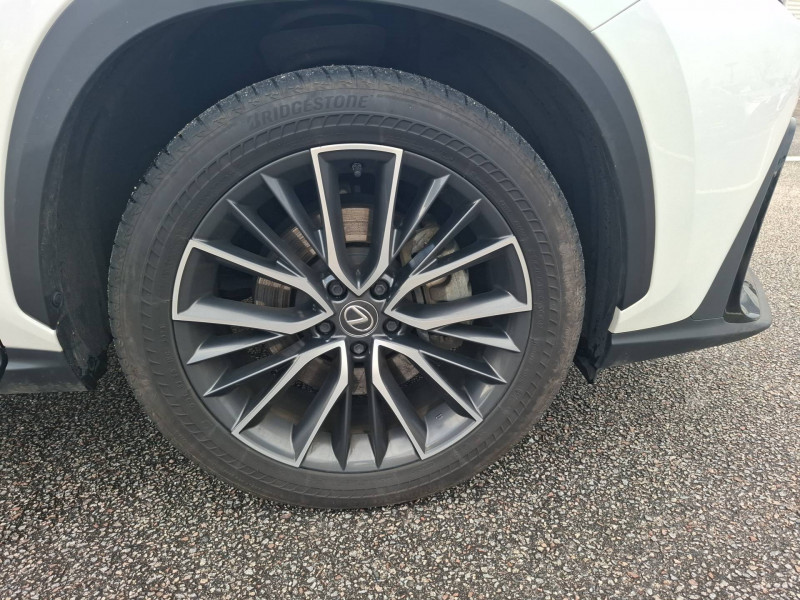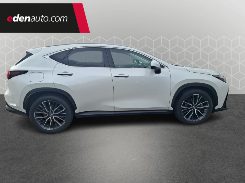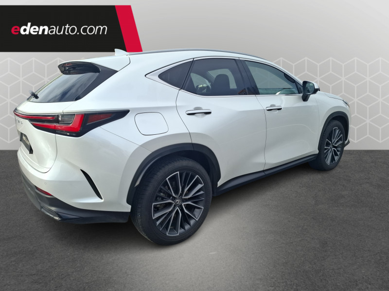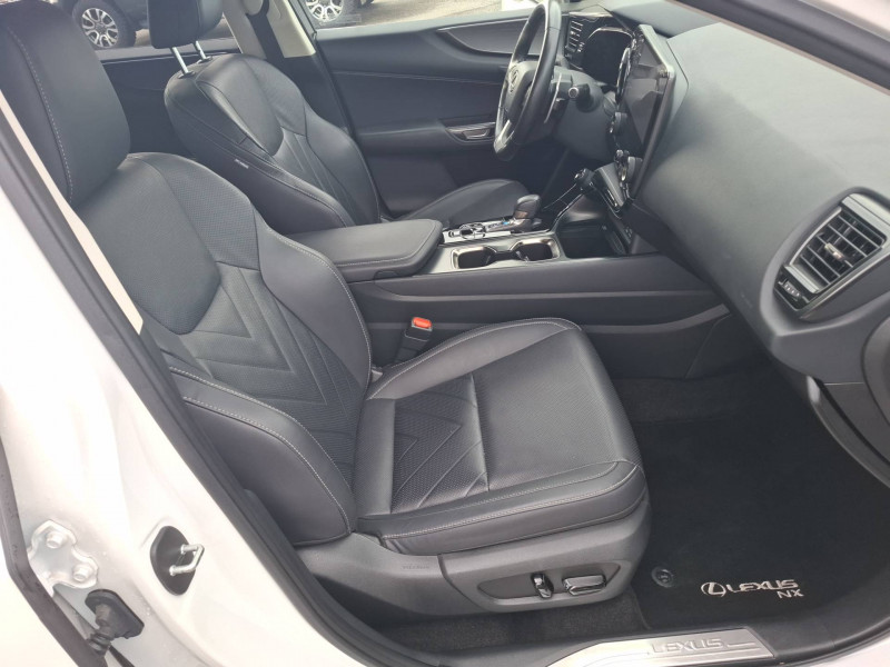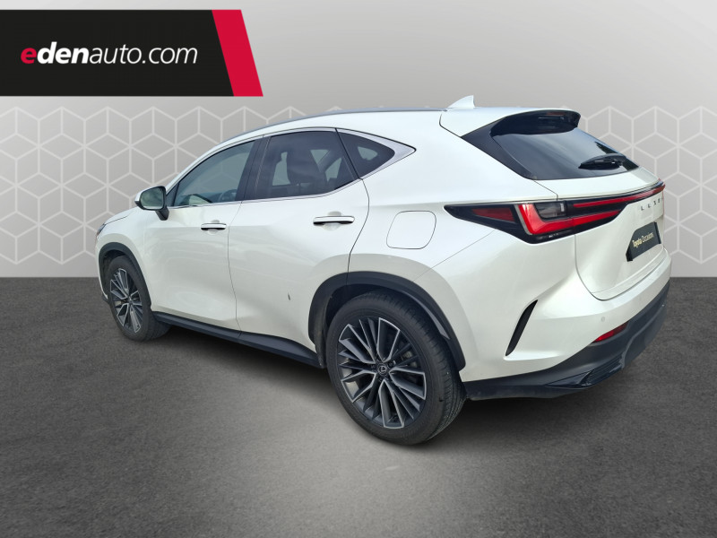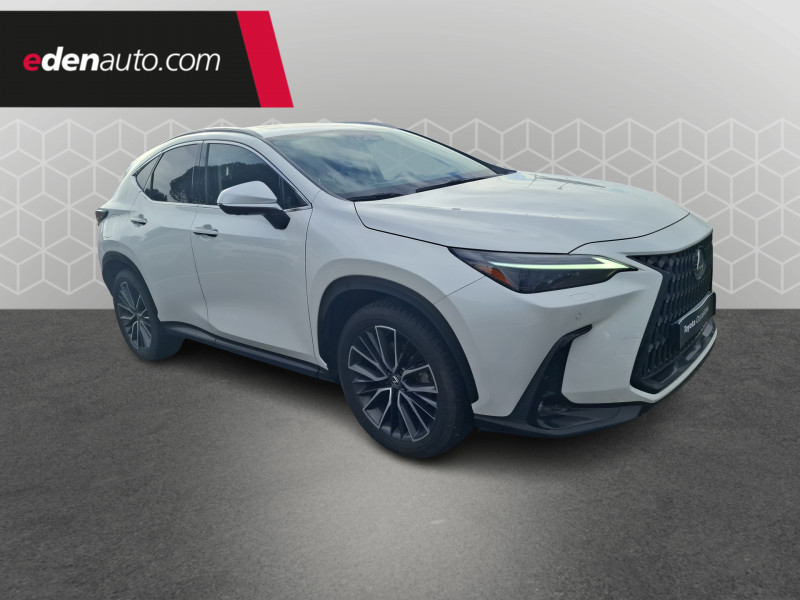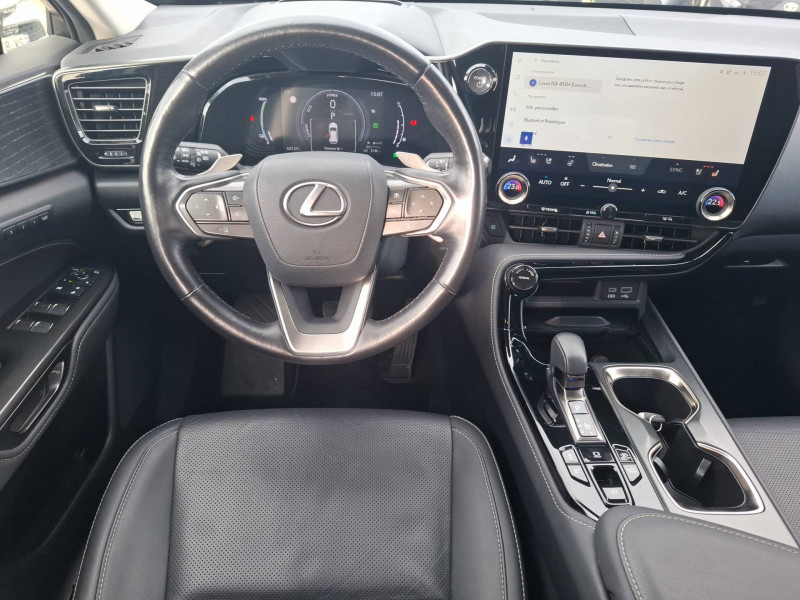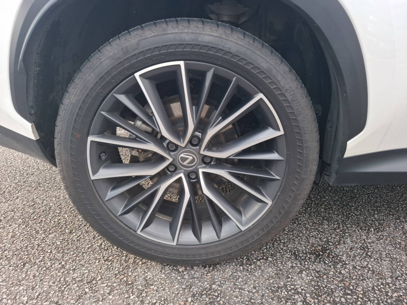 Accès et sortie facilités (siège conducteur et volant) / Antenne de toit type aileron de requin / Appuie-tête AR à 2 réglages manuels / Appuie-têtes AV à 2 réglages manuels / Avertisseur sonore piétons (AVAS) / Banquette AR rabattable manuellement 60/40 / Bouclier AV avec calandre trapézoïdale chromée / Bouton de désactivation de l'airbag (passager AV) / Câble de recharge (5 m) pour prise domestique (type 2/mode 2) / Câble de recharge (7,5 m) pour prise type 2/mode 3 / Cache-bagages rabattable manuellement / Capteurs de stationnement AV et AR et AR intelligents (ICS) / Chargeur embarqué 6,6 kW / Chargeur sans fil pour Smartphone / Clé au format électronique (Key Card) / Climatisation automatique bi-zone avec recirculation automatique, S-Flow, capteur d'humidité / Commandes tactile au volant (audio, affichage, téléphone, reconnaissance vocale, DRCC, LTA) / Connectivité audio et téléphonie mobile Bluetooth / Connectivité Lexus Link Premium (gratuit pendant 4 ans) / Console centrale AV avec 2 ports USB de type A et C et AR de type C / Contrôle de stabilité anti-roulis pour remorque / Eclairage d'ambiance multicolore (64 couleurs) / Electrified Program / Feux de détresse automatiques (AFRHL) / Feux de route adaptatifs (AHS) / Feux de stop actifs / Filtre à air avec extracteur de pollen et désodorisant / Gants et serviettes Lexus / Hayon électrique avec fonction de mémorisation de la hauteur / Hayon électrique avec ouverture et fermeture au pied / Inserts Bois Noir / Jantes en alliage 20" à 20 branches avec pneumatiques Runflat 235/50 R20 / Lexus Safety System + 3 : Lecture automatique des panneaux de circulation (RSA), Régulateur de vitesse dynamique (DRCC) avec réduction de la vitesse en courbe, Système de maintien dans la file de circulation avancé (LTA), Système de sécurité pré-collision (PCS) avec détection des intersections (ITA) et correction active de trajectoire (ESA) / Lunette AR surteintées / Mode EV (100 % électrique) / Mode EV / Hybride automatique / Mode Trail / Moniteur d'angle mort (BSM) avec avertisseur de circulation AR intelligent (RCTAB) / Pack Design / Pack LSS+Extended / Plaques de seuils de portes AV en acier avec logo LEXUS / Points d'ancrage i-Size aux places latérales AR / Points d'ancrage ISOFIX aux places latérales AR / Pommeau de levier de vitesse gainé de cuir / Porte-lunettes / Prétensionneurs de ceintures de sécurité AV et aux places latérales AR / Projecteurs AV quadri-LED à triple lentilles / Rails de toit noirs / Rappel visuel et sonore de non-bouclage des ceintures de sécurité / Rétroviseurs extérieurs électrochromatiques (atténuation automatique de la brillance) / Sac de rangement de câbles / Safe Exit Assist (SEA)- assistant de sortie du véhicule / Sélecteur de mode de conduite (ECO, NORMAL, SPORT) / Services connectés Lexus Link Hybride Rechargeable : Localisateur de bornes de recharge publique, Niveau de charge de la batterie, Programmation de la charge / Siège conducteur, volant et rétroviseurs extérieurs à réglages mémorisables (3 présélections) / Soutien lombaire (4 positions) pour le conducteur / Système antivol, antidémarrage électronique, capteur d'intrusion et alarme sonore / Système audio Pioneer à 10 HP / Système d'appel d'urgence (eCall) / Système de freinage, stabilité, direction et d'antipatinage : ABS, BAS, EBD, ECB-R, EPB, EPS,TRC,VSC / Système de navigation embarqué Lexus Link Pro avec écran central tactile 14" volant réglable électriquement / Système de navigation Lexus Link via le cloud / Système d'ouverture/fermeture électronique des portes (e-Latch) / Système multimédia Lexus Link Pro : Apple CarPlay sans fil et Android Auto filaire, Ecran central tactile 14", Services connectés Lexus Link / Transmission 4WD / Vision panoramique à 360° (PVM) avec détection AR des piétons / Vitres latérales AR / Vitres latérales AV acoustiques et anti-UV / Volant à 3 branches gainé de cuir / Volant chauffant