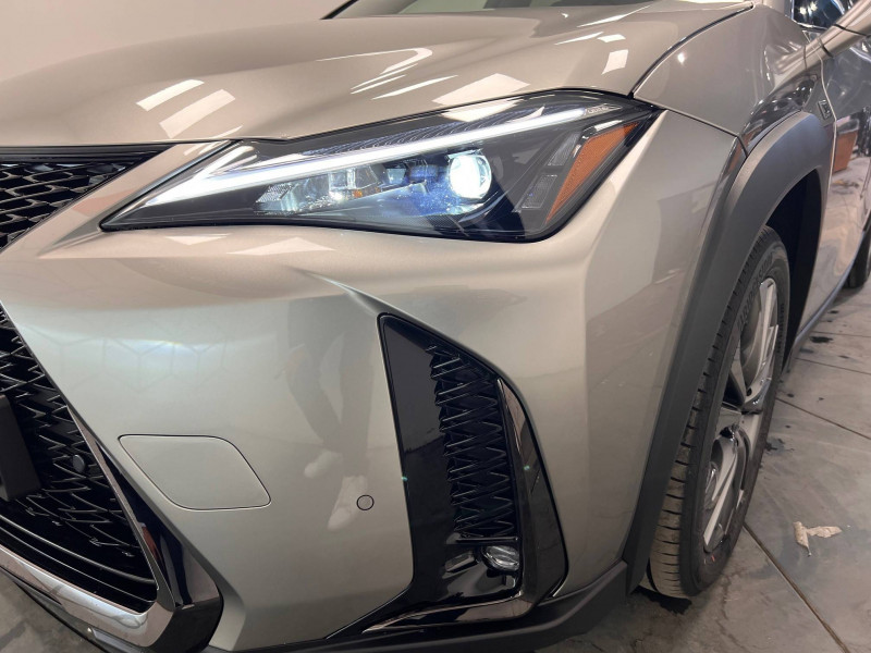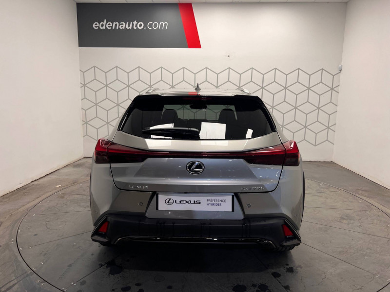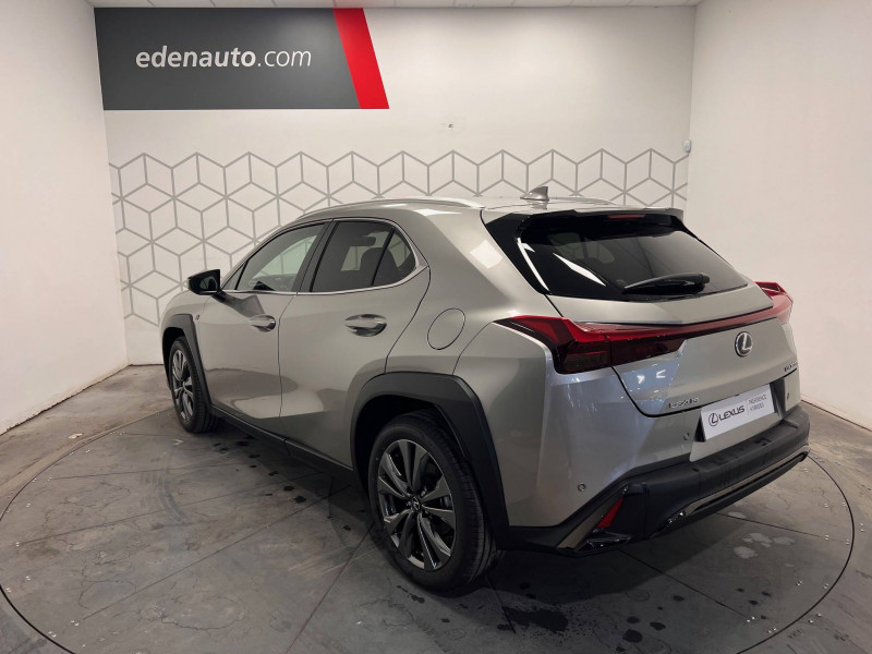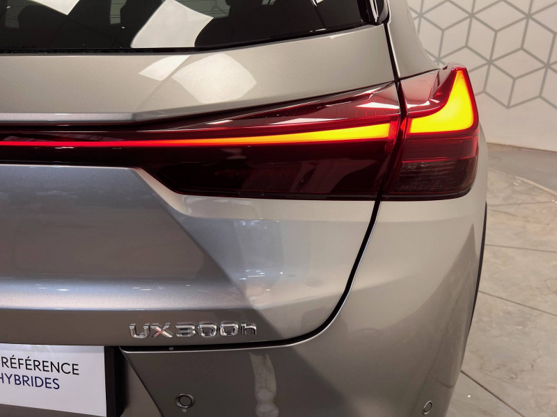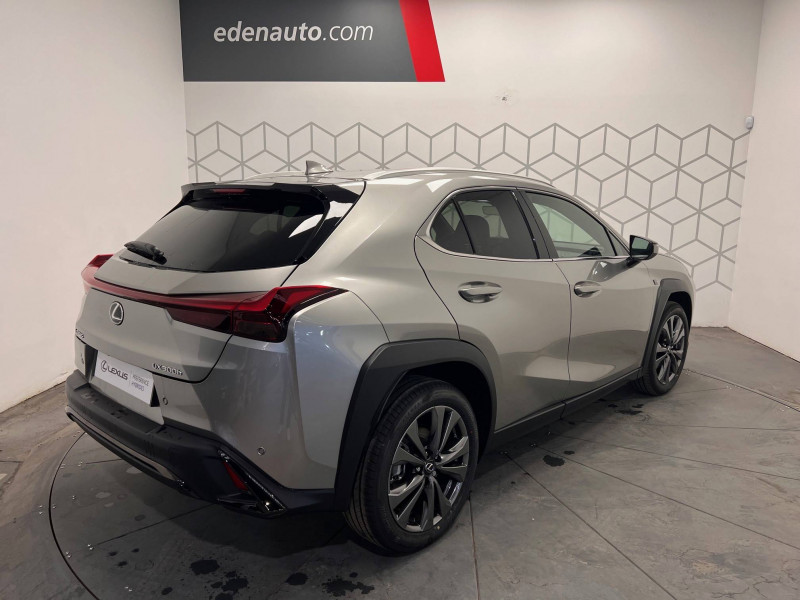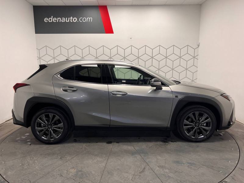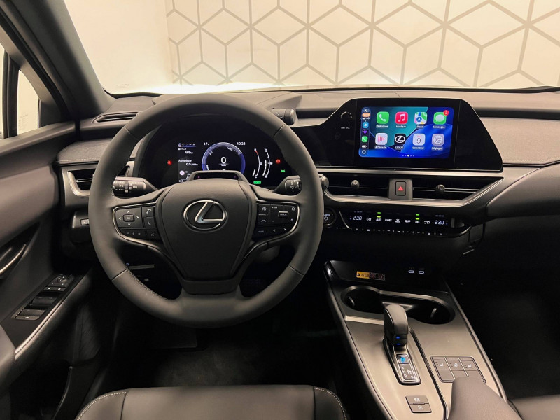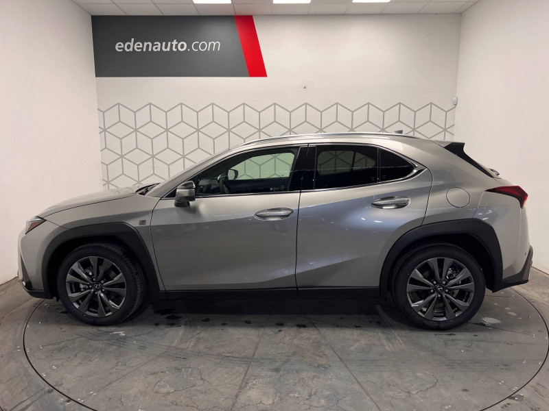 4 ports USB Type-C (2 AV, 2 AR) / Prise 12 V / 8 Airbags : airbag frontaux / latéraux et de genoux pour le conducteur et le passager AV, airbags rideaux sur toute la longueur du véhicule / Accoudoir central AR avec porte-gobelets (x2) / Antenne de toit type aileron de requin / Boîte automatisée a variation continu / Bouclier AV avec calandre trapézoïdale à motifs en nid d'abeilles aux finitions cuivrées / Boucliers AR aux finitions cuivrées / Bouton de désactivation de l'airbag (passager AV) / Capteurs de stationnement AV et AR et AR intelligents (ICS) / Chargeur sans fil pour Smartphone / Climatisation automatique bi-zone avec recirculation automatique / capteur d'humiditéet et technologie Nanoe / Commandes au volant (audio, affichage, téléphone, reconnaissance vocale, DRCC, LTA) / Connectivité audio et téléphonie Bluetooth / DAB (Digital Audio Broadcasting) / Double verrouillage des portières / Eclairage d'intersection / Essuie-glace AV à détecteur de pluie / Feux de stop actifs / Inserts Noir laqué (tableau de bord) / Jantes en alliage 18" F SPORT avec pneumatiques Runflat 225/50 R18 / Lexus Safety System+ 3:Lecture automatique des panneaux de circulation (RSA), Régulateur de vitesse dynamique (DRCC) avec réduction de la vitesse en courbe, Système de maintien dans la file de circulation avancé (LTA), Système de sécurité pré-collision (PCS) avec détection des intersections (ITA) et correction active de trajectoire (ESA) / Logos F SPORT sur les ailes AV / Mode EV (100 % électrique) / Moniteur d'angle mort (BSM) avec Safe Exit Assist (SEA) et feux de détresse automatiques et davertisseur de circulation AR intelligent (RCTAB) / Points d'ancrage ISOFIX aux places latérales AR / Pommeau de levier de vitesse gainé de cuir / Prétensionneurs de ceintures de sécurité AV et aux places latérales AR / Projecteurs AV LED simple lentille, réglage automatique de la hauteur du faisceau à l'arrêt / Rails de toit en aluminium / Rappel visuel et sonore de non-bouclage des ceintures de sécurité AV / Rétroviseur intérieur électrochromatique (atténuation automatique de la brillance) / Sélecteur de mode de conduite (ECO, NORMAL, SPORT) / Services connectés via l'application Lexus Link / Sièges AV réglables manuellement : Longitudinal / hauteur d'assise / inclinaison du dossier / Système antivol avec antidémarrage / alarme sonore / capteur d'intrusion / Système antivol bande ultra large (entraîne la suppression de la clé plate) / Système d'accès sans clé Smart Entry (portières AV et coffre) / Système d'appel d'urgence (eCall) / Système de freinage, stabilité, direction et d'antipatinage : ABS, BAS, EBD, ECB-R, EPB, EPS,TRC,VSC / Système de surveillance du conducteur (Driver Monitor) / Système Multimédia Lexus Link Connect : écran central tactile 8" et système de Navigation (Cloud), système audio Panasonic à 6 HP / Transmission à rapport variable en continu à commande électronique (E-CVT) / Verrouillage automatique des portières en roulant / Vitres latérales AR et lunette AR surteintées / Vitres latérales AV anti-UV / Volant chauffant