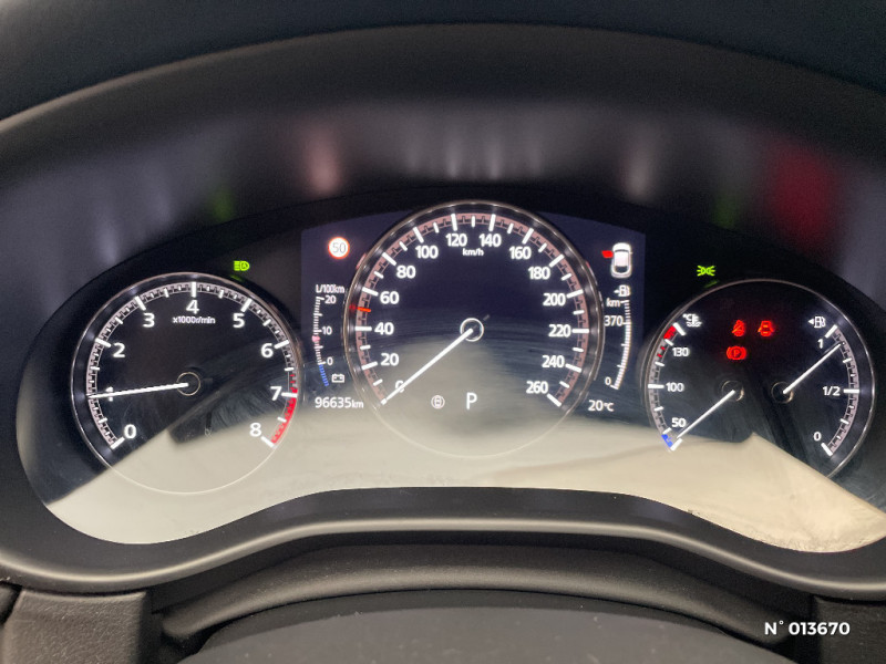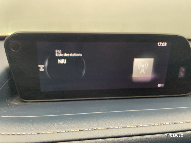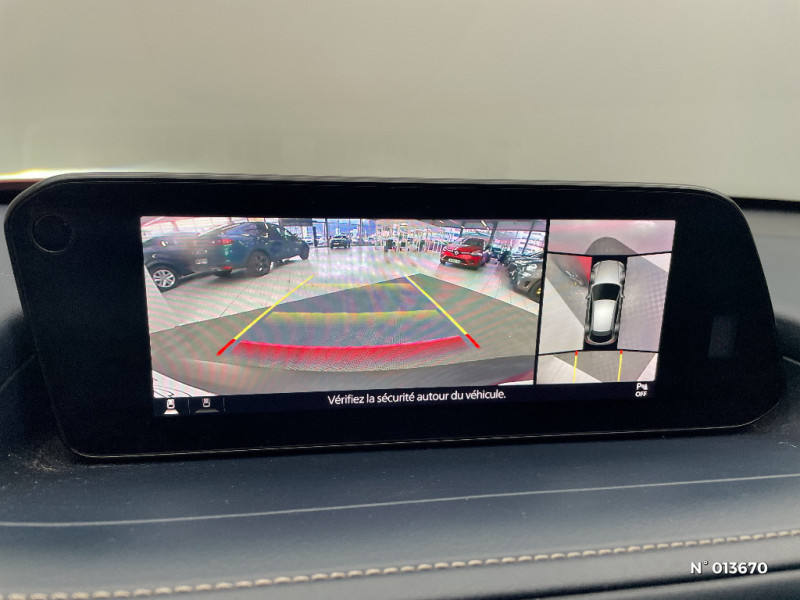 Volant chauffant / Caméra 360° / Rétroviseur intérieur sans cadre / Système audio Bose avec 12 HP / Eclairage de plaque AR à LED / Signature lumineuse spécifique à l'AV et à l'AR à LED / Montants de portes extérieurs "Piano Black" / Volant avec cerclage chromé / Reconnaissance active d'obstacles mobiles en marche AR (RCTA) avec fonction freinage (RCTB) / Phares à LED avec fonction antibrouillard intégrée / Essuie-glaces avec buse de lave-glace intégrée / Rétroviseurs extérieurs chauffants, réglables électriquement et à rabattage automatique (à l'ouverture et fermeture des portes) / Eclairage d'ambiance intérieur à LED / Système Bluetooth avec commandes au volant / Gestion automatique des feux de route (HBCS) / Porte-gobelets AV / Frein à main électrique (EPB) avec fonction "Autohold" et système de freinage d'urgence / Système "Auto Door Locking" (ADL) / Système "G-Vectoring Control Plus" (GVC+) / Aide au freinage intelligent en mode urbain (SCBS avancé) avec reconnaissance des piétons / Limiteur de vitesse avec adaptation intelligente de la vitesse (ISA) coupléà la reconnaissance des panneaux de signalisation (TSR) / Système d'appel d'urgence "E-Call" / Compteur numérique 7'' avec ordinateur de bord couleur / Système audio avec radio AM/FM/DAB et 8 haut-parleurs / Système Mazda Connect avec écran couleur 8,8'' TFT et système de navigation / Jantes alliage 18" "Bright Silver" / Clignotants à impulsion lumineuse "Kodo Turn" / Grille de calandre plastique mat / Signature de calandre chromée / Ciel de pavillon gris / Accoudoir central AV coloris bleu "Navy" avec rangements / Grille de calandre "Piano Black" / Canules d'échappement plus larges (90mm) / Rétroviseurs extérieurs couleur carrosserie / Rétroviseur intérieur photochromatique / Démarrage par bouton " Start" / Kit de réparation anticrevaison / Moulures de vitres latérales chromées / Bouton "Start" avec cerclage chromé / Poignée de boîte à gants chromée / Essuie-glaces AV dégivrants / Rétroviseurs extérieurs photochromatiques / Inserts décoratifs de planche de bord et liserés d'aérateurs "Chromé Satiné" / Régulateur de vitesse adaptatif Mazda (MRCC) (0-200 km/h) avec fonction Stop&Go et système d'aide au trafic (CTS) / Système d'alerte du conducteur (DAA) avec caméra / Reconnaissance active d'obstacles mobiles en marche AV (FCTA) / Pare-soleil avec miroir de courtoisie et éclairage côtés conducteur et passager + rangement côté conducteur / Ouverture/fermeture intelligente des portes / Fonction "Coming / Leaving home" / Volant et pommeau de levier de vitesses gainé de cuir / Aide au freinage intelligent en marche AR (SCBS AR) / Peinture unie / Cache bagages