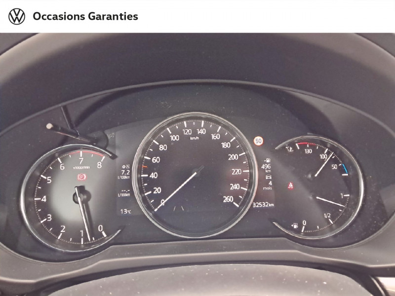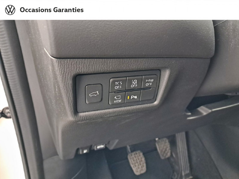 Aide au freinage intelligent (SBS) avec avertisseur d'obstacle frontal (FOW) / Aide au freinage intelligent en mode urbain (SCBS avancé) avec détection des piétons de nuit / Climatisation automatique Bi-zone avec grilles de ventilation à l'AR / Eclairage intérieur à LED / Gestion automatique des feux de route (HBCS) / Jantes alliage 19" "Black Metallic" / Phares à LED avec lave-phares / Système d'aide au trafic (CTS) / Volant et pommeau de levier gainés de cuir / 1 prise USB à l'AV et 2 à l'AR / 2 prises USB-C à l'AV / 3 prises 12V (AV, accoudoir central et coffre) / Accoudoir central AR et deux porte-gobelets / Affichage tête haute couleur (ADD) avec reconnaissance des panneaux de signalisation (TSR) / Antenne type "Requin" / Caméra 360° / Compteur numérique 7" / Contrôle dynamique de stabilité (DSC) avec système de surveillance de pression des pneus (TPMS) / Deux porte-gobelets au niveau de l'accoudoir central / Décoration de planche de bord "Karakuri" / Démarrage avec bouton "start" / Essuie-glace dégivrants / Fonction "Coming/Leaving Home" / Frein à main électrique (EPB) avec fonction "Autohold" et système de freinage d'urgence / Illumination de la boite à gants / Illumination du miroir de courtoisie / Kit de réparation anti-crevaison / Prise jack auxiliaire / Réglage de l'inclinaison des sièges AR / Rétroviseur intérieur photochromatique / Rétroviseurs rabattables électriquement (à l'ouverture et fermeture du véhicule) / Signature lumineuse spécifique / Siège conducteur avec réglage manuel des supports des lombaires / Smart Keyless Entry / Système audio BOSE avec 10 HP / Système Auto Door Locking (ADL) / Système Bluetooth avec commandes au volant / Système d'alarme périmétrique avec détecteur d'intrusion / Système d'alerte du conducteur (DAA) / Système d'assistant au maintien de la trajectoire (LAS) avec alerte de franchissement de ligne / Système de surveillance des angles morts (BSM) et système de reconnaissance active d'obstacles mobiles en marche AR (RCTA) / Système MAZDA Connect (7G) avec écran 10.25" tactile en présence d'Apple CarPlay et Android Auto / USB Type-A / Volant chauffant