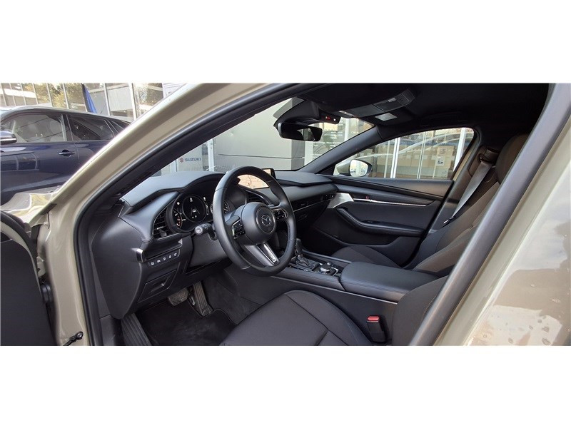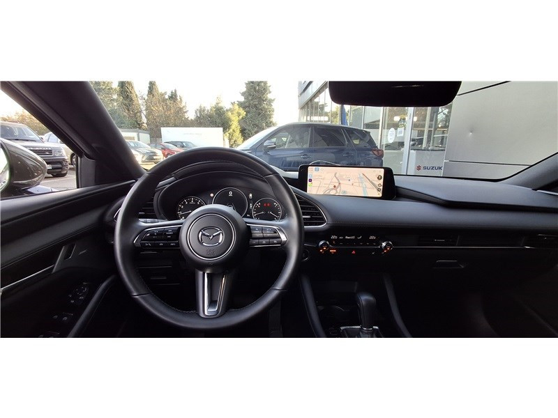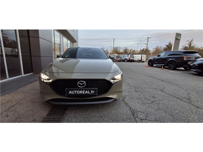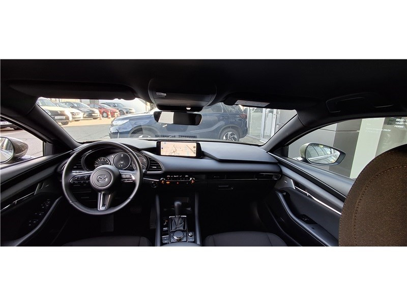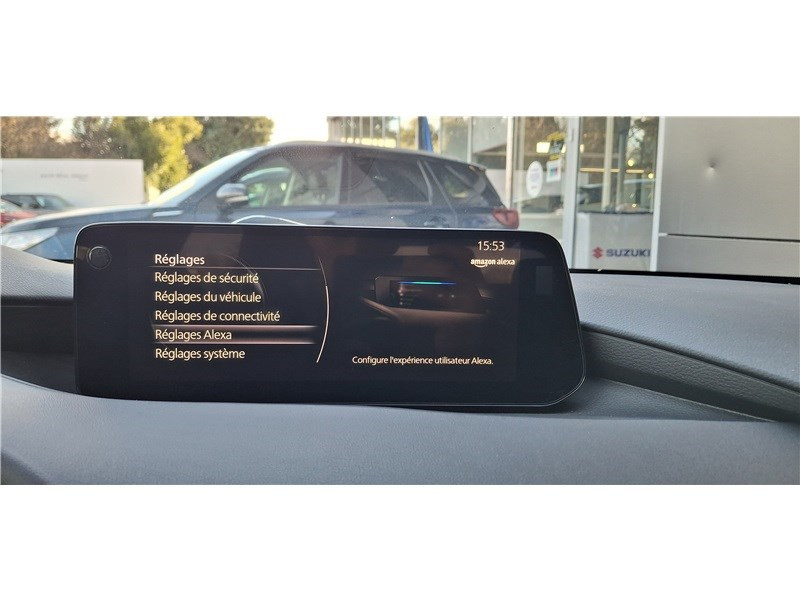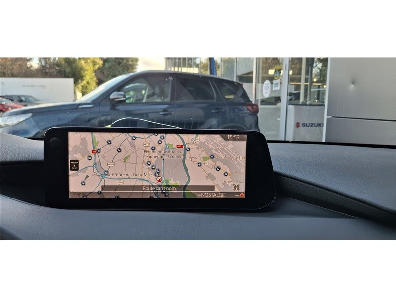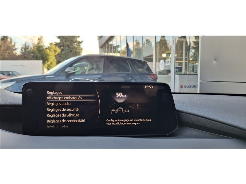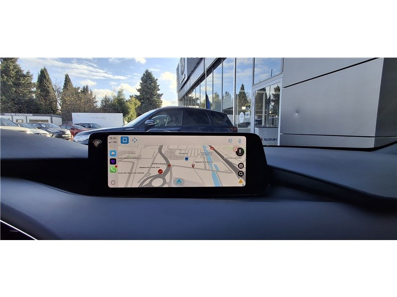 2 prises USB-C et 1 prise 12 V / Aide au freinage intelligent avec détection des piétons et fonction de freinage en intersection marche AR (SBSR) / Alerte de franchissement de ligne (LDWS) avec système de maintien de trajectoire (LKA) / Bas de caisse inférieur AR "Black Gloss" / Cache bagages / Caméra 360° / Ciel de pavillon noir / Clignotants à impulsion lumineuse "Kodo Turn" / Compteur numérique 7'' avec ordinateur de bord / Démarrage par bouton " Start/Stop" / Eclairage d'ambiance intérieur à LED / Eclairage de plaque AR à LED / Fonction "Coming / Leaving home" / Frein à main électrique (EPB) avec fonction "Autohold" et système de freinage d'urgence / Gestion automatique des feux de route (HBCS) / Grille de calandre plastique mat / Inserts décoratifs de planche de bord et liserés d'aérateurs "Silver" / Kit de réparation anti-crevaison / Limiteur de vitesse avec adaptation intelligente de la vitesse (ISA) coupléà la reconnaissance des panneaux de signalisation (TSR) / Montants des portes "Black Gloss" / Ouverture/fermeture intelligente des portes / Pare-soleil avec miroir de courtoisie et éclairage côtés conducteur et passager + rangement côté conducteur / Peinture opaque / Porte-gobelets AV / Reconnaissance active d'obstacles mobiles en marche AR (RCTA) / Reconnaissance active d'obstacles mobiles en marche AV (FCTA) / Régulateur de vitesse adaptatif Mazda (MRCC) et aide au freinage intélligent (SBS) / Rétroviseur extérieur côté conducteur photochromatique / Rétroviseur intérieur photochromatique (sans cadre) / Rétroviseurs extérieurs chauffants, réglables électriquement et à rabattage automatique (à l'ouverture et fermeture des portes) / Rétroviseurs extérieurs couleur carrosserie / Services connectés MyMazda avec fonction allumage des feux / Siège passager réglable manuellement 6 voies / Signature de calandre "Dark Metallic" / Signature lumineuse spécifique à l'AV et à l'AR à LED / Système audio Bose avec 12 HP / Système "Auto Door Locking" (ADL) / Système Bluetooth avec commandes au volant / Système d'aide au trafic (CTS) couplé au MRCC / Système d'alerte du conducteur (DAA) avec caméra / Système d'appel d'urgence "E-Call" avancé / Système de micro-hybridation Mazda M Hybrid / Système de reconnaissance vocale Alexa / Système "G-Vectoring Control Plus" (GVC+) / Système Mazda Connect avec écran couleur 10,25'' TFT et système de navigation connecté / Vitres électriques AV et AR avec commande à impulsion pour chaque vitre / Volant chauffant / Volant et pommeau de levier de vitesses en cuir / Volant, poignée de boîte à gants et bouton "Start" avec cerclage chromé