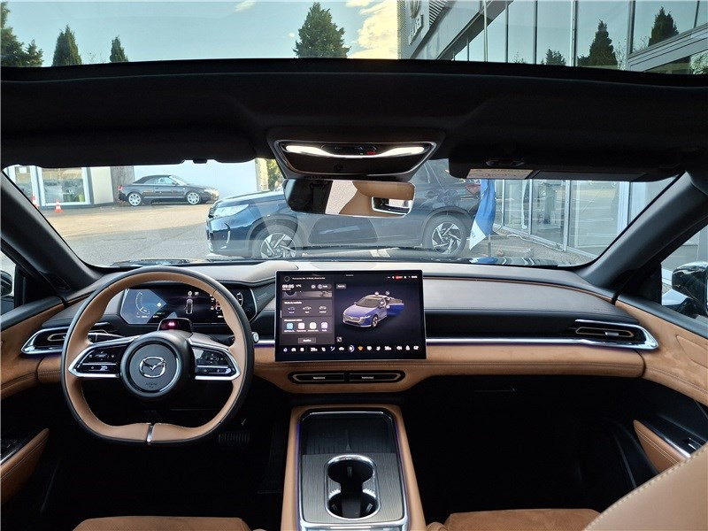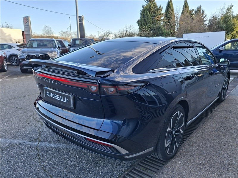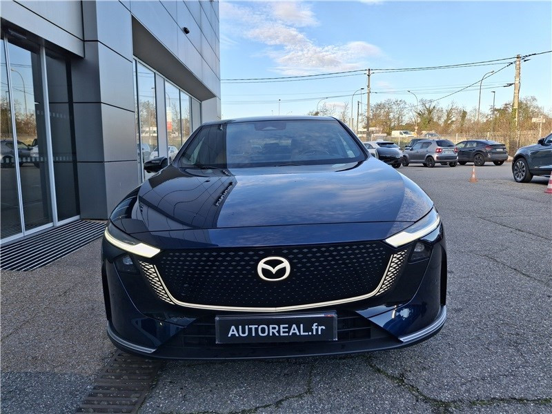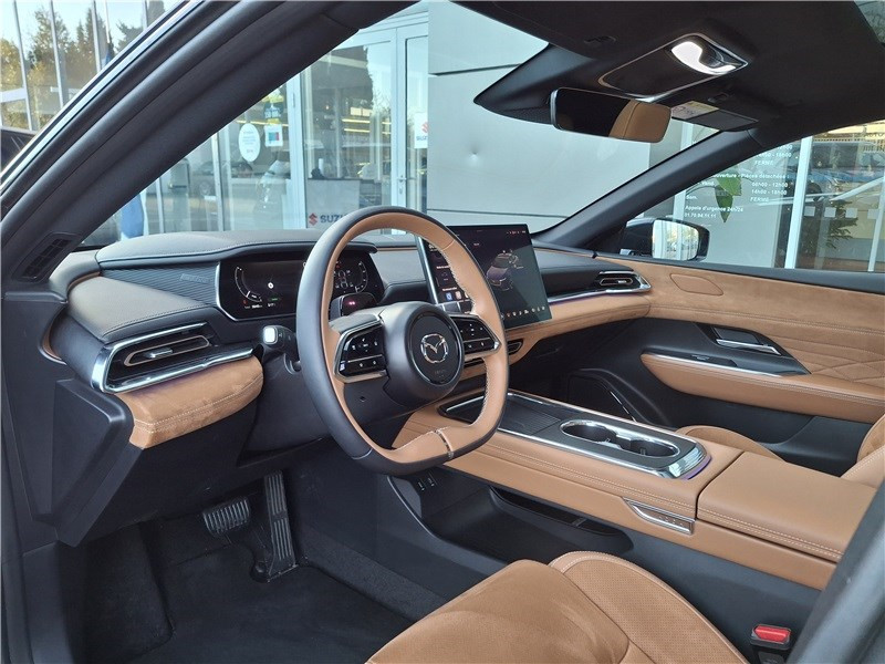 1 prise USB-A + 2 prises USB-C + 1 prise 12V / 2 clés (boîtier de clé de secours séparé) / 3 modes de conduite (Normal, Sport, Individuel) / 9 airbags (frontaux x2, rideaux x2, latéraux x4, latéral AV) / Accoudoir, console centrale, panneaux de portes et partie inférieure du tableau de bord en grain de / Affichage tête haute couleur étendu (ADD) / Affichage tête haute couleur étendu (ADD) / Aide au freinage intelligent avec détection des piétons et fonction de freinage en intersection / Aide au freinage intelligent (SBS) / Alerte de franchissement de ligne (LDWS) avec système de maintien de trajectoire (LKA) / Avertisseur de collision AV (FCW) / Avertisseur de collision l'AR (RCW) / Becquet AR électrique rétractable / Boîte automate à fonction continue / Câble Type 2 Mode 3 / Cache bagages / Calandre pleine avec signature lumineuse / Caméra 360° avec fonction "See-Through" / Charge DC possible jusqu'à 165 kW (batterie 68.8 kWh) / Charge DC possible jusqu'à 165 kW (batterie 68.8 kWh) et jusqu'à 90 kW (batterie 80 kWh) / Chargeur embarqué triphasé 11 kW (recharge AC) / Ciel de pavillon noir / Clé digitale sur smartphone via Bluetooth (avec option de partage) / Commandes gestuelles / Commandes gestuelles & modes de véhicule / Contrôle de la traction (TCS) / Différents modes intelligents de véhicule / Différents modes intelligents de véhicule / Eclairage d'ambiance intérieur personnalisable (64 coloris) - Ajustable en couleur et en luminosité / Ecran central avec système d'infodivertissement 14,6" / Espace de rangement à l'AV du véhicule (72L) / Fonction Coming home / Frein électrique (EPB) avec fonction Auto Hold / Gestion automatique des feux de route (HBC) / Haut-parleur extérieur / Jantes alliage 19 Black Silver Aerodynamic (245/45R19 Michelin) / Lumière de courtoisie / Maintien d'urgence sur la voie (ELK) ) lié au système de surveillance des angles morts (BSM) / Mises à jour OTA / Ordinateur de bord avec compteur numérique 10,2" LCD / Ouverture/fermeture intelligente des portes / Pare-soleil avec miroirs de courtoisie / Pare-soleil de toit électrique / Peinture métallisée Crystal White Pearl / Poignées de porte affleurantes, rétractables à la fermeture du véhicule / Pompe à chaleur (climatisation et préchauffage de la batterie) / Porte-gobelets à l'AV et à l'AR / Reconnaissance active d'obstacles mobiles en marche AR (RCTA) / Reconnaissance vocale (9 langues) / Régulateur de vitesse adaptatif Mazda (MRCC) avec fonction Stop&Go / Rétroviseur intérieur photochromatique / Rétroviseurs extérieurs noirs, chauffants, réglables électriquement avec fonction de mémorisation / Sellerie cuir Nappa Tan et suédine / Services connectés Mazda via application / Siège conducteur réglable électriquement 10 voies avec fonction de mémorisation / Siège passager réglable électriquement 4 voies / Système audio avec radio FM/DAB et 14 HPs Sony / Système d'aide au trafic (CTS) / Système de contrôle de présence des passagers AR (CDP) / Système de détection d'un danger à l'ouverture des portes (DOW) / Système de navigation avec planificateur de recharge / Système de reconnaissance des panneaux de signalisation (TSR) avec adaptation intelligente de la / Système ISOFIX sur les sièges AR / Toit panoramique (verre teinté et isolation thermique) / Volant chauffant, multifonctions et à réglage téléscopique / Volant gainé de cuir bi-ton