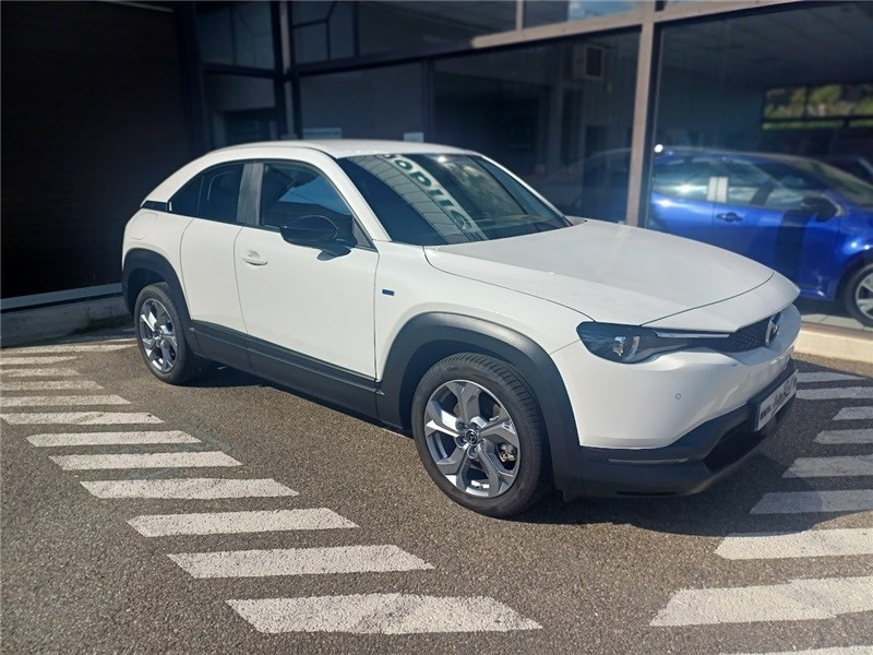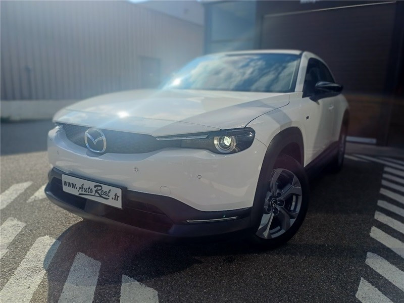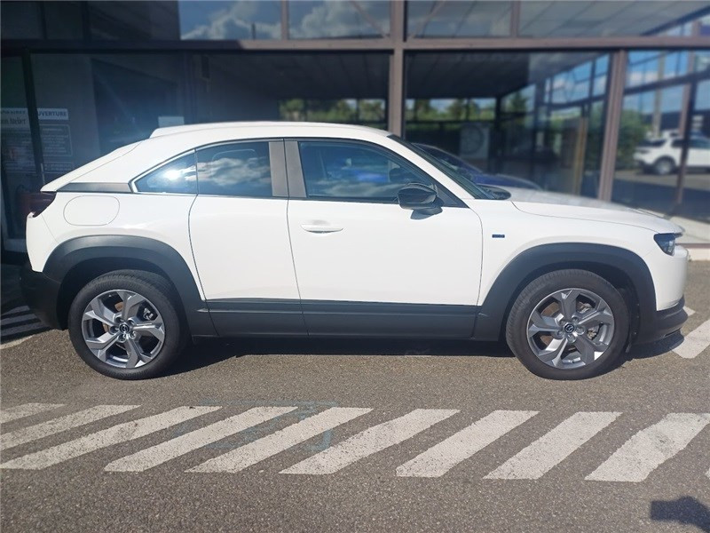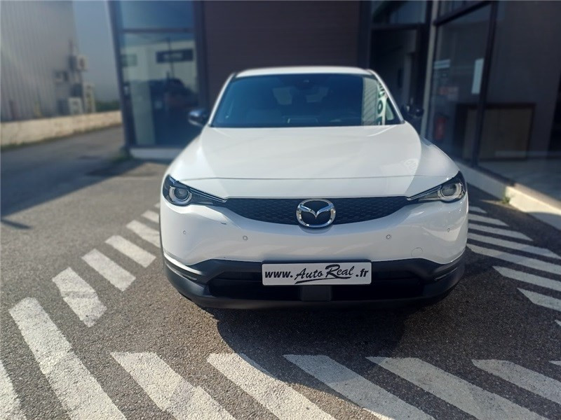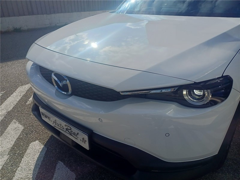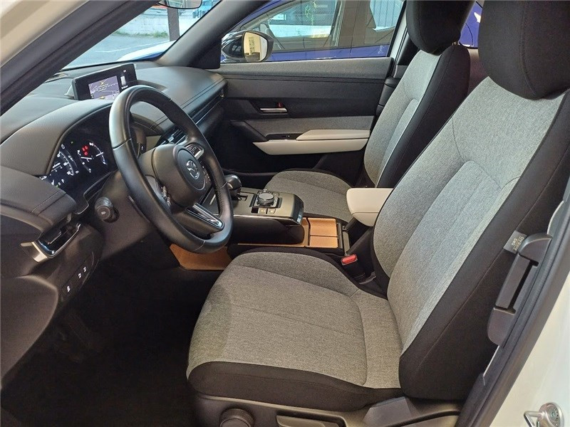 Adaptateur CCS pour charge rapide en courant continu / Aide au freinage intelligent (SBS) avec reconnaissance des piétons et fonction de freinage en intersection / Câble de recharge Type 2 / Mode 2 (recharge sur prise domestique renforcée) / Câble de recharge Type 2 / Mode 3 (wallbox) / Cache bagages / Ciel de pavillon noir / Clignotants "Kodo Turn" / Compteur numérique 7'' avec ordinateur de bord couleur / Coques de rétroviseurs extérieurs noirs / Démarrage par bouton " Start" / Eclairage d'ambiance intérieur à LED / Eclairage de plaque AR à LED / Ecran secondaire tactile 7" pour réglages de la climatisation / Emulateur de son de moteur thermique / Essuie-glaces avec buse de lave-glace intégrée / Fonction "Coming / Leaving home" / Frein à main électrique (EPB) avec fonction "Autohold" et système de freinage d'urgence / Inserts de console centrale en liège véritable / Kit de réparation anti-crevaison / Limiteur de vitesse avec adaptation intelligente de la vitesse (ISA) coupléà la reconnaissance des panneaux de signalisation (TSR) / Palettes au volant (pour ajuster le niveau de décélération) / Pare-soleil avec miroir de courtoisie + rangement côté conducteur / Phares AV à LED avec fonction antibrouillard intégrée / Pompe à chaleur / Portes "Freestyle" / Reconnaissance active d'obstacles mobiles en marche AR (RCTA) / Sellerie tissu noir avec assise/dossier gris clair / Siège passager réglable manuellement 6 voies / Système audio avec radio AM/FM/DAB et 8 haut-parleurs / Système "Auto Door Locking" (ADL) / Système Bluetooth avec commandes au volant / Système d'alerte du conducteur (DAA) / Système d'appel d'urgence "E-Call" / Système de surveillance des angles morts (BSM) avec correction de trajectoire automatique (BSA) / Système "G-Vectoring Control Plus" associé au moteur électrique (e-GVC+) / Système Mazda Connect avec écran couleur 8,8'' TFT et système de navigation / Volant et pommeau de levier de vitesses en cuir