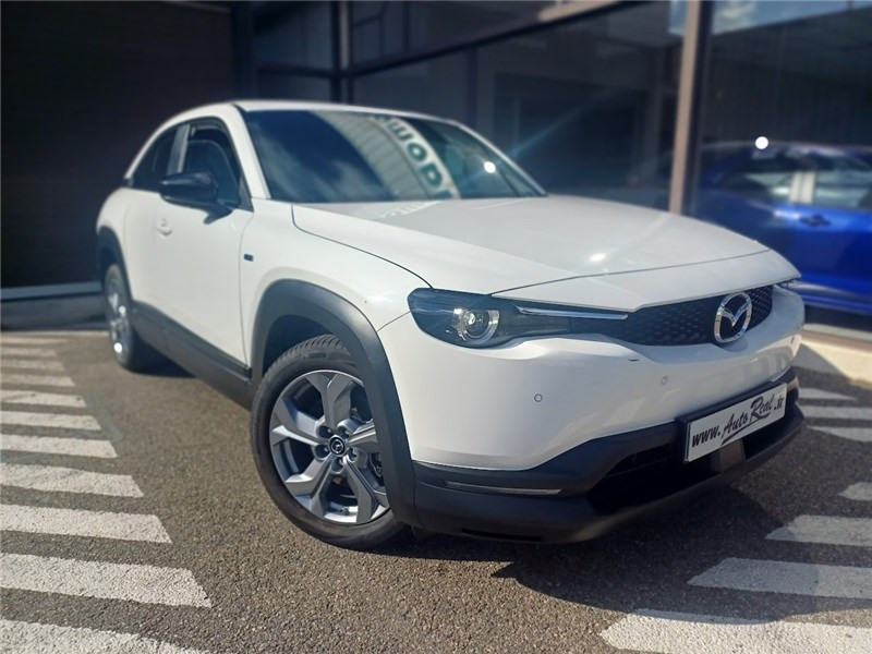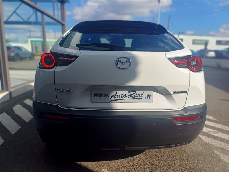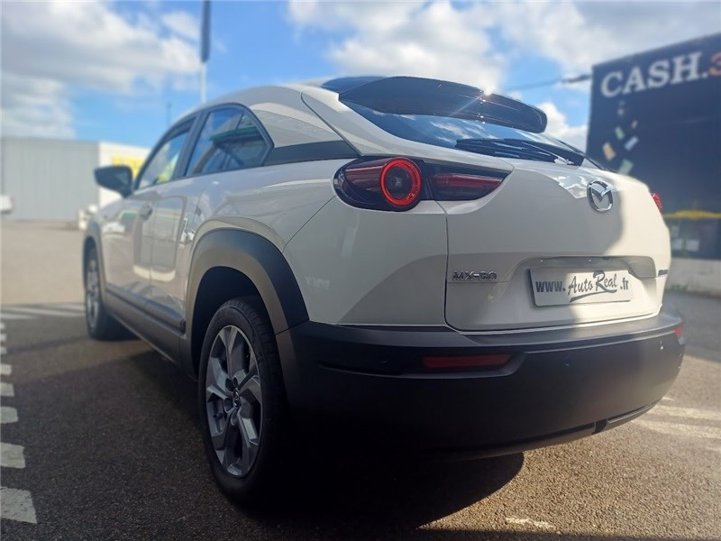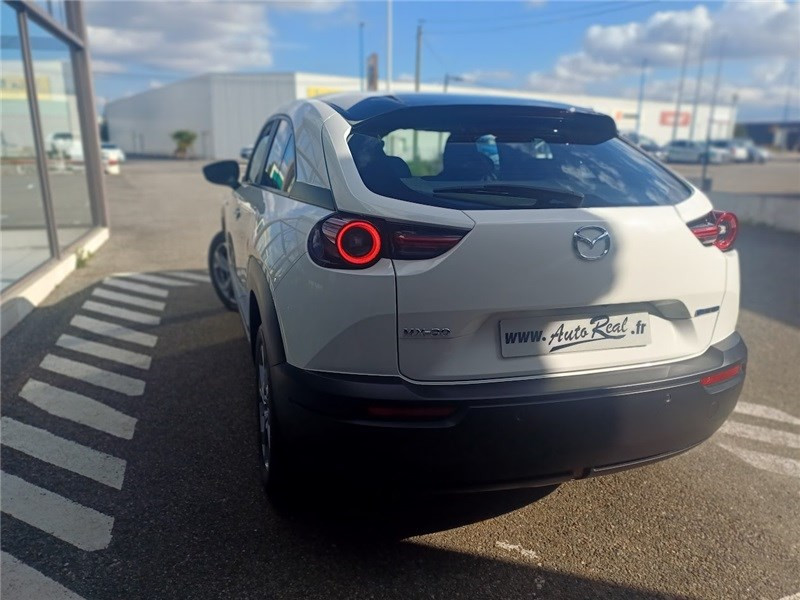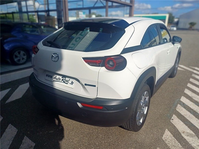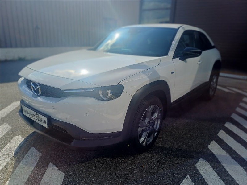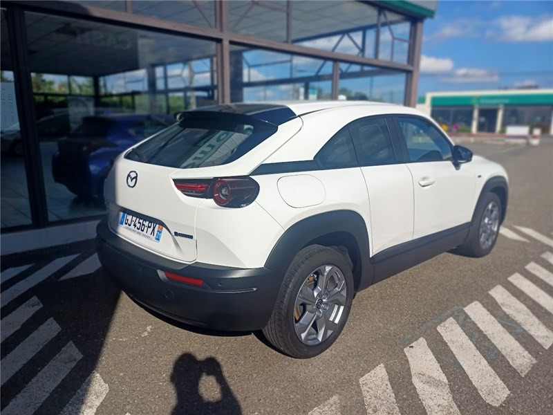 Adaptateur CCS pour charge rapide en courant continu / Aide au freinage intelligent (SBS) avec reconnaissance des piétons et fonction de freinage en intersection / Câble de recharge Type 2 / Mode 2 (recharge sur prise domestique renforcée) / Câble de recharge Type 2 / Mode 3 (wallbox) / Cache bagages / Ciel de pavillon noir / Clignotants "Kodo Turn" / Compteur numérique 7'' avec ordinateur de bord couleur / Coques de rétroviseurs extérieurs noirs / Démarrage par bouton " Start" / Eclairage d'ambiance intérieur à LED / Eclairage de plaque AR à LED / Ecran secondaire tactile 7" pour réglages de la climatisation / Emulateur de son de moteur thermique / Essuie-glaces avec buse de lave-glace intégrée / Fonction "Coming / Leaving home" / Frein à main électrique (EPB) avec fonction "Autohold" et système de freinage d'urgence / Inserts de console centrale en liège véritable / Kit de réparation anti-crevaison / Limiteur de vitesse avec adaptation intelligente de la vitesse (ISA) coupléà la reconnaissance des panneaux de signalisation (TSR) / Palettes au volant (pour ajuster le niveau de décélération) / Pare-soleil avec miroir de courtoisie + rangement côté conducteur / Phares AV à LED avec fonction antibrouillard intégrée / Pompe à chaleur / Portes "Freestyle" / Reconnaissance active d'obstacles mobiles en marche AR (RCTA) / Sellerie tissu noir avec assise/dossier gris clair / Siège passager réglable manuellement 6 voies / Système audio avec radio AM/FM/DAB et 8 haut-parleurs / Système "Auto Door Locking" (ADL) / Système Bluetooth avec commandes au volant / Système d'alerte du conducteur (DAA) / Système d'appel d'urgence "E-Call" / Système de surveillance des angles morts (BSM) avec correction de trajectoire automatique (BSA) / Système "G-Vectoring Control Plus" associé au moteur électrique (e-GVC+) / Système Mazda Connect avec écran couleur 8,8'' TFT et système de navigation / Volant et pommeau de levier de vitesses en cuir