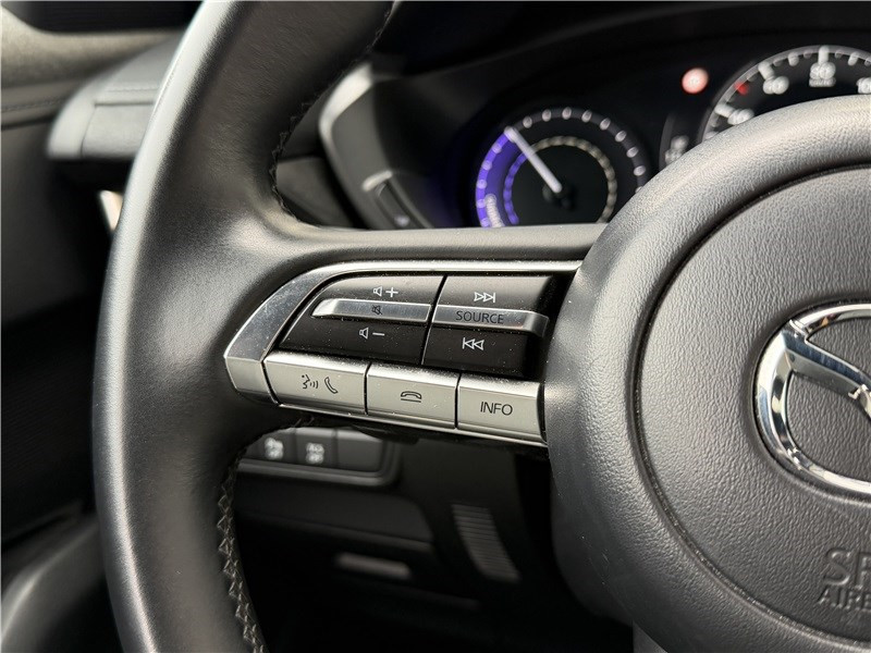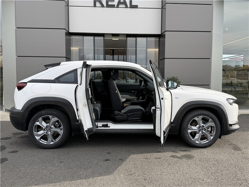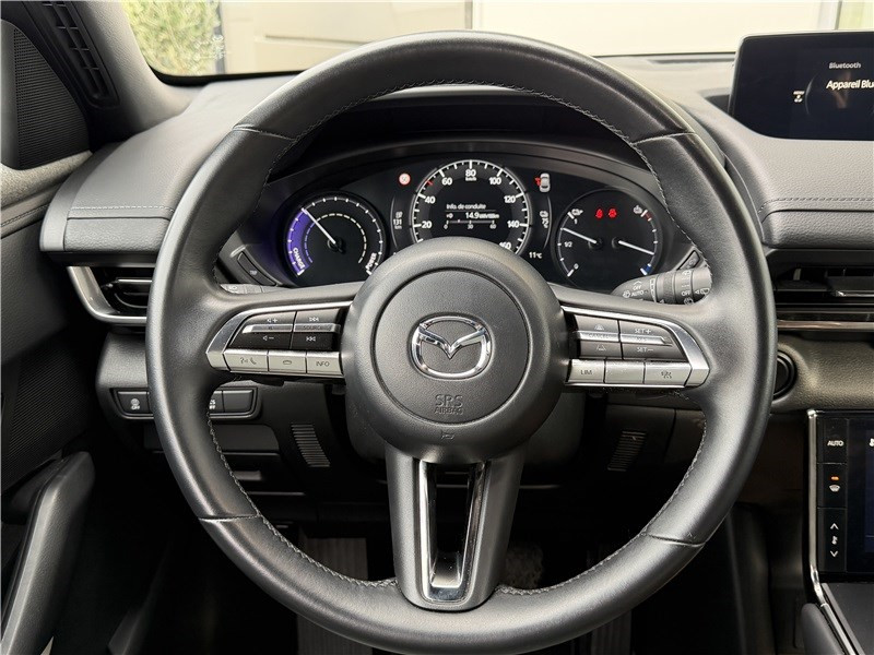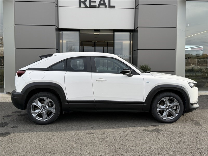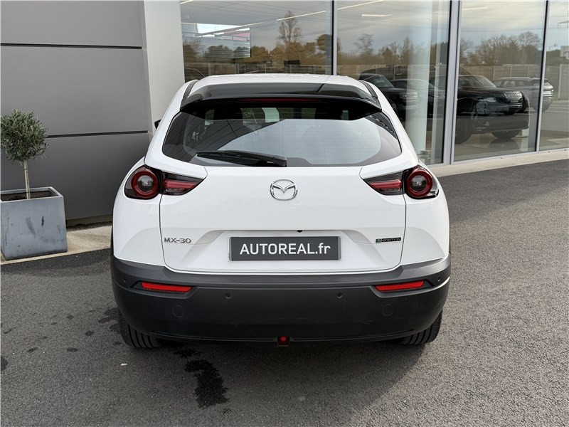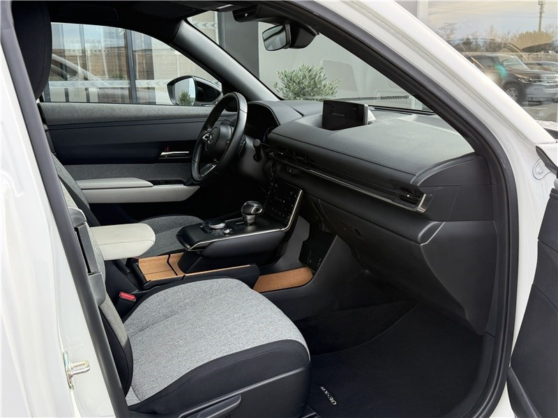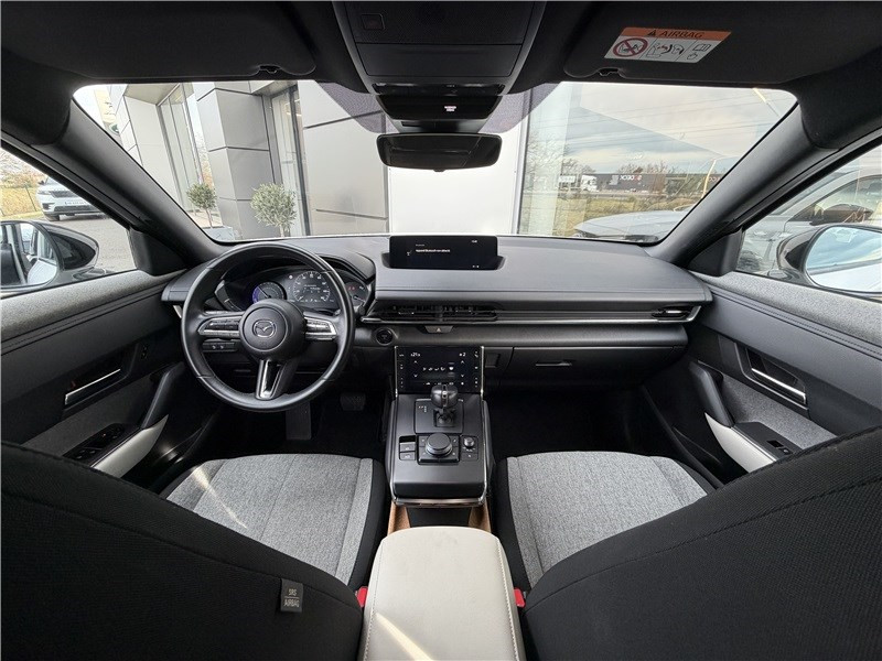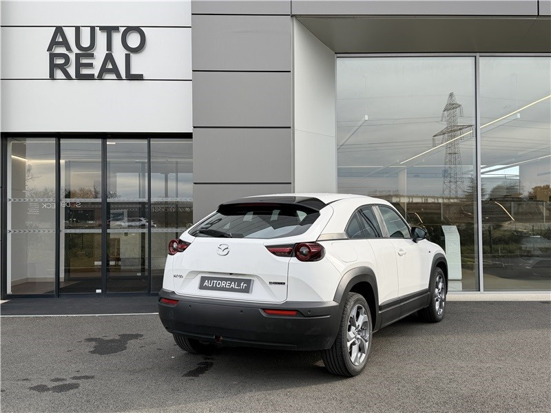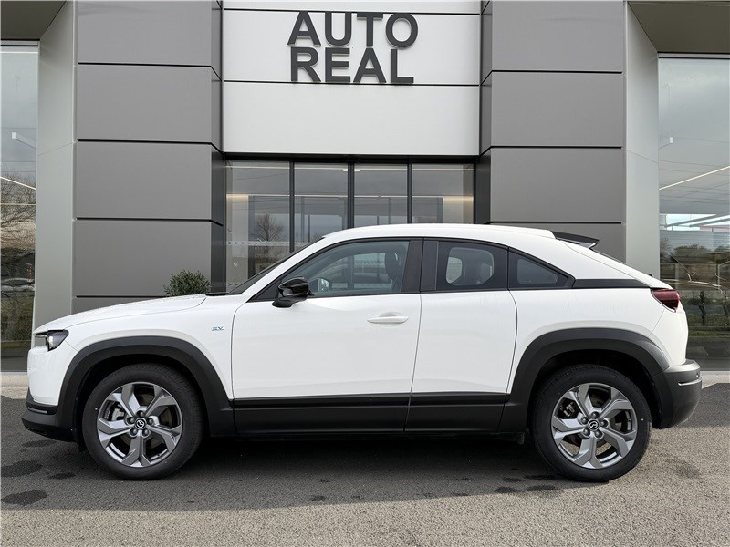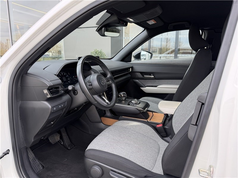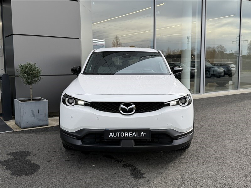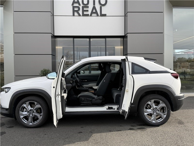 Adaptateur CCS pour charge rapide en courant continu / Aide au freinage intelligent (SBS) avec reconnaissance des piétons et fonction de freinage en / Boîte automate à fonction continue / Câble de recharge Type 2 / Mode 2 (recharge sur prise domestique renforcée) / Compteur numérique 7'' avec ordinateur de bord couleur / Démarrage par bouton " Start/Stop" / Ecran secondaire tactile 7" pour réglages de la climatisation / Essuie-glaces avec buse de lave-glace intégrée / Frein à main électrique (EPB) avec fonction "Autohold" et système de freinage d'urgence / Inserts de console centrale en liège véritable / Limiteur de vitesse avec adaptation intelligente de la vitesse (ISA) coupléà la reconnaissance des / Palettes au volant (pour ajuster le niveau de décélération) / Pare-soleil avec miroir de courtoisie + rangement côté conducteur / Peinture Arctic White / Reconnaissance active d'obstacles mobiles en marche AR (RCTA) / Système audio avec radio AM/FM/DAB et 8 haut-parleurs / Système "Auto Door Locking" (ADL) / Système Bluetooth avec commandes au volant / Système de surveillance des angles morts (BSM) avec correction de trajectoire automatique (BSA) / Système "G-Vectoring Control Plus" associé au moteur électrique (e-GVC+) / Système Mazda Connect avec écran couleur 8,8'' TFT et système de navigation