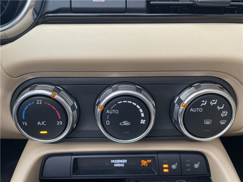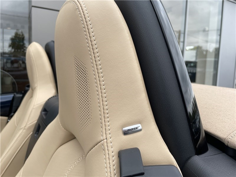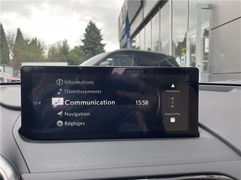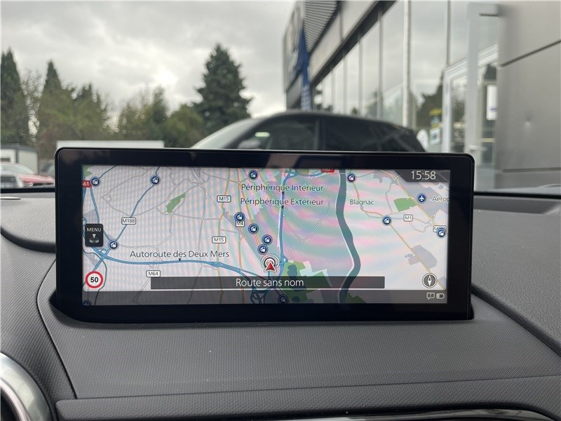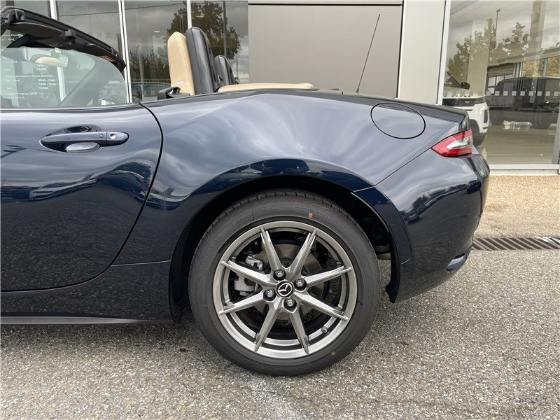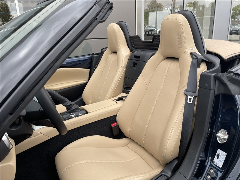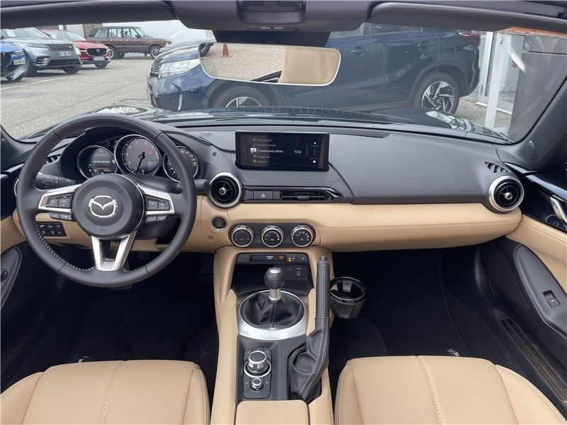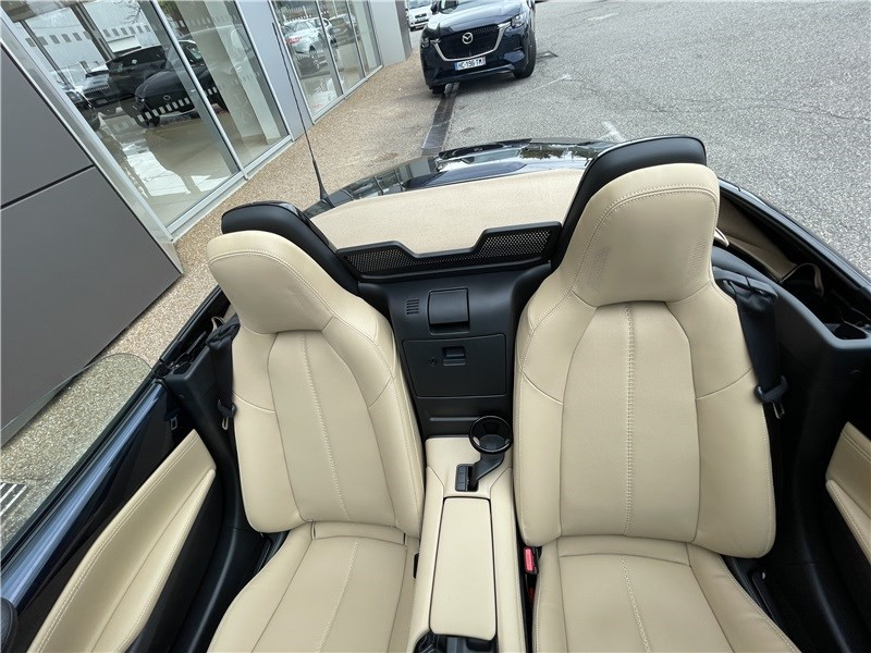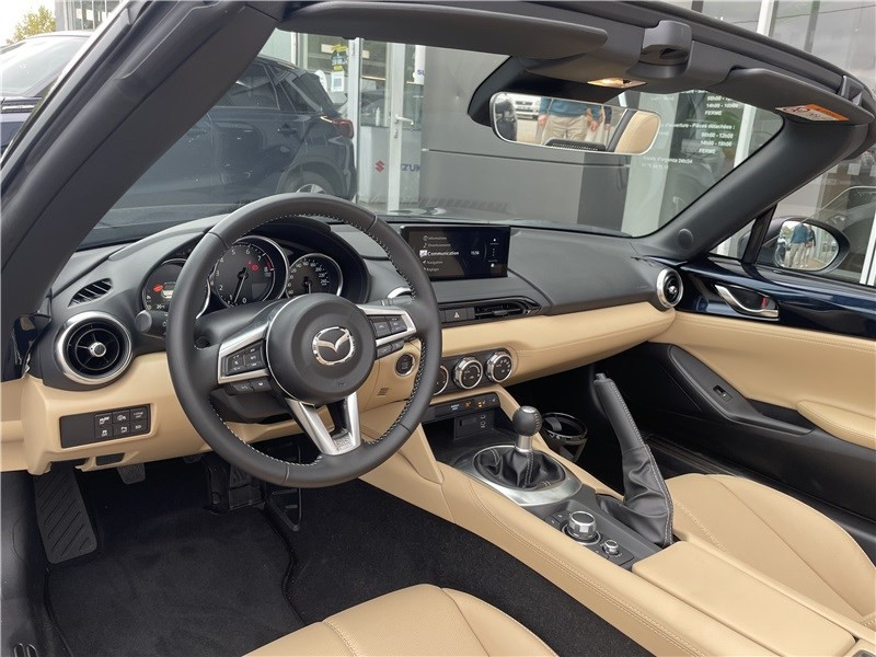 Aide au freinage intelligent en mode urbain AR (SCBS-R) / Aide au freinage intelligent en mode urbain AV (SCBS) / Alerte de franchissement de ligne (LDWS) avec système de maintien de trajectoire (LKA) / Capot actif (protection des piètons) / Console centrale avec surpiqûres "Beige" / Console centrale revêtue de synthétique noir / Démarrage par bouton " Start/Stop" / Ecran central couleur 8.8" avec système Mazda Connect et navigation intégrée / Entourage d'aérateurs et contrôle de la climatisation / chauffage "Bright" / Freins AV ventilés / Garniture centrale de portes noir avec surpiqûres argentées / Garniture supérieure de portes couleur carrosserie / Mode conduite "Track Mode" / Ordinateur de bord avec écran couleur LCD / Ouverture/fermeture intelligente des portes / Pare-soleil avec miroir de courtoisie et range ticket côté conducteur / Plaques de protection de seuil de portes noires avec insert en acier / Poignées de portes extérieures couleur carrosserie / Poignées de portes intérieures couleur argent / Pommeau de levier de vitesses et frein à main en cuir avec surpiqûres argentées / Porte-gobelets x2 / Reconnaissance active d'obstacles mobiles en marche AV (RCTA) / Reconnaissance des panneaux de signalisation (TSR) avec adaptation intelligente de la vitesse (ISA) / Rétroviseur intérieur photochromatique (sans cadre) / Rétroviseurs extérieurs couleur carrosserie / Revêtement du tableau de bord noir avec surpiqûres argentées / Sellerie cuir Nappa beige perforée / Siège passager réglable 4 voies / Système audio avec radio AM/FM/DAB / Système Bluetooth avec commandes au volant / Système d'alerte du conducteur (DAA) / Système de coupure et redémarrage automatique du moteur à l'arrêt i-Stop / Système de récupération d'énergie à la décélération i-ELOOP / Système de stabilité en courbe (KPC) / Toit souple beige / Volant en cuir avec surpiqûres et branches argentées
