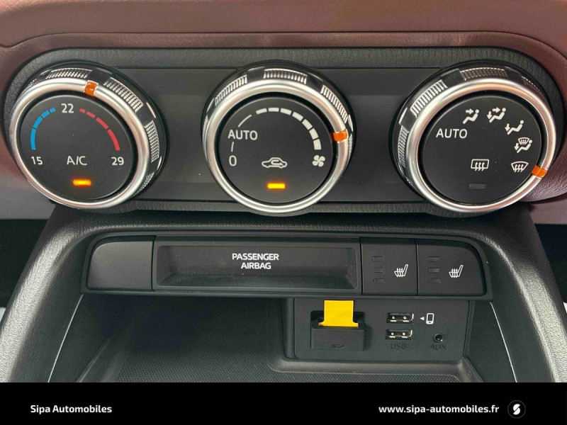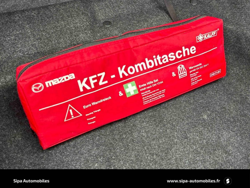 Avertisseur de changement de file (LDWS) / Capot actif (protection des piètons) / Climatisation automatique avec entourages de commandes couleur "argent brillant" / Décoration inférieure de tableau de bord cuir vinyle noir avec surpiqûres rouge (coté passager) / Démarrage par bouton " Start/Stop" / Entourage d'aérateurs couleur "Argent brillant" / Essuie-glace automatique à détecteur de pluie / Fonction "Coming / Leaving home" / Garnitures centrales de portes cuir vinyle noir avec surpiqûres rouges / Garnitures supérieures de portes couleur carrosserie / Jantes alliage 16" "Bright Dark" / Ouverture/fermeture des portes à télécommande / Ouverture/fermeture intelligente des portes / Palettes de changement de vitesses au volant et bouton se sélection du mode de conduite / Pare-soleil avec miroir de courtoisie (côtés conducteur et passager) et range-ticket côté conducteur / Peinture Arctic White / Phares AV à LED / Poignées de portes extérieures couleur carrosserie / Poignées de portes intérieures couleur "argent brillant" / Pommeau de levier de vitesses et levier de frein à main gainés de cuir / Porte-gobelets / Prise AUX et 2 ports USB / Rétroviseur intérieur photochromatique / Rétroviseurs extérieurs couleur carrosserie / Revêtement d'arceau Piano black / Revêtement de couvercle de console centrale cuir vinyle noir / Siège conducteur avec réglage manuel de la profondeur / Sièges AV avec réglage manuel de la longueur et inclinaison / Sièges cuir Nappa "Chroma Brown" / Système d'antiblocage des roues au freinage (ABS) / Système de signalisation d'arrêt d'urgence (ESS) / Système de surveillance des angles morts (BSM) et reconnaissance active d'obstacles mobiles en marche AR (RCTA) / Système MZD Connect + Interface à commandes multiples HMI avec écran couleur 7" / Volant gainé de cuir avec branches couleur "argent brillant"