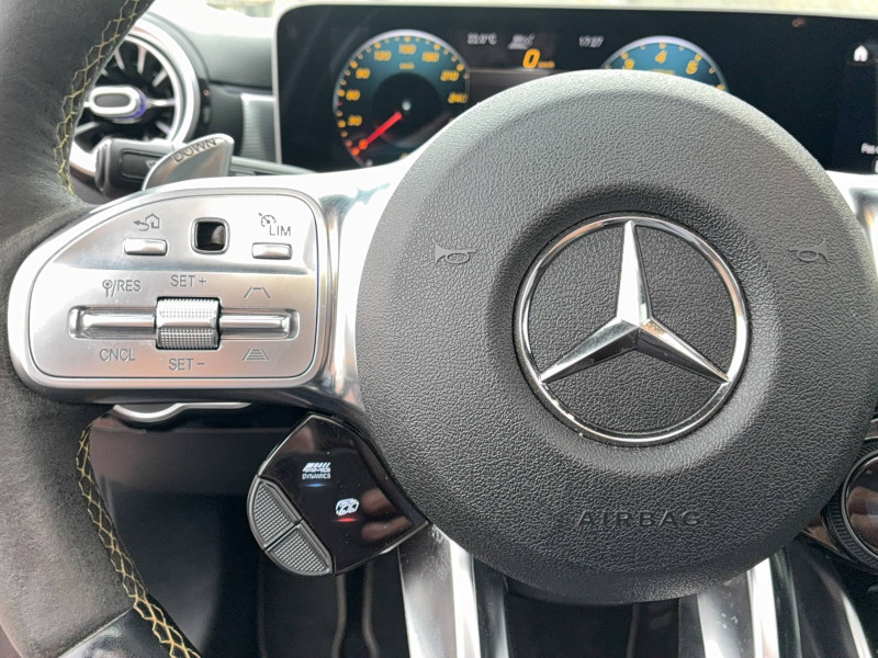 Affichage de l'état des ceintures AR (bouclées/non bouclées) sur le combiné d'instruments / Ailes AMG élargies avec inscription TURBO 4MATIC+ / AMG Driver's package Vitesse maxi de 270 km/h / AMG Real Performance Sound / Application AMG Track Pace / Assistant limitation de vitesse / Baguettes de seuil éclairées avec l'inscription Mercedes-Benz / Boîte de vitesse automatique à 8 rapports 8G-DCT SPEEDSHIFT AMG / Buses de ventilation avec cerclage chromé et insert rouge / Capot moteur actif / Capot moteur avec bossages / Car-to-X Communication / Certification EURO-NCAP / Ciel de pavillon en tissu Noir / Console centrale AMG en finition noir brilliant / Déflecteur AMG sur le toit / Désactivation automatique de l'airbag passager / Deux doubles enjoliveurs de sorties d'échappement / Direction paramétrique / Documents COC Euro 6 Partie II / Double porte-gobelets / DYNAMIC SELECT / Eclairage d'ambiance / Elargissement du passage de roue pour jantes AMG / Equipement pour radio digitale / Essieu AR multibras / Essuie-glaces avec détecteur de pluie / Etriers de frein peints en rouge / Filet de rangement au dos des sièges AV / Filtre à particules pour moteur essence / Fonctionnalités élargies MBUX / Frein de stationnement électrique / Garniture en Similicuir ARTICO/microfibre DINAMICA Noir avec surpiqûres Jaunes / Habillages de bas de caisse AMG / Inserts chromés sur les lamelles des prises d'air et splitter AV chromé / Inserts décoratifs en aluminium AMG Noir/Argent / Inserts décoratifs en Aluminium Clair à stries longitudinales / Instrumentation digitale avec écran 10" / Jantes alliage AMG 19" 5 doubles branches finition Gris Tantale/Argent, pneus 245/35 R19 / Kit anticrevaison TIREFIT / Kit carrosserie AMG / Ligne de ceinture chromée / Ligne d'échappement AMG avec niveau sonore modulable entre sportivité chargée en émotion et discrétion toute en retenue / MBUX système multimédia / Navigation par disque dur / Norme EURO 6 / Pack Premium Plus / Pack Rétroviseurs / Pack Visibilité / Pare-soleil avec miroir de courtoisie éclairé / Pavé tactile TOUCHPAD / Pédalier Sport en aluminium avec picots / Prééquipement pour Live Traffic Information / Prééquipement pour réglages du véhicule à distance / Pré-équipement pour service d'autopartage / Prééquipement pour suivi du véhicule à distance / Projecteurs MULTIBEAM à LED / Radio digitale / Range-lunettes intégré / Régulateur de vitesse TEMPOMAT avec limiteur de vitesse / Régulation du comportement dynamique (ESP) à 3 niveaux disponibles via la touche ESP / Réservoir de carburant 51 L / Rétroviseurs extérieurs électriques avec rappel de clignotants / Siège conducteur tout électrique avec fonction Mémoires / Siège passager AV électrique avec fonction Mémoires / Soutien lombaire à 4 réglages / Standard Europe / Système d'appel d'urgence Mercedes-Benz / Système d'échappement AMG avec deux doubles sorties rondes de 90 mm / Système de commande vocale et assistant personnel activable grâce à "Hey Mercedes" / Système de freinage hautes performances AMG avec étriers de frein dans le ton argent et monogramme AMG noir à l´AV / Système de sonorisation Surround Burmester / Tapis de sol AMG / Touches du volant AMG / Train de roulement sport AMG / Transmission intégrale 4MATIC+ Performance AMG avec TORQUE CONTROL / Volant Performance AMG en cuir Nappa/microfibre DINAMICA
