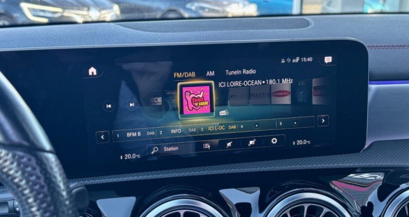 Cylindrée : 1332 cm3 EQUIPEMENTS DE SERIE ========================= ABS (antiblocage de roues) et ASR (antipatinage) Accoudoir central AV ADAPTIVE BRAKE avec fonction Hold, aide au demarrage en cote, pre-remplissage et sechage des freins Affichage de l'etat des ceintures AR (bouclees/non bouclees) sur le combine d'instruments Aide au parking active avec PARKTRONIC Airbag genoux pour conducteur Airbags frontaux conducteur et passager AV Airbags lateraux pour le conducteur et le passager AV (airbags combines thorax et bassin) Airbags rideaux AMG Line Assistant de stabilisation en cas de vent lateral Assistant limitation de vitesse ATTENTION ASSIST: Systeme de detection de somnolence Avertisseur de franchissement de ligne actif Baguettes chromees autour du vitrage lateral Baguettes de ligne de ceinture et entourages de vitres chromes Baguettes de seuil avec inscription Mercedes Benz Banquette AR rabattable 40/20/40 BAS (Freinage d'urgence assiste) Bas de caisse AMG dans le ton carrosserie Boite a gants eclairee Boite de vitesse automatique 7G-DCT Buses de ventilation noirs avec cerclage chrome Calandre diamant avec pastilles chromees et lamelle avec inserts chrome Camera de recul Capot moteur actif pour la protection des pietons Capteur de pluie et de luminosite Certification EURO-NCAP Ciel de pavillon en tissu noir Climatisation automatique THERMOTRONIC Conduite a gauche Connexion Bluetooth pour telephone portable Controle de la pression des pneumatiques Desactivation automatique de l'airbag passager AV Direction parametrique Sport Disques de freins AV perfores Dossiers AR rabattables 40/20/40 Double porte-gobelets DYNAMIC SELECT DYNAMIC SELECT avec 4 modes de conduite (ECO - sauf boite mecanique, Confort, Sport et Individual) Ecran media 10 Elements en chrome sur le volant Equipement pour radio digitale ESP (correcteur electronique de trajectoire) Essieu AR multibras Essuie-glaces avec detecteur de pluie Etriers de frein avec logo Mercedes-Benz Feux AR a technologie LED Feux de stop adaptatifs Filet de rangement au dos des sieges AV Fixations iSize pour siege-enfant avec sangle Top Tether aux places exterieures AR Fonction de demarrage sans cle KEYLESS-GO Fonctionnalites elargies MBUX Frein de stationnement electrique avec fonction Start Assist Frein multicollision Freinage d'urgence assiste actif Garnitures en similicuir ARTICO/microfibre DINAMICA Noir avec surpiqures Rouges Grille de calandre diamant a 1 lamelle avec pastilles chromees Habillages des bas de caisse AMG peints dans le ton carrosserie Hayon Easy-Pack a ouverture et fermeture automatiques Inserts decoratifs en Aluminium Clair a stries longitudinales Instrumentation digitale avec ecran 7 (18 cm) Interface USB-C dans le vide-poches et 2 interfaces USB-C sur la console centrale AR Jantes alliage AMG 45,7 cm (18) a 5 doubles branches Gris tremolite/argent, Jupe AR AMG avec insert decoratif chrome Jupe AV AMG avec insert decoratif chrome Jupe AV AMG avec splitter chrome Kit anti-crevaison TIREFIT Kit carrosserie AMG Manuel d'utilisation en francais MBUX systeme multimedia Module de communication LTE pour l'utilisation des services Mercedes connect me Navigation par disque dur Pack Advantage Pack AMG Line Pack Retroviseurs Pack Sieges Confort Pack Standard Europe Pack Stationnement avec camera de recul Pack Visibilite Pare-soleil avec miroir de courtoisie eclaire Partie centrale des contre-portes/accoudoirs recouverts de microfibre DINAMICA noire avec doubles Pave tactile TOUCHPAD Pedalier AMG en acier inoxydable brosse avec picots en caoutchouc Pedalier sport AMG en acier brosse avec picots en caoutchouc Peinture non metallisee Noir Pre-equipement pour service d'autopartage Preequipement pour Live Traffic Information Preequipement pour reglages du vehicule a distance Preequipement pour service de partage de cle Preequipement pour suivi du vehicule a distance Preinstallation pour radio digitale Prise 12 V dans le vide-poches Prise 12 V dans le vide-poches de la console centrale Projecteurs LED hautes performances Radio digitale Regulateur de vitesse TEMPOMAT avec limiteur de vitesse Services a distance Sieges AV Sport Sieges AV Sport avec reglages de la hauteur et de l'approche du siege, de l'inclinaison du dossier, Sorties d'echappement apparentes chromees Sorties d'echappement chromees (non fonctionnelles) Systeme d'appel d'urgence Mercedes-Benz Systeme de commande vocale et assistant personnel activable grace a Hey Mercedes Systeme de freinage sport Tapis de sol AMG Train de roulement confort avec chassis surbaisse Trousse de premiers secours et triangle de signalisation Volant a gauche Volant sport multifonction a 3 branches en cuir Nappa, avec meplat, perforations au niveau Volant Sport multifonction en cuir Nappa OPTIONS PRESENTES SUR CE VEHICULE ========================= Avertisseur d'angle mort : 550.00€ Eclairage d'ambiance : 400.00€ Instrumentation digitale avec ecran 10 : 550.00€ Integration pour Smartphone : 400.00€ MBUX Realite augmentee pour la navigation : 500.00€ Pack Confort KEYLESS-GO : 0.00€ Pack Premium Plus : 3600.00€ Projecteurs MULTIBEAM a LED : 500.00€ Siege conducteur tout electrique avec fonction Memoires : 0.00€ Siege passager AV electrique avec fonction Memoires : 0.00€ Sieges AV chauffants : 400.00€ Soutien lombaire a 4 reglages : 250.00€ Systeme de sonorisation Advanced : 400.00€ Toit ouvrant panoramique : 1150.00€ Vitrage athermique fonce : 400.00€