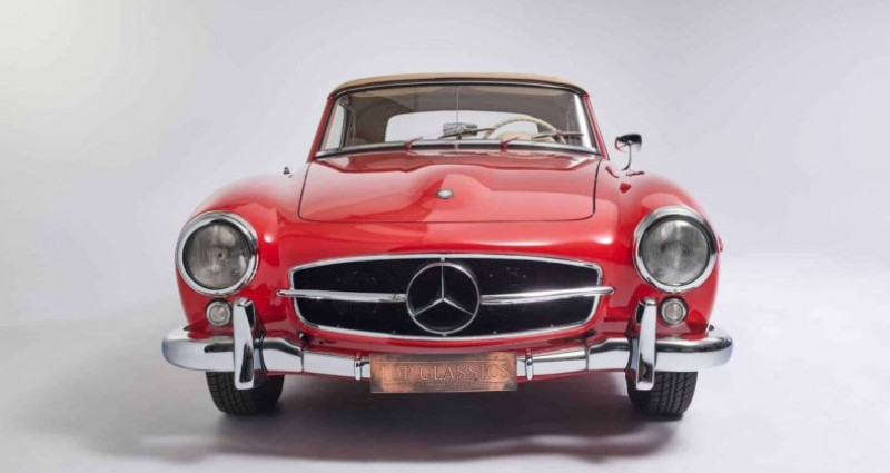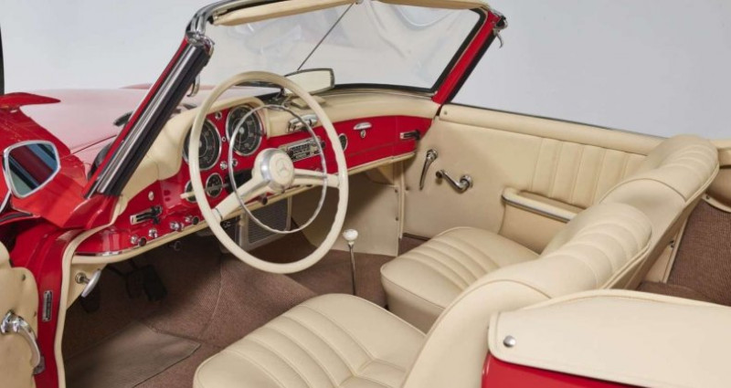 1956 Cabriolet / roadster ?1?500 km TOP CLASSICS, spécialiste MERCEDES CLASSIC vous propose parmi sa collection de 190 SL ce magnifique modèle de 1956, rouge « DB 534 fire engine RED », intérieur blanc, complétement restauré. Nos restaurations, entièrement effectuées dans nos ateliers, sont complètes : carrosserie, moteur, carburateurs, boite, pont, faisceau, châssis, intérieur, instruments de bord, chrome … Le soft top totalement neuf est… > de couleur crème. Ce modèle en particulier a été restauré en 2020 et a été utilisé que 1500 km par notre client. Nous faisons les contrôles et une nouvelle révision pour le prochain propriétaire. Pour plus de photos et de détails sur nos projets de restauration, consultez notre site internet « topclassics ». Découvrez l’expérience Top Classics, votre voiture dans un état neuf, garantie 2 ans, immatriculée en carte grise collection et livrée à domicile sur toute la France métropolitaine. Voir toutes les annonces du modèle Mercedes-Benz SL