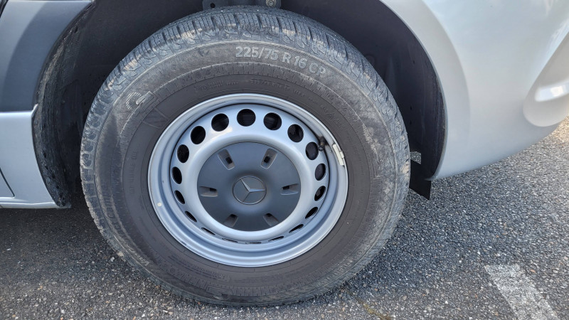 Borne auxiliaire pour aide au démarrage / Jantes acier 6,5 J x 16" / Prédisposition faisceau d'attelage / Assistance en cas de panne / Batterie de puissance accrue / Boîte mécanique à 6 rapports / Cloison entière / Cric / Essieu AV avec capacité de charge augmenéee / Feux de gabarit latéraux / Fonction Stop/Start ECO / Indicateur de température extérieure / Marchepied porte AR / Mesures d'insonorisation / Module de communication (LTE) pour services numériques / Norme antipollution Euro 6c N1 cl.III/N2 / Plombage du mécanisme d'impulsion du tachymètre / Pneumatiques 225/65 R16 C / Pneumatiques sans prescriptipon de marque / Pneumatiques été / Pneus faible résistance à roulement / Poignée d'accès sur le montant d'angle AR droit / Poignée maintien sur cloison séparation porte coulissante AR / Porte coulissante droite / Pré-équipement véhicule pour charge remorquée maxi 2000 kg / Renfort de longeron / Réservoir principal 65 litres / Siège conducteur confort / Siège passager AV à 2 places / Support roue de secours sous l´extrémité du cadre / Système d'appel d'urgence Mercedes-Benz / Système de dépollution des gaz SCR génération 3 / Système de stabilisation en cas de vent latéral / Tachymètre avec graduation en km/h / Tempomat / Tissu Maturin noir / Toit surélevé / Troisième feux stop