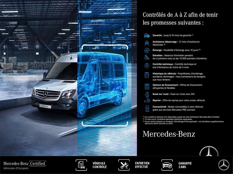316 CDI 43 S-3T5 - 30 800 HT, diesel, blanc, 22/07/2020, Plancher en bois, Europe, MBUX Système multimédia àécran tactile 7 pouces, Gaine de câbles sur paroi latérale, Triangle de signalisation dans porte conducteur, Masse de référence minimum de 2 381 kg nécessaire, Assistance en cas de panne, Stabilisation niveau I, Poignée accès sur montant d?angle arrière droit, Pack Stationnement avec caméra de recul, Prédisposition faisceau d? attelage, Rangements cabine au-dessus conduc et passagers, Jantes acier 6,5 J x 16, sans augm./dimin. P.T.A.C. : 3500 kg, Dotation Europcar, Troisième feu stop, Siège suspendu confort pour le conducteur, Sprinter série C907/C910, Portes arrière à deux battants, ouverture à 270°, Moteur OM 651 DE 22 LA de 120 kW (163 ch) à 3 800 tr/min, Code de contrôle essieu arrière, grand couronne 215, Rails arrimage paroi lat. au niveau cadre de toit, Rétroviseurs extérieurs chauffants à réglage élec., Porte coulissante à droite, Zone climatique 1 (froid/confort), Batterie AGM 12 V 70 Ah, Bouchon de réservoir à gazole rouge, Certificat d immatriculation, partie II, Climatiseur semi-automatique TEMPMATIC, Suppression Fonction Stop/Start ECO, Réservoir principal 71 l, Détecteur de pluie, Volant réglable en hauteur et en inclinaison, Renfort de longeron, Caissons de roues supportant une charge, Indicateur du point de passage des rapports, Banquette passager avant à 2 places, Poignée accès latéral compartiment de chargement, Mercedes-Benz MobiloVan avec carnet de maintenance en ligne et garantie anticorrosion, OBD (On Board Diagnostics) niveau D, Cloison de séparation continue, Pack Protection antivol, Rapport de pont i = 3,692, Empattement 4 325 mm, porte-à-faux 1 615 mm, Code Allemagne, Autoradio numérique (DAB), WET WIPER SYSTEM, Toit surélevé, Système de rails pour l? arrimage du chargement, Gaine de câbles sur encadrement arrière, Marchepied à l arrière, Plafonnier(s) compartiment passagers/de chargement avec contacteur de porte, Rails d arrimage dans panneau latéral, au niveau de la ligne de bas de glaces, Pack Charge planche de bord, 3,5 tonnes, Siège conducteur chauffant, Volant multifonctions, Allumage automatique des phares, Plaques/imprimés en allemand, Pneus toutes saisons, Anneau de remorquage arrière, Accoudoir pour siège conducteur, Boîte de vitesses méca à 6 rapports ECO Gear 360, Système de stabilisation en cas de vent latéral, Frein de stationnement électrique, Airbag conducteur, Tissu Maturin noir, Trousse de secours dans porte passager avant, Vitres teintées, TEMPOMAT, Feux de position latéraux, Habillage zone chargement jusqu au toit (bois), Pneus 235/65 R16 C, Serie C907 VS30 propulsion AR, Vide-poche au-dessous du tableau de bord, Cadre de grille de calandre ton carrosserie