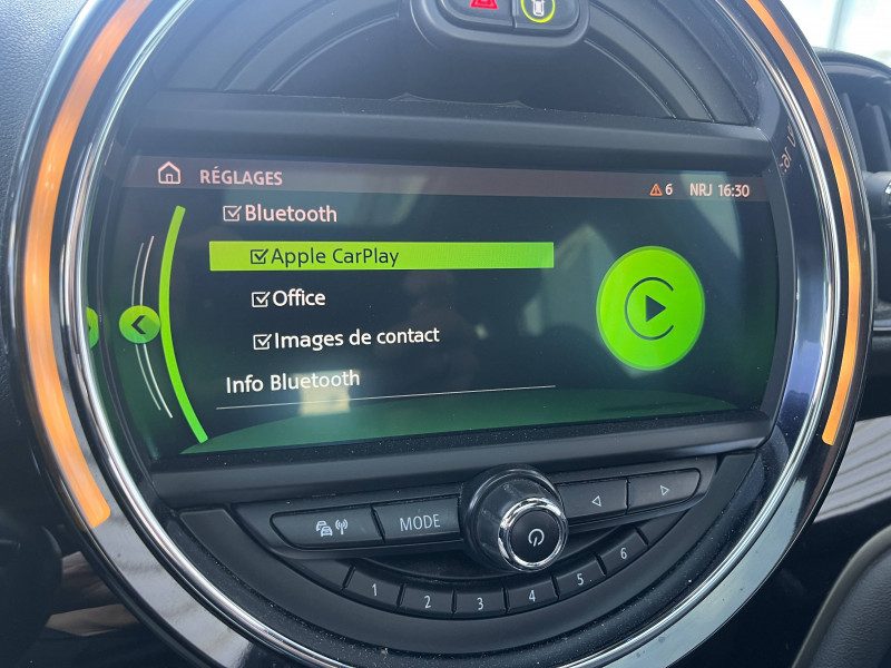 3ème feu stop à LED dans le spoiler de toit / Détecteur de pluie et allumage automatique des projecteurs / Eclairage de la boîte à gants à LED (blanc) / Eclairage du coffre à LED, à droite (blanc) / Eclairage intérieur et liseuses à LED à l'AV/à l'AR (blanc) / Jantes en alliage 18" design "Black Pin Spoke", 7.5 J × 18 / pneumatiques 225/50 R18 / Jantes en alliage léger 16'' design "Revolite Spoke" 7Jx16" et pneumatiques 205/55 R16 / Pack Connected Navigation / Projecteurs Full LED à faisceaux adaptatifs à fond noir / Système de manoeuvres automatiques / Toit ouvrant panoramique en verre / 4HP et 2 woofers / Airbags de tête pour les 4 places extérieures / Autoradio MINI Visual Boost / Avertisseur de risque de collision et système anti-collision / Baguette en chrome sur le pourtour inférieur de toutes les vitres / Banquette AR coulissante Réglage longitudinal des sièges AR sur 13 cm, division 60:40 de la surface d'assise. Dossier rabattable 40:20:40. Réglage du dossier en positions Cargo et Confort / Boîte de vitesses 7 rapports à double embrayage / Ciel de pavillon anthracite / Clignotants blancs / Colour Line Carbon Black / Commande électrique du hayon / Connectivité avancée et recharge sans fil par induction / Coques de rétroviseurs extérieurs couleur carrosserie / Eclairage en cascade (orange) / Ecrous de roues antivol / Feux de stop dynamiques / Frein à main électrique / Kit de réparation de pneus / Kit Eclairage / Kit Rangement / MINI Connected / MINI Safety (Assistance à la conduite) / Ordinateur de bord multifonctions / Poignée de hayon en schwarz à haute brillance / Poignées de portes en chrome / Poignées intérieures de portes chromées / Porte-boissons AV (x2) / Prise 12 V dans la console centrale AV / Rails de toit piano black avec insert de jupes latérales piano black / Réglage en hauteur du siège passager AV / Régulateur de vitesse avec fonction freinage / Servotronic / Sortie d'echappement simple côté gauche avec finition chromée / Tapis de sol en velours / TeleServices / Touches multifonctions sur le volant avec régulateur de vitesse / Triangle de présignalisation