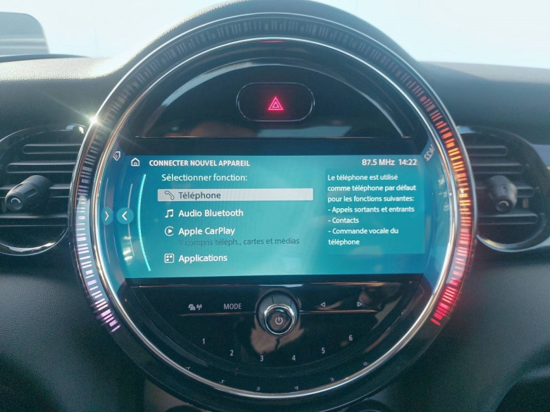 2 Airbags latéraux AV, intégrés au dossier de siège AV / 2ème clé radiocommandée / 2 HP et 2 woofers / 3ème feu de stop / Accoudoir central AV inclinable en 4 positions / Apple CarPlay à durée illimitée / Autoradio MINI Visual Boost avec ecran couleur 8,8'' tactile / Baguettes de seuil de porte avec inscription de la motorisation façon métallique / Barres de calandre Piano Black / Becquet AR de toit / Boîte de vitesses 7 rapports à double embrayage / Calandre au contour chromé / Ciel de pavillon Satellite Grey / Clignotants blancs / Colour Line teinte Carbon Black / Connectivité avancée et recharge sans fil par induction / Contrôle du freinage en courbe CBC / Coques de rétroviseurs dans la teinte de la carrosserie / Crash Sensor activation automatique en cas d'accident: déverrouillage des portes, éclairage intérieur, feux de détresse, coupure batterie et pompe à carburant / Détecteur de pluie et allumage automatique des projecteurs / DTC Dynamic Traction Control avec fonction EDLC / Eclairage d'ambiance / Ecran central 8,8" / Ecrous de roues antivol / Edition Camden / Feux AR à LED avec design Union Jack / Feux de stop dynamiques / Fixation ISOFIX AV avec désactivation de l'airbag passager AV / Fonction "Follow me home", éclairage d'accompagnement / Fonction profile: import/export des données et réglages véhicule / Fonction sécurité piéton avec capot actif / Fonction Start&Stop et démarrage sans clé / Freins à disques AV et AR ventilés à l'AV / Indicateur de pressions des 4 pneus et avertisseur automatique en cas de perte de pression d'au moins 25% sur un des pneus / Insert passager Camden / Inserts annulaires et surface décorative pour la planche de bord "Hazy Grey" / Instrumentation digitale avancée / Jantes alliage 6.5Jx16" (195/55 R16) design "Victory Spoke" noires / Kit de réparation de pneus / Kit Eclairage / Kit Rangement / Lève-vitres électriques AV avec commande à impulsion et protection anti-pincement / Lumière "bi-LED" claire et efficace pour feux de croisement et feux de route / MINI Driving Modes / MINI Safety (Assistance à la conduite) / Omission système de haut-parleurs HiFi Harman/kardon / Ordinateur de bord multifonctions / Ouïes de clignotant Camden / Ouverture et fermeture à distance des vitres et du TOE si équipé / Pack Connected Navigation / Pare-chocs AV/AR dans la couleur de la carrosserie / Poignée de coffre teinte noire / Poignée de malle AR teinte High-Gloss black / Poignées de portes chromées / Poignées intérieures de portes chromées / Porte-boissons AV (x2) / Prise 12V sous la console centrale / Réglage électrique de la portée des projecteurs / Réglage en hauteur du siège passager AV / Régulateur de vitesse avec fonction freinage / Remote Services / Rétroviseur intérieur anti-éblouissement électrochrome / Rétroviseurs rabattable électriquement et fonction anti-éblouissement côté conducteur / Seuils de portes Camden / Sièges AV Sport avec Sellerie Similicuir Carbon Black / Sortie d'echappement simple côté gauche / Surfaces intérieures Piano Black / Surveillance de l'éclairage extérieur / Système d'accès aux places AR Easy-Entry / Système de maintenance intelligent Condition Based Service (CBS) / Tapis de sol en velours / Teinte d'habitacle Carbon Black / TeleServices / Toit couleur carrosserie / Toit ouvrant panoramique en verre / Touches multifonctions sur le volant / Trappe à carburant côté droit / Triangle de présignalisation avec kit de premiers secours / Tuner DAB / Verrouillage automatique des portes dès 16 Km/h / Verrouillage centralisé des portes, du coffre et de la trappe à carburant / Vitre AR chauffante avec essuie-glace / Volant en cuir 3 branches réglable en hauteur et en profondeur avec insert Piano Black