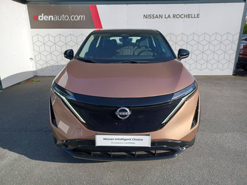 2 ports USB AV et 2 ports USB AR (Type-A et Type-C) / ABS (système antiblocage des freins) / Antenne aileron de requin / Arches latérales effet "chrome satiné" / Assistant Personnel Virtuel / Badge Nissan Charge offert pendant 1 an / Bandeau de feux AR LED / Câble de recharge EVSE Mode 2 10 A / Câble de recharge T2-T2 32 A / Cache-bagages amovible / Chargeur embarqué 7,4 kW / Combiné d'instrumentation digital avec écran 12,3'' TFT / Commandes au volant: contrôle de l'ordinateur de bord, audio, téléphone, régulateur et limiteur de vitesse / Compatibilité Google Assistant / Amazon Alexa / Connecteur Combo CCS 130 kW / Contrôle vocal Nissan / Eclairage d'ambiance Andon à motifs "Kumiko" (plancher + portes AV) / e-Pedal Step / Feux de détresse à déclenchement automatique / Feux de route intelligents LED à allumage automatique / Feux diurnes LED avec système Follow Me Home / Freinage d'urgence AR intelligent avec détection piéton et cyclistes et intersections / Freinage d'urgence intelligent avec détection piétons, cyclistes et intersections / Frein de stationnement électrique / Modes de conduite (Sport, Normal et Eco) / NissanConnect Services - Services télématiques avec accès à distance depuis un smartphone - Informations sur le niveau de charge et l'autonomie restante - Informations sur l'historique d'éco-conduite - Activation de la recharge - Contrôle de la température (chauffage ou climatisation) - Contrôle de l'allumage des phares et klaxon - Verrouillage / Déverrouillage du véhicule - Alerte de pression des pneus - Localisation du véhicule - Aide et assistance Nissan - Alertes intelligentes : notifications en cas de dépassement d'une vitesse, d'une zone ou d'un temps de conduite prédéfinis - / Peinture unie / Poche aumônière au dos des sièges AV et accoudoirs AR / Points d'ancrage pour sièges enfants ISOFIX à l'AR (x2) / Pompe à chaleur / Rétroviseur intérieur électrochromatique / Sièges AV ajustables manuellement 6 voies / Système actif de gestion de la température de la batterie (réchauffement et refroidissement) / Système d'alerte anticollision AR intelligent avec détection des objets en mouvement / Système d'alerte prédictif anticollision frontale / Système d'avertissement acoustique du véhicule (AVAS) / Système de navigation NissanConnect avec écran tactile 12,3" : Live Traffic et cartes 3D, Navigation porte-à-porte, Recherche par Points d'Intérêt, Google Street View, Vue Satellite et Météo, Mise à jour des cartes et logiciels, Prix des carburants, Commandes vocales avancées avec Amazon Alexa® / Système d'infodivertissement avec mise à jour à distance "Over The Air" / Système d'ouverture et de démarrage sans clé "Intelligent key" / Technologie ProPILOT Assist - avec Navi-Link - technologie de conduite assistée : Aide au maintien dans la voie, freinage anticipé dans les courbes via la navigation, assistant de conduite en embouteillage ,ajustement aux limitations de vitesse / Vitres électriques avec mode impulsionnel à l'AV et à l'AR et commande à distance