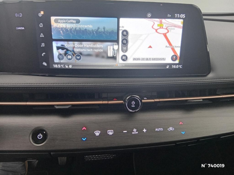Purificateur d'air / Rétroviseur intérieur électrochromatique / Sélection du mode de conduite (ECO, STANDARD et SPORT) / Sellerie mixte TEP/Tissu / Siège conducteur avec réglage lombaire électrique / Sièges AV ajustables électriquement 6 voies / Système actif de gestion de la température de la batterie (réchauffement et refroidissement) / Système d'alerte anticollision AR intelligent avec détection des objets en mouvement / Système d'alerte prédictif anticollision frontale / Système d'avertissement acoustique du véhicule (AVAS) / Système de navigation NissanConnect avec écran tactile 12,3" : Live Traffic et cartes 3D, Navigation porte-à-porte, Recherche par Points d'Intérêt, Google Street View, Vue Satellite et Météo, Mise à jour des cartes et logiciels, Prix des carburants, Commandes vocales avancées avec Amazon Alexa® / Système d'infodivertissement avec mise à jour à distance "Over The Air" / Système d'ouverture et de démarrage sans clé "Intelligent key" / Badge Nissan Charge offert pendant 3 ans / Bandeau de feux AR LED / Buses de ventilation AR / Câble de recharge EVSE Mode 2 10 A / Câble de recharge T2-T2 32 A / Cache-bagages amovible / Chargeur embarqué 7,4 kW / Antenne aileron de requin / Arches latérales effet "chrome satiné" / Assistant de conduite en embouteillage / Assistant Personnel Virtuel / Combiné d'instrumentation digital avec écran 12,3'' TFT / Commandes au volant: contrôle de l'ordinateur de bord, audio, téléphone, régulateur et limiteur de vitesse / Compatibilité Google Assistant / Amazon Alexa / Connecteur Combo CCS 130 kW / Contrôle vocal Nissan / Eclairage d'ambiance Andon à motifs "Kumiko" (plancher + portes AV) / e-Pedal Step / Feux de détresse à déclenchement automatique / Feux de route adaptatifs / Feux de route intelligents / Feux diurnes LED avec système Follow Me Home / Frein de stationnement électrique / Freinage d'urgence AR intelligent avec détection piéton et cyclistes et intersections / Freinage d'urgence intelligent avec détection piétons, cyclistes et intersections / Hayon électrique avec ouverture mains libres / Nissan AVM - Vision Intelligente à 360° / NissanConnect Services - Services télématiques avec accès à distance depuis un smartphone / Technologie de conduite assistée ProPILOT / Technologie ProPILOT Assist - avec Navi-Link - technologie de conduite assistée : Aide au maintien dans la voie, freinage anticipé dans les courbes via la navigation, assistant de conduite en embouteillage ,ajustement aux limitations de vitesse / Vitres électriques avec mode impulsionnel à l'AV et à l'AR et commande à distance / Vitres électriques avec mode impulsionnel AV et AR et commande à distance / Vitres latérales AR et vitre de hayon teintées / Volant chauffant / 2 ports USB AV et 2 ports USB AR (Type-A et Type-C) / NissanConnect Services liés à la navigation Alertes intelligentes : notifications en cas de dépassement d'une vitesse, d'une zone ou d'un temps de conduite prédéfinis. Historique de conduite et de navigation / Pare-brise chauffant / Peinture unie / Planificateur d'itinéraire intelligent / Poche aumônière au dos des sièges AV et accoudoirs AR / Points d'ancrage pour sièges enfants ISOFIX à l'AR (x2) / Pompe à chaleur