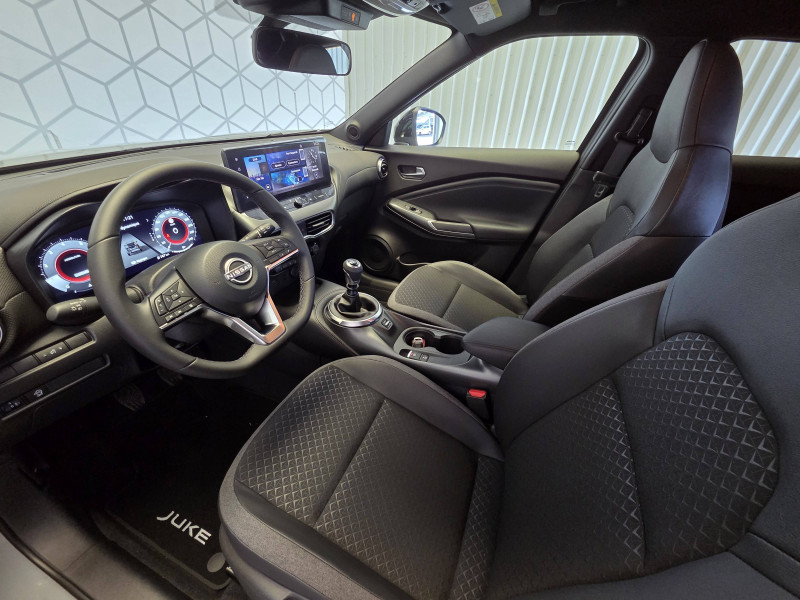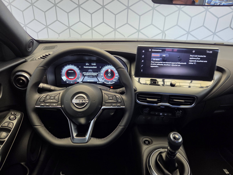6 HP (AV, portes AV et portes AR) / ABS (système antiblocage des freins) / Alarme périmétrique / Antenne aileron de requin Noir / Bacs de rangement dans les contre-portes AV avec porte-bouteilles / Boîte de vitesses manuelle 6 rapports / Bouton d'accès rapide aux réglages des aides à la conduite / Bouton de démarrage Start/Stop / Caméra de recul avec radars de stationnement AV et AR / Ceintures de sécurité AV ajustables en hauteur / Chargeur à induction pour Smartphone / Ciel de toit Noir / Clignotants à trois clignotements / Combiné d'instrumentation digital 12,3'' / Commandes au volant: contrôle de l'ordinateur de bord, audio, téléphone, régulateur et limiteur de vitesse / Contre-portes et tableau de bord en TEP noir / Direction assistée asservie à la vitesse / Double port USB AR (USB-A et USB-C) / Double port USB AV (USB-A et USB-C) / Eclairage d'accompagnement automatique / Eclairage du coffre / Feux de détresse à déclenchement automatique / Feux de route adaptatifs / Freinage d'urgence AR intelligent avec détection piéton et cyclistes / Indicateur de changement de rapport / Kit de réparation pneumatique / Liseuses AV et AR / NBAS (amplificateur de freinage d'urgence) / Pare-soleil côté conducteur et passager avec miroir de courtoisie / Peinture opaque monoton / Poignées de maintien pour passager AV et AR / Poignées de portes couleur carrosserie / Poignées intérieures d'ouverture de porte chromées / Points d'ancrage pour sièges enfants ISOFIX à l'AR / Pommeau de levier de vitesse cuir / Porte-cartes intégré au pare-soleil côté conducteur / Porte-gobelets (x2) / Repose-genoux en TEP noir / Rétroviseur intérieur électrochromatique / Sélection du mode de conduite (ECO, STANDARD et SPORT) / Sellerie Mixte TEP/Tissu Noir / Sièges AV avec appuis-tête intégrés / Spoiler AR / Système audio radio avec écran tactile 12,3" et reconnaissance vocale / Système "Chassis Control" : Intelligent Trace Control (contrôle actif de trajectoire) et Intelligent Ride Control (Contrôle actif de l'assiette) / Système de navigation NissanConnect avec écran tactile 12,3" : Live Traffic et cartes 3D, Navigation porte-à-porte, Recherche par Points d'Intérêt, Google Street View, Vue Satellite et Météo, Mise à jour des cartes et logiciels, Prix des carburants, Commandes vocales avancées avec Amazon Alexa® / Système d'ouverture et de démarrage sans clé "Intelligent key" avec fonction de verrouillage/ déverrouillage à l'approche du véhicule / Vitres AV/AR électriques avec mode impulsionnel côté conducteur et passager / Volant gainé de cuir synthétique