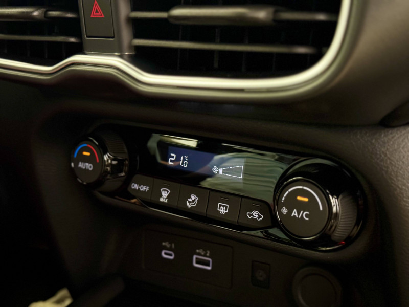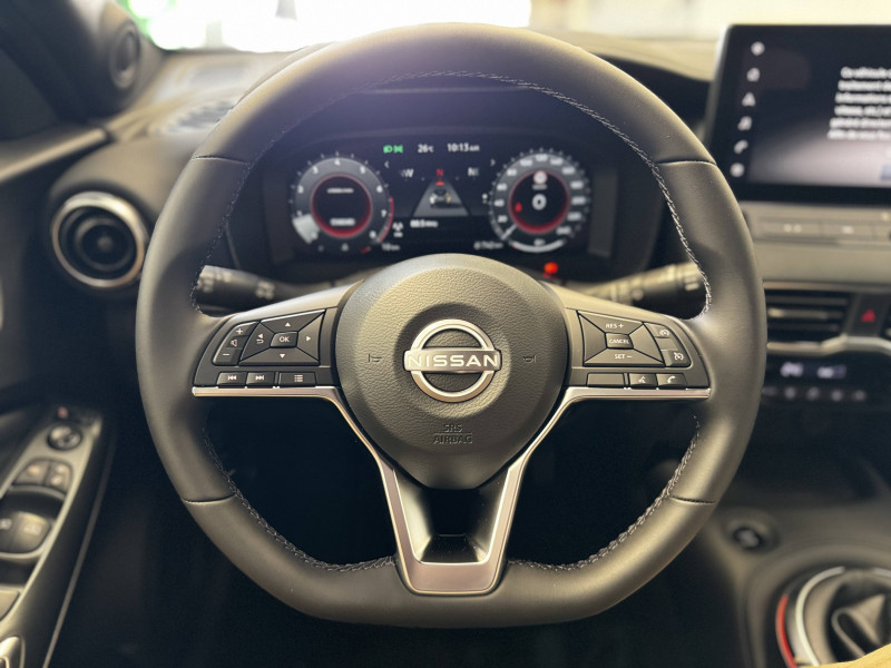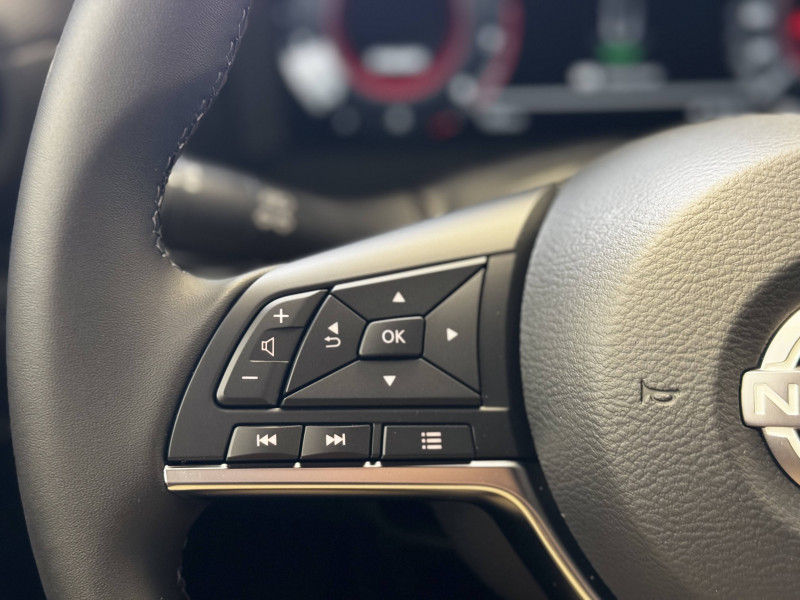 6 HP (AV, portes AV et portes AR) / ABS (système antiblocage des freins) / Alarme périmétrique / Antenne aileron de requin Noir / Bacs de rangement dans les contre-portes AV avec porte-bouteilles / Boîte de vitesses manuelle 6 rapports / Bouton d'accès rapide aux réglages des aides à la conduite / Bouton de démarrage Start/Stop / Caméra de recul avec radars de stationnement AV et AR / Ceintures de sécurité AV ajustables en hauteur / Chargeur à induction pour Smartphone / Ciel de toit Noir / Clignotants à trois clignotements / Combiné d'instrumentation digital 12,3'' / Commandes au volant: contrôle de l'ordinateur de bord, audio, téléphone, régulateur et limiteur de vitesse / Contre-portes et tableau de bord en TEP noir / Direction assistée asservie à la vitesse / Double port USB AR (USB-A et USB-C) / Double port USB AV (USB-A et USB-C) / Eclairage d'accompagnement automatique / Eclairage du coffre / Feux de détresse à déclenchement automatique / Feux de route adaptatifs / Freinage d'urgence AR intelligent avec détection piéton et cyclistes / Indicateur de changement de rapport / Kit de réparation pneumatique / Liseuses AV et AR / NBAS (amplificateur de freinage d'urgence) / Pare-soleil côté conducteur et passager avec miroir de courtoisie / Peinture opaque monoton / Poignées de maintien pour passager AV et AR / Poignées de portes couleur carrosserie / Poignées intérieures d'ouverture de porte chromées / Points d'ancrage pour sièges enfants ISOFIX à l'AR / Pommeau de levier de vitesse cuir / Porte-cartes intégré au pare-soleil côté conducteur / Porte-gobelets (x2) / Repose-genoux en TEP noir / Rétroviseur intérieur électrochromatique / Sélection du mode de conduite (ECO, STANDARD et SPORT) / Sellerie Mixte TEP/Tissu Noir / Sièges AV avec appuis-tête intégrés / Spoiler AR / Système audio radio avec écran tactile 12,3" et reconnaissance vocale / Système "Chassis Control" : Intelligent Trace Control (contrôle actif de trajectoire) et Intelligent Ride Control (Contrôle actif de l'assiette) / Système de navigation NissanConnect avec écran tactile 12,3" : Live Traffic et cartes 3D, Navigation porte-à-porte, Recherche par Points d'Intérêt, Google Street View, Vue Satellite et Météo, Mise à jour des cartes et logiciels, Prix des carburants, Commandes vocales avancées avec Amazon Alexa® / Système d'ouverture et de démarrage sans clé "Intelligent key" avec fonction de verrouillage/ déverrouillage à l'approche du véhicule / Vitres AV/AR électriques avec mode impulsionnel côté conducteur et passager / Volant gainé de cuir synthétique