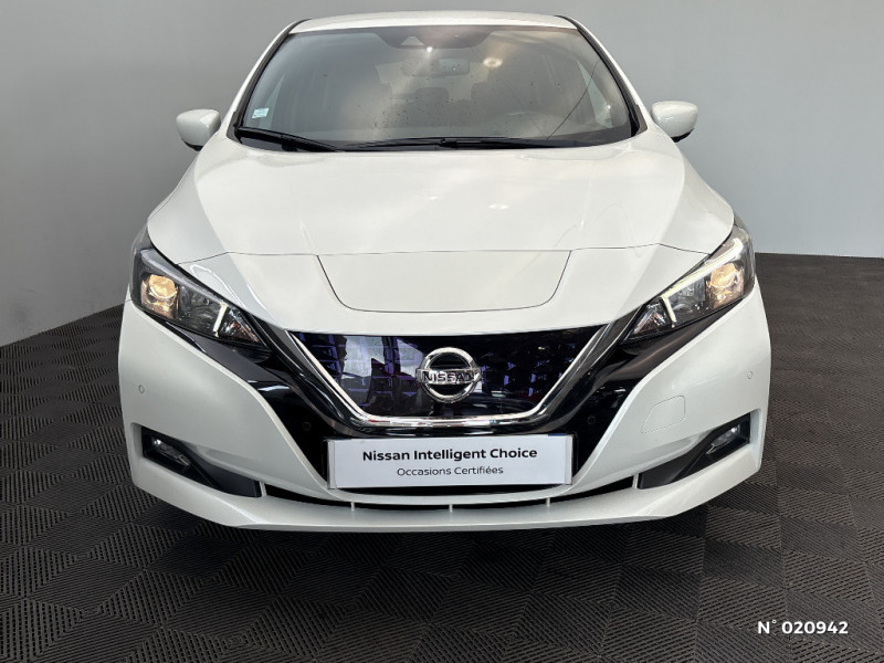 Poignées de portes chromées / Poches aumonières au dos des sièges AV / Pompe à chaleur / Programmation de la recharge / Rétroviseur intérieur électrochromatique / Rétroviseurs extérieurs couleur carrosserie avec clignotant à LED intégré / Sellerie cuir/tissu Noir ou Beige / Système audio CD/RDS 6HP avec commandes au volant et connexion USB pour iPod, lecteur MP3 / Système "Chassis Control" (contrôle actif de trajectoire et de l'assiette) / Système d'alerte anticollision AR intelligent / Système d'ouverture et de démarrage sans clé "Intelligent key" / Technologie E-pedal / Volant chauffant / ABS et EBD / Câble de 6m (pour recharge en 21h) / Câble 32A de 6m (pour recharge en 7h) / Chargeur embarqué de 6,6kW (pour recharge en 7h sur une wallbox de 32A) / Combiné d'instrumentation avec écran HD TFT 7" couleur / Connecteur pour chargeur rapide CHAdeMO (recharge à 80% en 40 min) / Déclenchement de la climatisation à distance / Déclenchement de la recharge à distance / Feux diurne LED avec signature lumineuse / Freinage d'urgence intelligent (AEB) avec détection piéton / Montant central de porte noir laqué / Nissan AVM - Vision Intelligente à 360° / Nissan Connect 7.0" / Nissan Connect 7.0" : Ecran tactile couleur 7,0", Caméra de recul avec repères de gabarit dynamiques Pilotage des services télématiques, Indication des points de charge avec mise à jour automatique, Système de navigation multimédia avec fonction Info Trafic, cartographie Europe 3D, indicateur d'éco-conduite, Système audio Bluetooth® (téléphone et musique), Radio numérique DAB, Connexion smartphone (Apple CarPlay et Android Auto) / Points d'ancrage pour sièges enfants ISOFIX à l'AR
