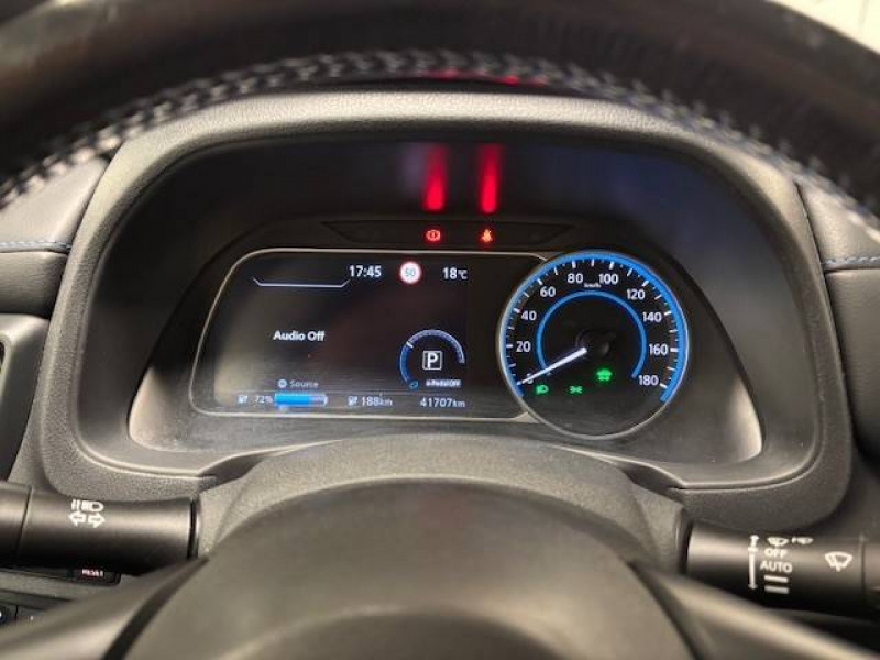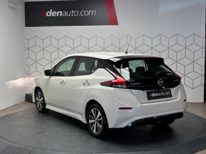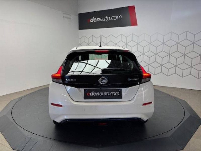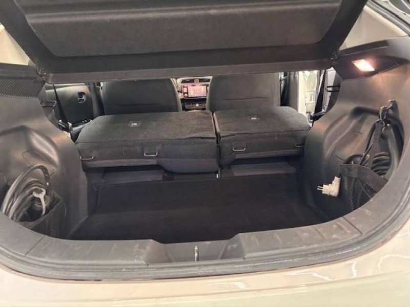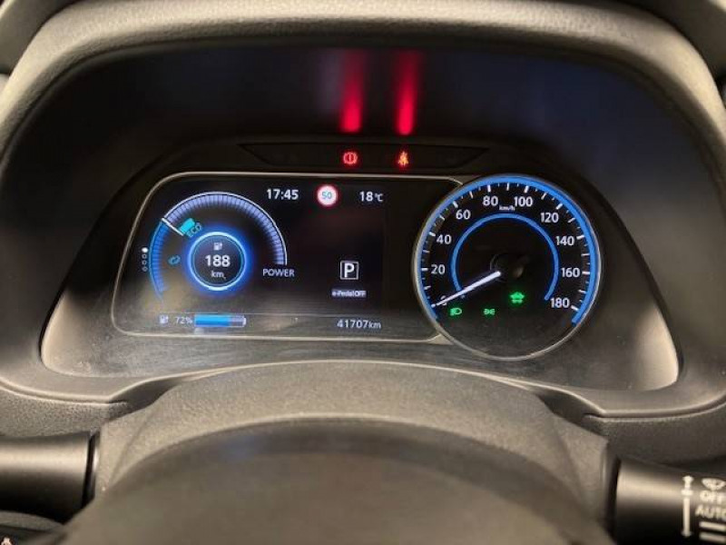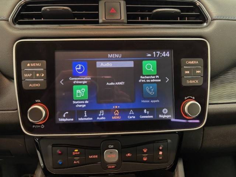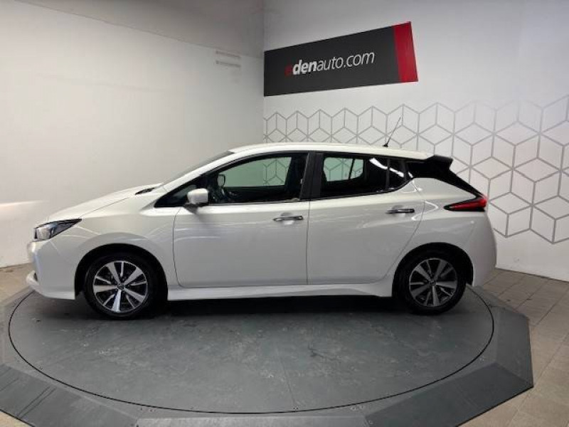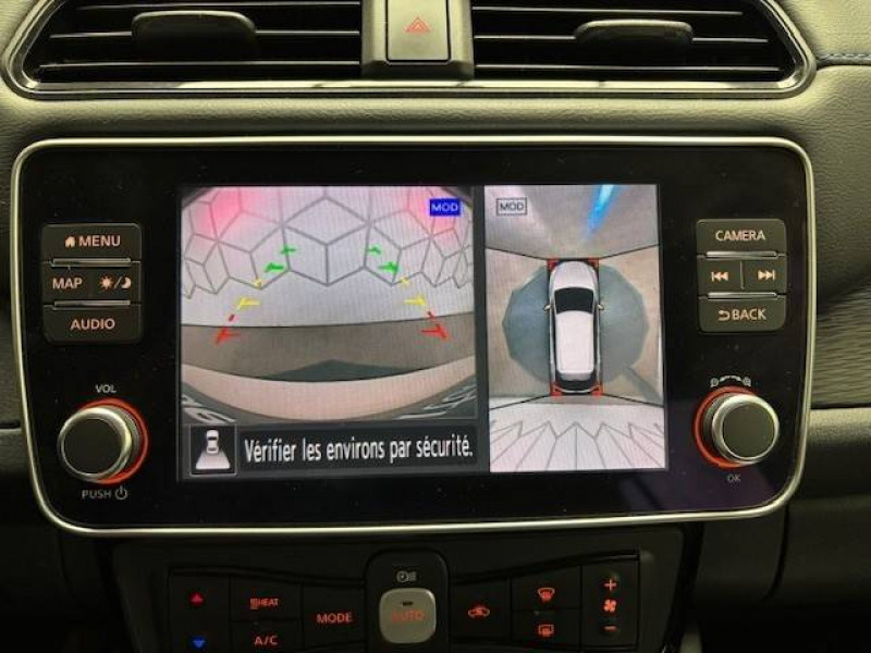 ABS et EBD / Câble 32A de 6m (pour recharge en 7h) / Câble de 6m (pour recharge en 21h) / Chargeur embarqué de 6,6kW (pour recharge en 7h sur une wallbox de 32A) / Combiné d'instrumentation avec écran HD TFT 7" couleur / Connecteur pour chargeur rapide CHAdeMO (recharge à 80% en 40 min) / Déclenchement de la climatisation à distance / Déclenchement de la recharge à distance / Feux diurne LED avec signature lumineuse / Freinage d'urgence intelligent (AEB) avec détection piéton / Nissan Connect 7.0" : Ecran tactile couleur 7,0", Caméra de recul avec repères de gabarit dynamiques Pilotage des services télématiques, Indication des points de charge avec mise à jour automatique, Système de navigation multimédia avec fonction Info Trafic, cartographie Europe 3D, indicateur d'éco-conduite, Système audio Bluetooth® (téléphone et musique), Radio numérique DAB, Connexion smartphone (Apple CarPlay et Android Auto) / Poches aumonières au dos des sièges AV / Poignées de portes chromées / Points d'ancrage pour sièges enfants ISOFIX à l'AR / Pompe à chaleur / Programmation de la recharge / Rétroviseurs extérieurs couleur carrosserie avec clignotant à LED intégré / Sellerie tissu Noir ou Gris Clair / Système audio CD/RDS 6HP avec commandes au volant et connexion USB pour iPod, lecteur MP3 / Système "Chassis Control" (contrôle actif de trajectoire et de l'assiette) / Système d'alerte anticollision AR intelligent / Système d'ouverture et de démarrage sans clé "Intelligent key" / Technologie E-pedal