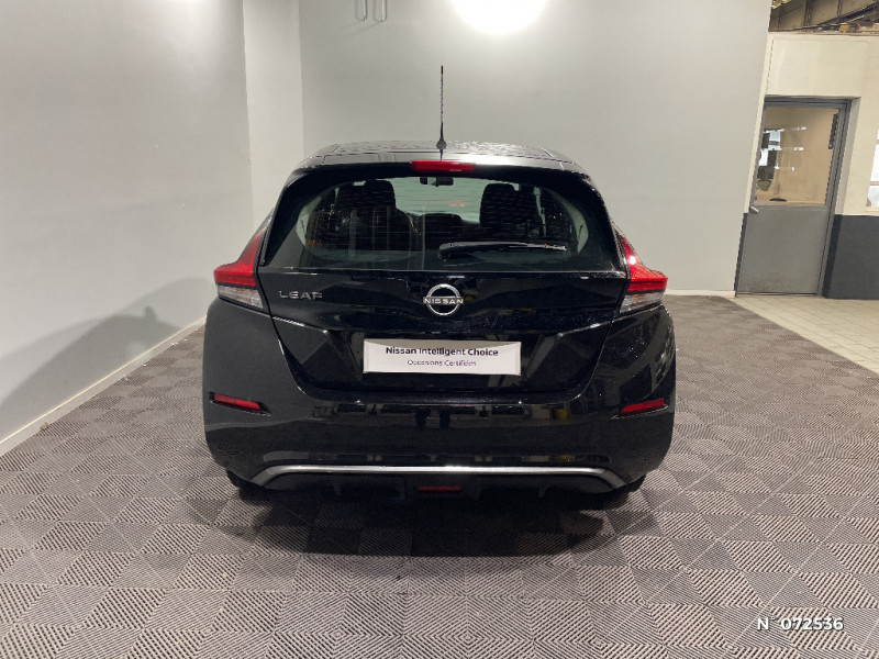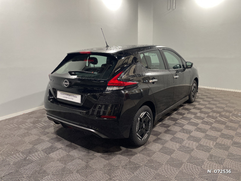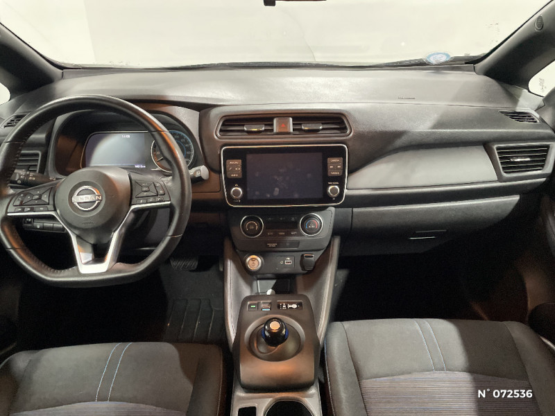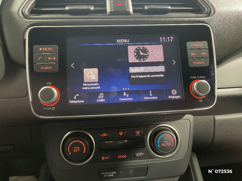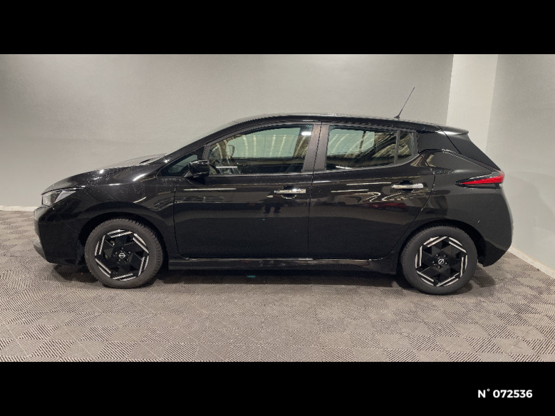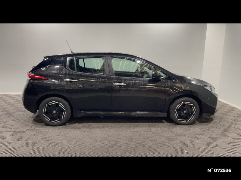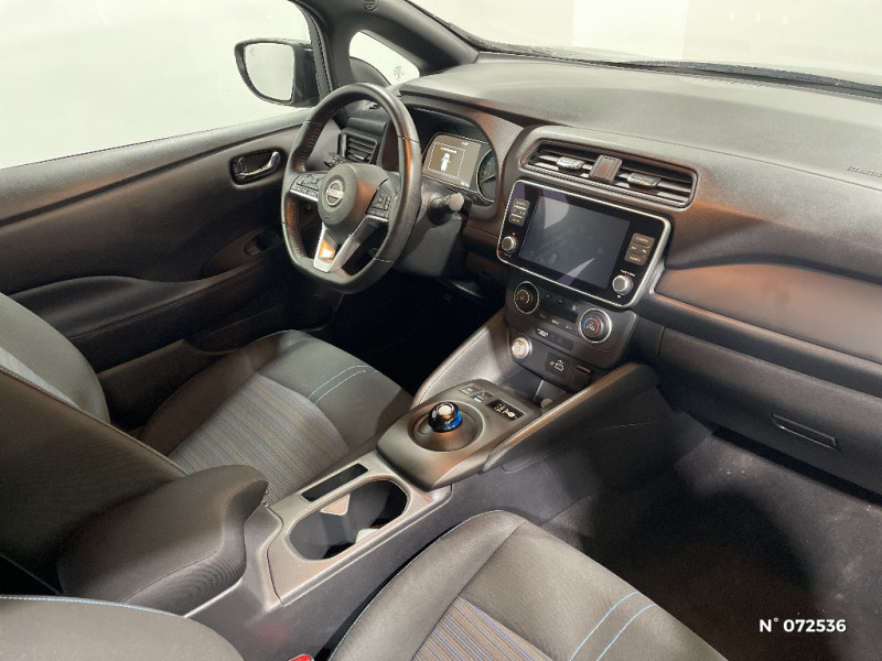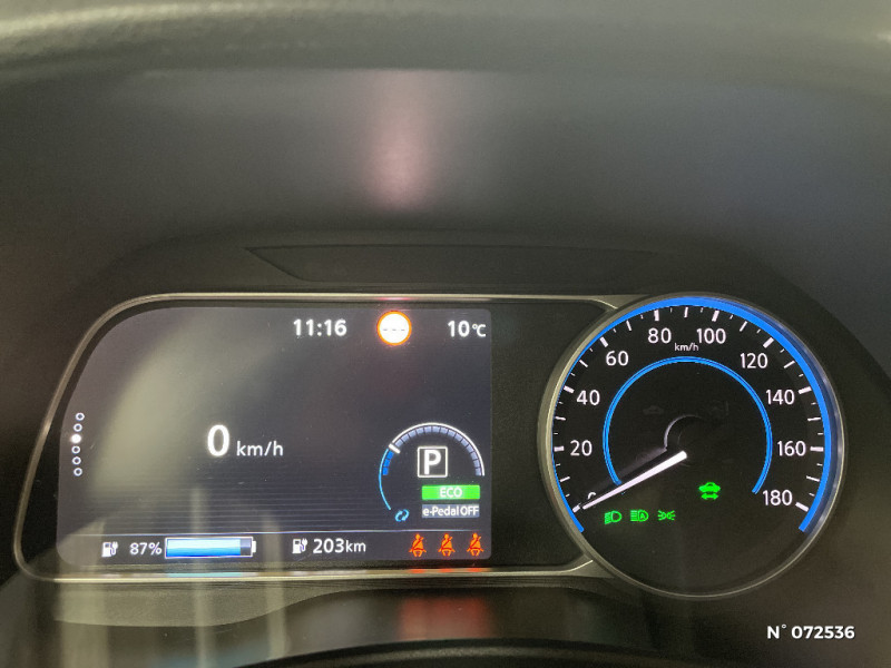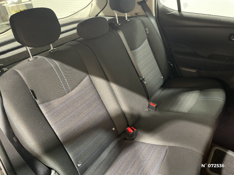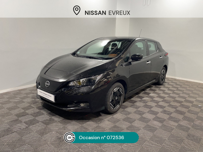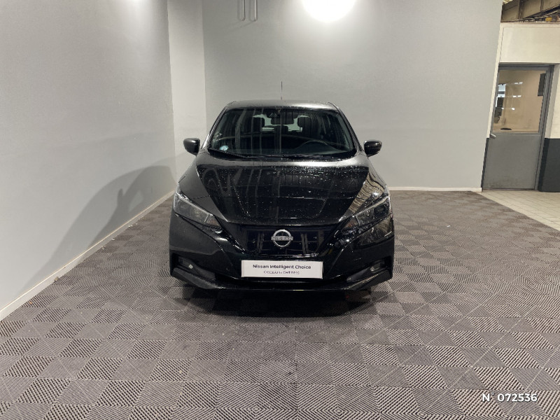 Sécurité enfants sur les portes AR / Sellerie tissu Noir ou Gris Clair / Son d'alerte pour piétons désactivable / Surveillance des angles morts incluant voyant lumineux sur rétroviseurs extérieurs / ABS et EBD / Allumage automatique des feux de détresse en cas d'accident / Câble de 6 m (recharge sur prise domestique 230V en 21h sur batterie 40 kWh ou 32h sur batterie 62 kWh) / Câble 32A de 6 m (recharge sur borne publique ou Wallbox 7 kW T2 en 7h30 sur 40 kWh ou 11h30 sur 62 kWh) / Chargeur embarqué de 6,6kW (pour recharge en 7h sur une wallbox de 32A) / Combiné d'instrumentation avec écran HD TFT 7" couleur / Commandes au volant (audio, Bluetooth, régulateur et limiteur de vitesses et contrôle de l'ordinate ur de bord) / Contrôle vocal Nissan / Eclairage de la trappe de recharge / Extinction temporisé des phares "Follow me home" / Feux AV halogènes avec signature lumineuse à LED / Feux de route intelligents / Feux diurne LED avec signature lumineuse / Freinage d'urgence intelligent (AEB) avec détection piéton / Indicateur de température extérieure / Kit de réparation pneumatique / Nissan Connect Services / Nissan Connect 8.0 / Ouverture de la trappe de recharge depuis la clé / Pack 100% Mobilité / Pare-soleil côté conducteur et passager avec miroir de courtoisie / Poches aumonières au dos des sièges AV / Poignées de portes chromées / Points d'ancrage de siège enfant ISOFIX à l'AV et 2 à l'AR / Port CHAdeMO pour chargeur rapide 50 kW (recharge de 20% à 80% en 60 min sur 40 kWh ou 90 min sur 62 kWh) / Port USB à l'AV (x1) et l'AR (x2) / Système "Chassis Control" (contrôle actif de trajectoire et de l'assiette) / Système d'alerte anticollision AR intelligent / Système de climatisation avec pompe à chaleur / Système d'ouverture et de démarrage sans clé "Intelligent key" / Technologie E-pedal / Trois appuis-tête aux places AR / 6 HP / Système audio Bluetooth, AM/FM, RDS, DAB, MP3, USB (sans CD) / Prise auxiliaire Jack 3,5 mm / Prise 12V sur console centrale AV / Programmation de la recharge / Rétroviseurs extérieurs couleur carrosserie avec clignotant à LED intégré