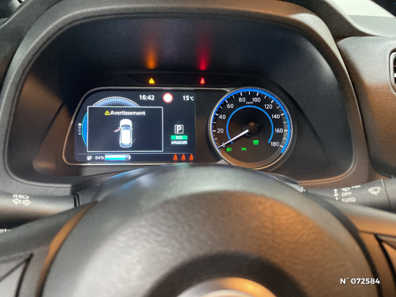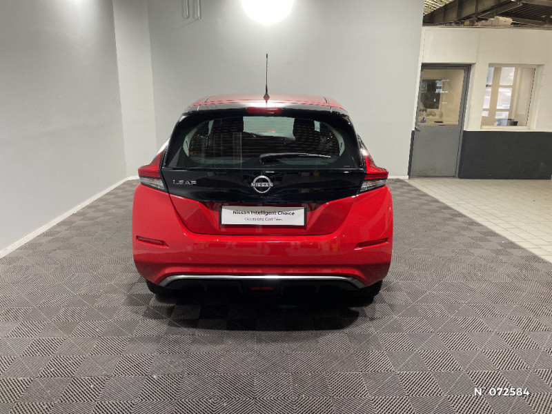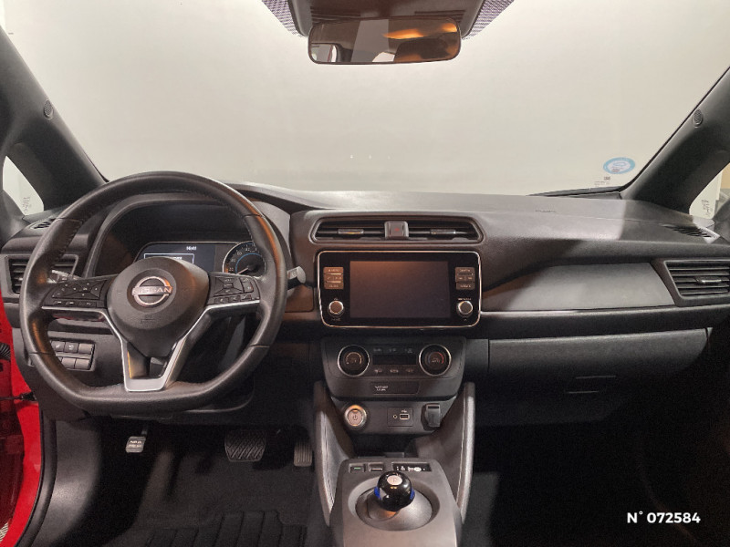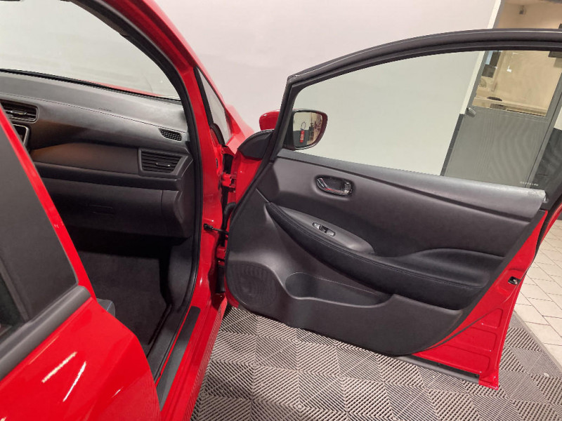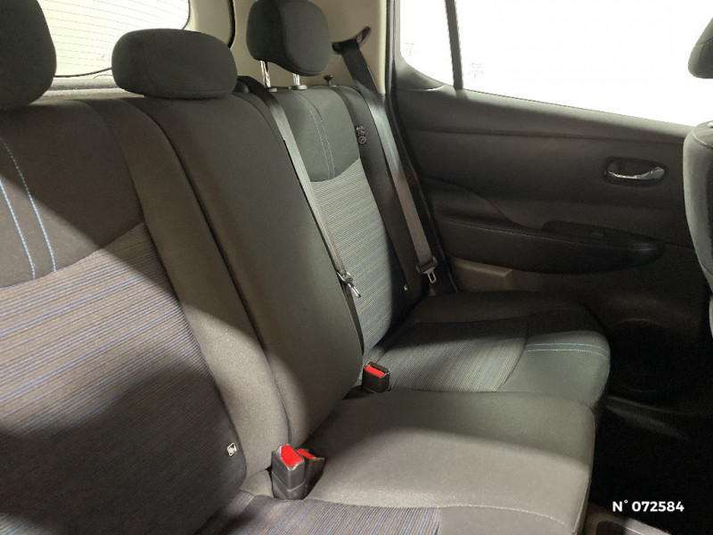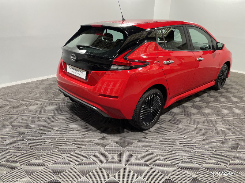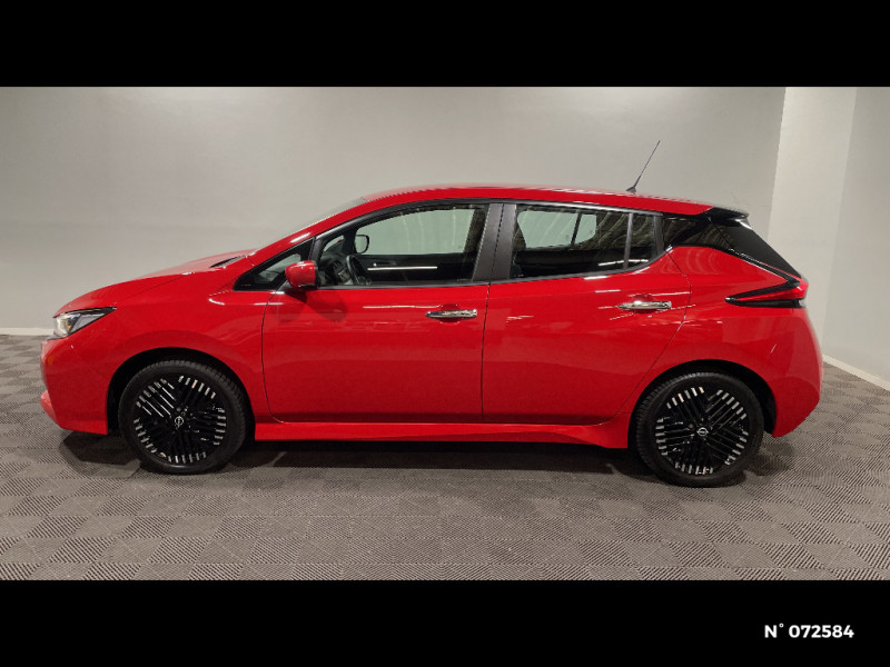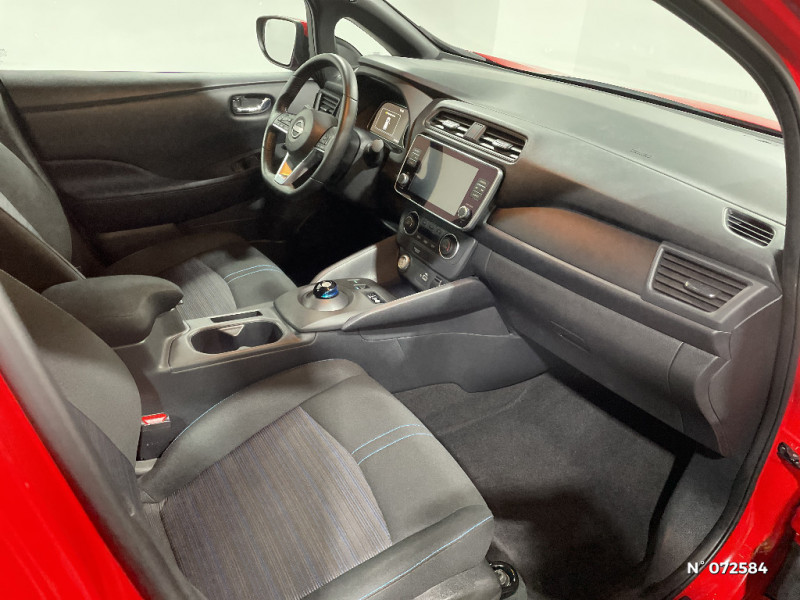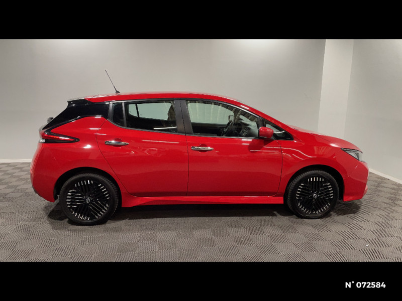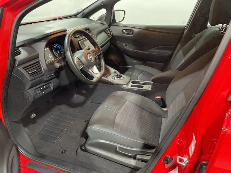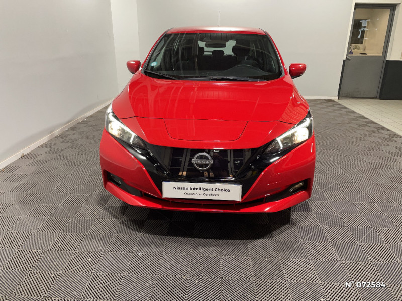 Nissan Connect Services / Nissan Connect 8.0 / Ouverture de la trappe de recharge depuis la clé / Pack 100% Mobilité / Pare-soleil côté conducteur et passager avec miroir de courtoisie / Poches aumonières au dos des sièges AV / Poignées de portes chromées / Points d'ancrage de siège enfant ISOFIX à l'AV et 2 à l'AR / Port CHAdeMO pour chargeur rapide 50 kW (recharge de 20% à 80% en 60 min sur 40 kWh ou 90 min sur 62 kWh) / Port USB à l'AV (x1) et l'AR (x2) / Son d'alerte pour piétons désactivable / Surveillance des angles morts incluant voyant lumineux sur rétroviseurs extérieurs / Système audio Bluetooth, AM/FM, RDS, DAB, MP3, USB (sans CD) / Système "Chassis Control" (contrôle actif de trajectoire et de l'assiette) / Système d'alerte anticollision AR intelligent / Système de climatisation avec pompe à chaleur / Système d'ouverture et de démarrage sans clé "Intelligent key" / Technologie E-pedal / Trois appuis-tête aux places AR / Kit de réparation pneumatique / 6 HP / Prise auxiliaire Jack 3,5 mm / Prise 12V sur console centrale AV / Programmation de la recharge / Rétroviseurs extérieurs couleur carrosserie avec clignotant à LED intégré / Sécurité enfants sur les portes AR / Sellerie tissu Noir ou Gris Clair / ABS et EBD / Allumage automatique des feux de détresse en cas d'accident / Câble de 6 m (recharge sur prise domestique 230V en 21h sur batterie 40 kWh ou 32h sur batterie 62 kWh) / Câble 32A de 6 m (recharge sur borne publique ou Wallbox 7 kW T2 en 7h30 sur 40 kWh ou 11h30 sur 62 kWh) / Chargeur embarqué de 6,6kW (pour recharge en 7h sur une wallbox de 32A) / Combiné d'instrumentation avec écran HD TFT 7" couleur / Commandes au volant (audio, Bluetooth, régulateur et limiteur de vitesses et contrôle de l'ordinate ur de bord) / Contrôle vocal Nissan / Eclairage de la trappe de recharge / Extinction temporisé des phares "Follow me home" / Feux AV halogènes avec signature lumineuse à LED / Feux de route intelligents / Feux diurne LED avec signature lumineuse / Freinage d'urgence intelligent (AEB) avec détection piéton / Indicateur de température extérieure