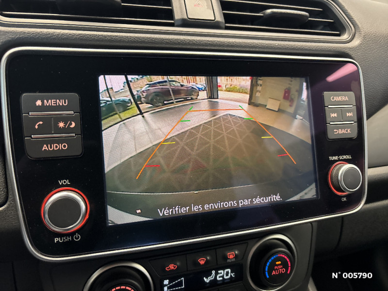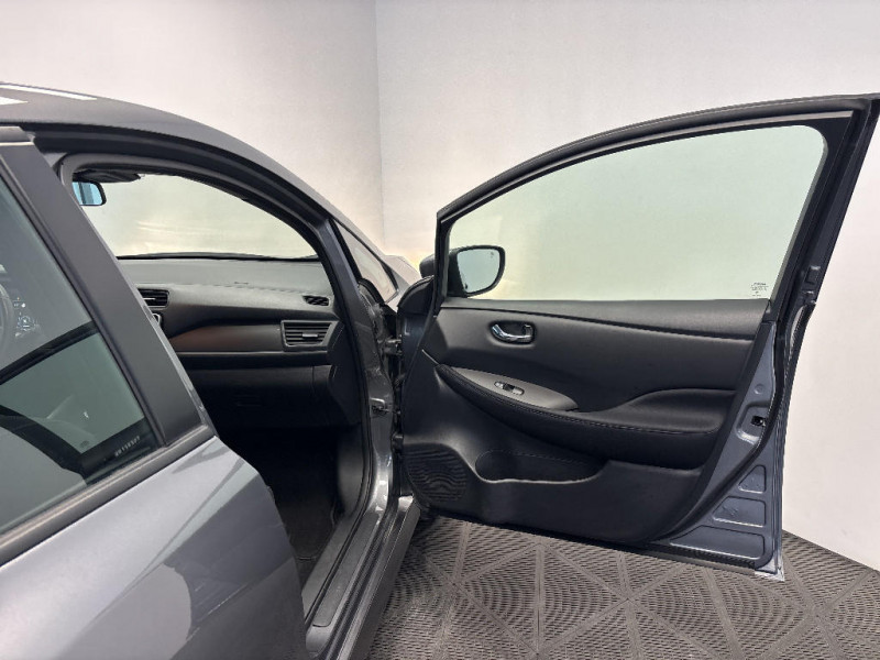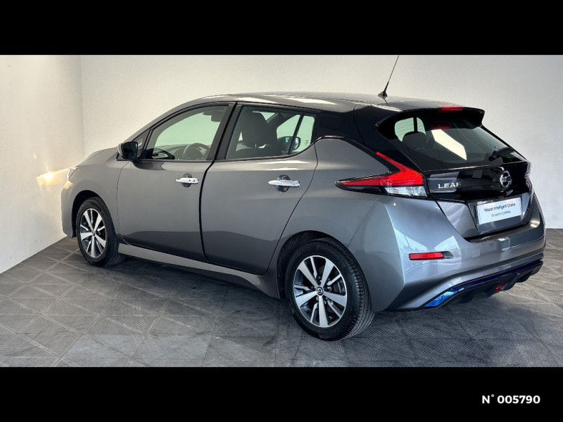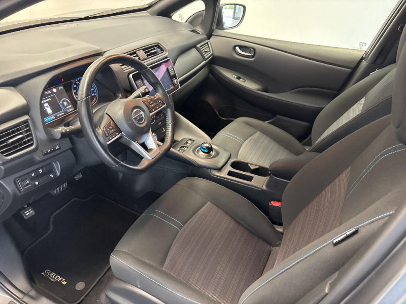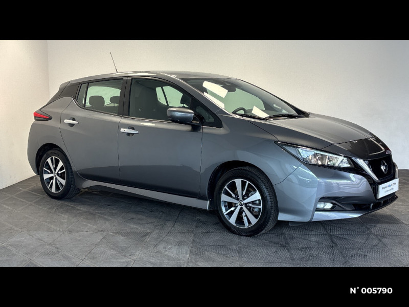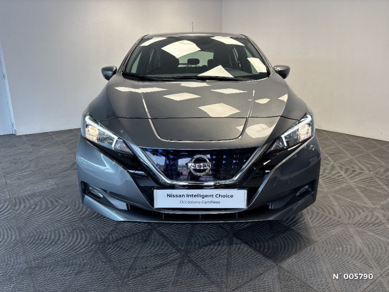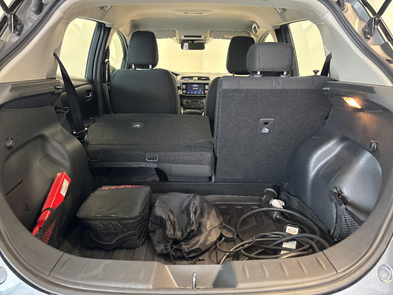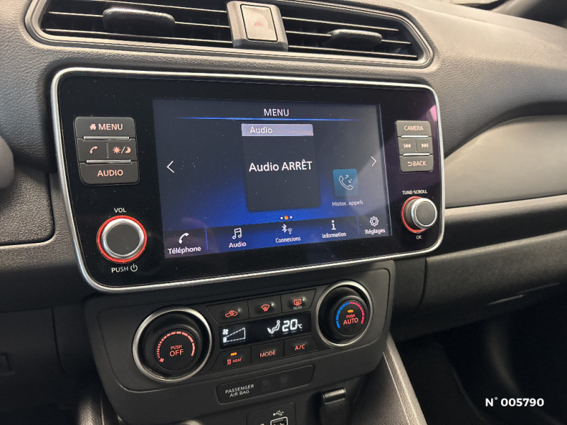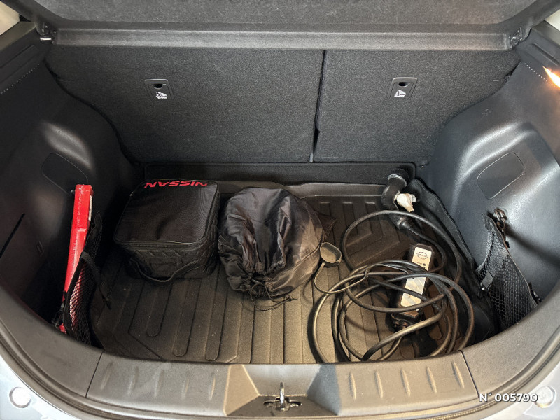 ABS et EBD / Allumage automatique des feux de détresse en cas d'accident / Câble de 6 m (recharge sur prise domestique 230V en 21h sur batterie 40 kWh ou 32h sur batterie 62 kWh) / Câble 32A de 6 m (recharge sur borne publique ou Wallbox 7 kW T2 en 7h30 sur 40 kWh ou 11h30 sur 62 kWh) / Chargeur embarqué de 6,6kW (pour recharge en 7h sur une wallbox de 32A) / Combiné d'instrumentation avec écran HD TFT 7" couleur / Commandes au volant (audio, Bluetooth, régulateur et limiteur de vitesses et contrôle de l'ordinate ur de bord) / Contrôle vocal Nissan / Eclairage de la trappe de recharge / Système audio Bluetooth, AM/FM, RDS, DAB, MP3, USB (sans CD) / Système "Chassis Control" (contrôle actif de trajectoire et de l'assiette) / Système d'alerte anticollision AR intelligent / Système de climatisation avec pompe à chaleur / Système d'ouverture et de démarrage sans clé "Intelligent key" / Technologie E-pedal / Trois appuis-tête aux places AR / 6 HP / Extinction temporisé des phares "Follow me home" / Feux AV halogènes avec signature lumineuse à LED / Feux de route intelligents / Feux diurne LED avec signature lumineuse / Freinage d'urgence intelligent (AEB) avec détection piéton / Indicateur de température extérieure / Kit de réparation pneumatique / Nissan Connect Services / Nissan Connect 8.0 / Ouverture de la trappe de recharge depuis la clé / Pack 100% Mobilité / Pare-soleil côté conducteur et passager avec miroir de courtoisie / Poches aumonières au dos des sièges AV / Poignées de portes chromées / Points d'ancrage de siège enfant ISOFIX à l'AV et 2 à l'AR / Port CHAdeMO pour chargeur rapide 50 kW (recharge de 20% à 80% en 60 min sur 40 kWh ou 90 min sur 62 kWh) / Port USB à l'AV (x1) et l'AR (x2) / Prise auxiliaire Jack 3,5 mm / Prise 12V sur console centrale AV / Programmation de la recharge / Rétroviseurs extérieurs couleur carrosserie avec clignotant à LED intégré / Sécurité enfants sur les portes AR / Sellerie tissu Noir ou Gris Clair / Son d'alerte pour piétons désactivable / Surveillance des angles morts incluant voyant lumineux sur rétroviseurs extérieurs