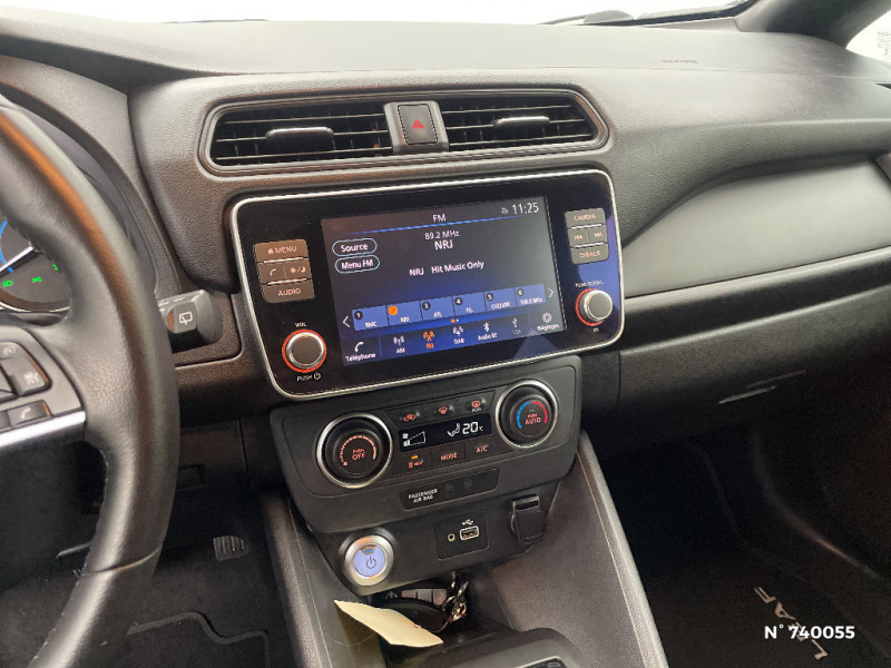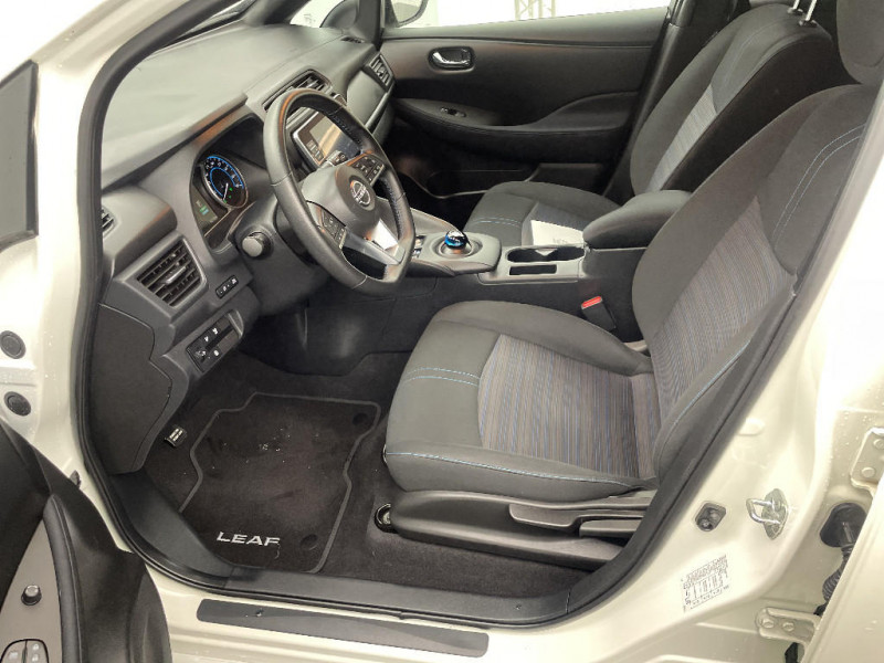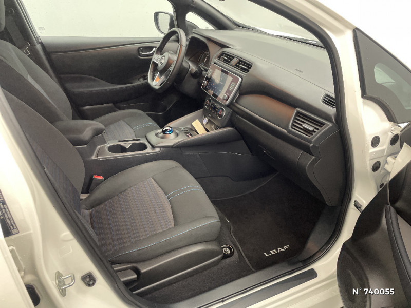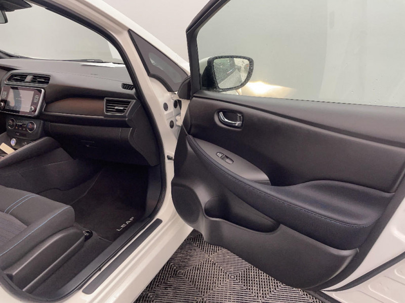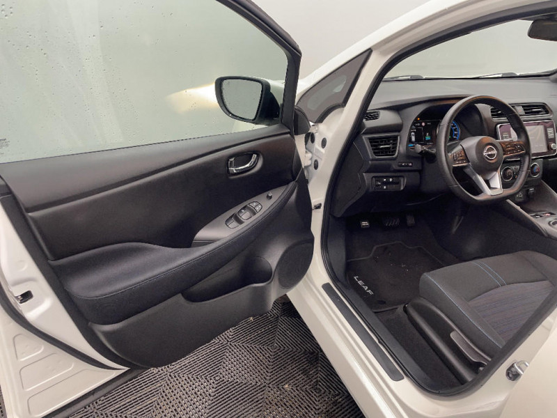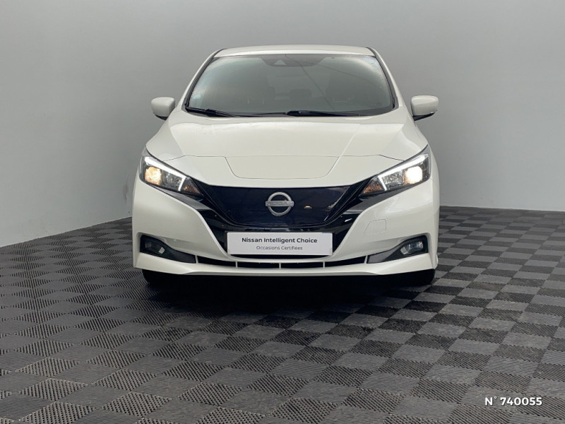 Technologie E-pedal / Trois appuis-tête aux places AR / 6 HP / ABS et EBD / Allumage automatique des feux de détresse en cas d'accident / Câble de 6 m (recharge sur prise domestique 230V en 21h sur batterie 40 kWh ou 32h sur batterie 62 kWh) / Câble 32A de 6 m (recharge sur borne publique ou Wallbox 7 kW T2 en 7h30 sur 40 kWh ou 11h30 sur 62 kWh) / Chargeur embarqué de 6,6kW (pour recharge en 7h sur une wallbox de 32A) / Combiné d'instrumentation avec écran HD TFT 7" couleur / Commandes au volant (audio, Bluetooth, régulateur et limiteur de vitesses et contrôle de l'ordinate ur de bord) / Contrôle vocal Nissan / Eclairage de la trappe de recharge / Extinction temporisé des phares "Follow me home" / Feux AV halogènes avec signature lumineuse à LED / Feux de route intelligents / Feux diurne LED avec signature lumineuse / Freinage d'urgence intelligent (AEB) avec détection piéton / Indicateur de température extérieure / Kit de réparation pneumatique / Nissan Connect Services / Nissan Connect 8.0 / Ouverture de la trappe de recharge depuis la clé / Pack 100% Mobilité / Pare-soleil côté conducteur et passager avec miroir de courtoisie / Poches aumonières au dos des sièges AV / Poignées de portes chromées / Points d'ancrage de siège enfant ISOFIX à l'AV et 2 à l'AR / Port CHAdeMO pour chargeur rapide 50 kW (recharge de 20% à 80% en 60 min sur 40 kWh ou 90 min sur 62 kWh) / Port USB à l'AV (x1) et l'AR (x2) / Prise auxiliaire Jack 3,5 mm / Prise 12V sur console centrale AV / Programmation de la recharge / Rétroviseurs extérieurs couleur carrosserie avec clignotant à LED intégré / Sécurité enfants sur les portes AR / Sellerie tissu Noir ou Gris Clair / Son d'alerte pour piétons désactivable / Surveillance des angles morts incluant voyant lumineux sur rétroviseurs extérieurs / Système audio Bluetooth, AM/FM, RDS, DAB, MP3, USB (sans CD) / Système "Chassis Control" (contrôle actif de trajectoire et de l'assiette) / Système d'alerte anticollision AR intelligent / Système de climatisation avec pompe à chaleur / Système d'ouverture et de démarrage sans clé "Intelligent key"