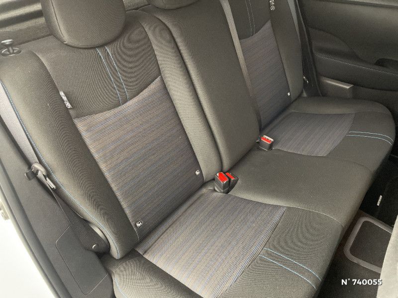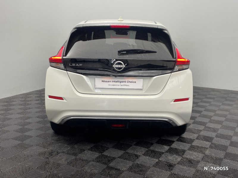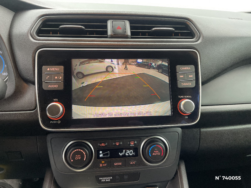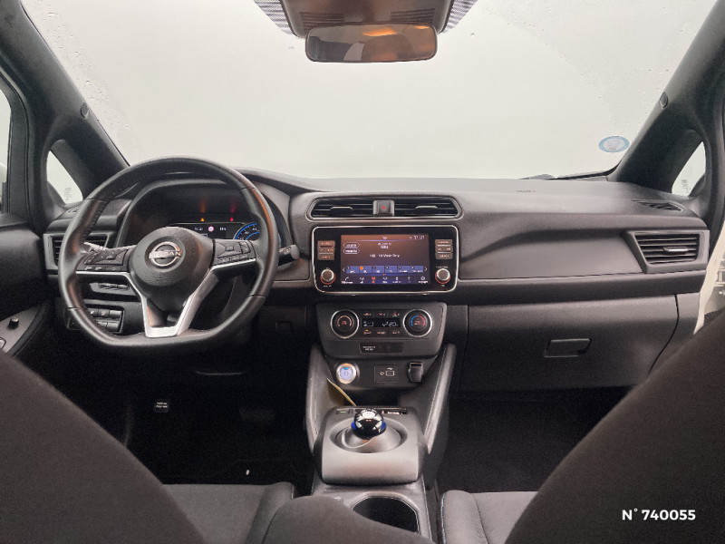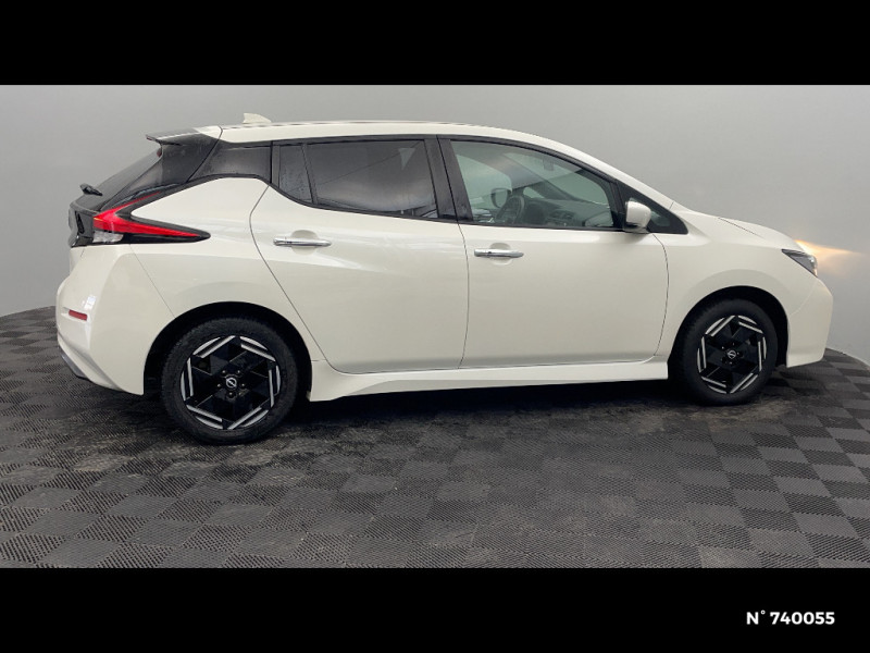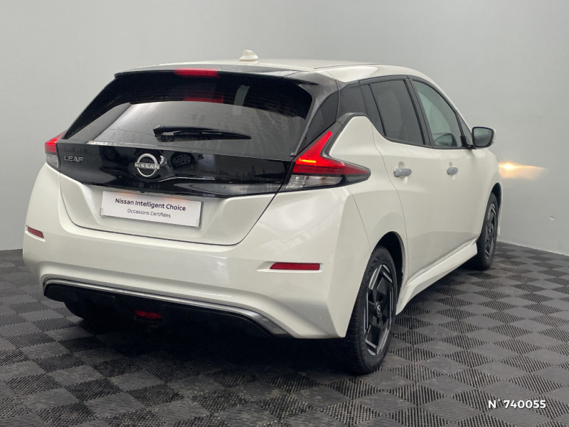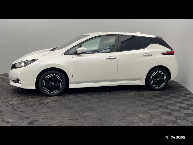 Technologie E-pedal / Trois appuis-tête aux places AR / 6 HP / ABS et EBD / Allumage automatique des feux de détresse en cas d'accident / Câble de 6 m (recharge sur prise domestique 230V en 21h sur batterie 40 kWh ou 32h sur batterie 62 kWh) / Câble 32A de 6 m (recharge sur borne publique ou Wallbox 7 kW T2 en 7h30 sur 40 kWh ou 11h30 sur 62 kWh) / Chargeur embarqué de 6,6kW (pour recharge en 7h sur une wallbox de 32A) / Combiné d'instrumentation avec écran HD TFT 7" couleur / Commandes au volant (audio, Bluetooth, régulateur et limiteur de vitesses et contrôle de l'ordinate ur de bord) / Contrôle vocal Nissan / Eclairage de la trappe de recharge / Extinction temporisé des phares "Follow me home" / Feux AV halogènes avec signature lumineuse à LED / Feux de route intelligents / Feux diurne LED avec signature lumineuse / Freinage d'urgence intelligent (AEB) avec détection piéton / Indicateur de température extérieure / Kit de réparation pneumatique / Nissan Connect Services / Nissan Connect 8.0 / Ouverture de la trappe de recharge depuis la clé / Pack 100% Mobilité / Pare-soleil côté conducteur et passager avec miroir de courtoisie / Poches aumonières au dos des sièges AV / Poignées de portes chromées / Points d'ancrage de siège enfant ISOFIX à l'AV et 2 à l'AR / Port CHAdeMO pour chargeur rapide 50 kW (recharge de 20% à 80% en 60 min sur 40 kWh ou 90 min sur 62 kWh) / Port USB à l'AV (x1) et l'AR (x2) / Prise auxiliaire Jack 3,5 mm / Prise 12V sur console centrale AV / Programmation de la recharge / Rétroviseurs extérieurs couleur carrosserie avec clignotant à LED intégré / Sécurité enfants sur les portes AR / Sellerie tissu Noir ou Gris Clair / Son d'alerte pour piétons désactivable / Surveillance des angles morts incluant voyant lumineux sur rétroviseurs extérieurs / Système audio Bluetooth, AM/FM, RDS, DAB, MP3, USB (sans CD) / Système "Chassis Control" (contrôle actif de trajectoire et de l'assiette) / Système d'alerte anticollision AR intelligent / Système de climatisation avec pompe à chaleur / Système d'ouverture et de démarrage sans clé "Intelligent key"