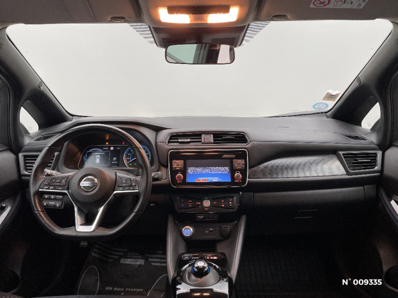 Système "Chassis Control" (contrôle actif de trajectoire et de l'assiette) / Système d'alerte anticollision AR intelligent / Système d'ouverture et de démarrage sans clé "Intelligent key" / Technologie E-pedal / Nissan Connect 7.0" : Ecran tactile couleur 7,0", Caméra de recul avec repères de gabarit dynamiques Pilotage des services télématiques, Indication des points de charge avec mise à jour automatique, Système de navigation multimédia avec fonction Info Trafic, cartographie Europe 3D, indicateur d'éco-conduite, Système audio Bluetooth® (téléphone et musique), Radio numérique DAB, Connexion smartphone (Apple CarPlay et Android Auto) / Feux diurne LED avec signature lumineuse / Freinage d'urgence intelligent (AEB) avec détection piéton / Nissan Connect 7.0" / Poches aumonières au dos des sièges AV / Poignées de portes chromées / Points d'ancrage pour sièges enfants ISOFIX à l'AR / Pompe à chaleur / Programmation de la recharge / Rétroviseurs extérieurs couleur carrosserie avec clignotant à LED intégré / Sellerie tissu Noir ou Gris Clair / Système audio CD/RDS 6HP avec commandes au volant et connexion USB pour iPod, lecteur MP3 / Connecteur pour chargeur rapide CHAdeMO (recharge à 80% en 40 min) / Déclenchement de la climatisation à distance / Déclenchement de la recharge à distance / ABS et EBD / Câble de 6m (pour recharge en 21h) / Câble 32A de 6m (pour recharge en 7h) / Chargeur embarqué de 6,6kW (pour recharge en 7h sur une wallbox de 32A) / Combiné d'instrumentation avec écran HD TFT 7" couleur