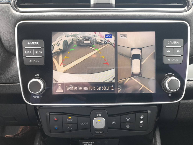 ABS et EBD / Allumage automatique des feux de détresse en cas d'accident / Antenne aileron de requin / Câble 32A de 6 m (recharge sur borne publique ou Wallbox 7 kW T2 en 7h30 sur 40 kWh ou 11h30 sur 62 kWh) / Câble de 6 m (recharge sur prise domestique 230V en 21h sur batterie 40 kWh ou 32h sur batterie 62 kWh) / Chargeur embarqué de 6,6kW (pour recharge en 7h sur une wallbox de 32A) / Combiné d'instrumentation avec écran HD TFT 7" couleur / Commandes au volant (audio, Bluetooth, régulateur et limiteur de vitesses et contrôle de l'ordinate ur de bord) / Contrôle vocal Nissan / Eclairage de la trappe de recharge / Extinction temporisé des phares "Follow me home" / Feux AV à LED avec signature lumineuse à LED / Feux de route intelligents / Feux diurne LED avec signature lumineuse / Freinage d'urgence intelligent (AEB) avec détection piéton / Frein de stationnement électrique / Indicateur de température extérieure / Kit de réparation pneumatique / Montant central de porte noir laqué / Nissan Connect Services / Ouverture de la trappe de recharge depuis la clé / Pack 100% Mobilité / Pare-soleil côté conducteur et passager avec miroir de courtoisie éclairé / Poches aumonières au dos des sièges AV / Poignées de portes chromées / Points d'ancrage de siège enfant ISOFIX à l'AV et 2 à l'AR / Port CHAdeMO pour chargeur rapide 50 kW (recharge de 20% à 80% en 60 min sur 40 kWh ou 90 min sur 62 kWh) / Port USB à l'AV (x1) et l'AR (x2) / Prise 12V sur console centrale AV / Prise auxiliaire Jack 3,5 mm / Programmation de la recharge / ProPILOT : technologie de conduite assistée / Rétroviseur intérieur à affichage numérique / Rétroviseur intérieur électrochromatique / Rétroviseurs extérieurs couleur carrosserie avec clignotant à LED intégré / Sécurité enfants sur les portes AR / Sellerie Cuir avec inserts en Suédine noir ou beige / Son d'alerte pour piétons désactivable / Surveillance des angles morts incluant voyant lumineux sur rétroviseurs extérieurs / Système audio Bluetooth, AM/FM, RDS, DAB, MP3, USB (sans CD) / Système audio BOSE Energy Efficient Series 7 HP / Système "Chassis Control" (contrôle actif de trajectoire et de l'assiette) / Système d'alerte anticollision AR intelligent / Système de climatisation avec pompe à chaleur / Système d'ouverture et de démarrage sans clé "Intelligent key" / Technologie E-pedal / Trois appuis-tête aux places AR / Vitres latérales AR et vitre de hayon teintées / Volant chauffant / Nissan AVM - Vision Intelligente à 360°: Caméra AV, Détection des objets en mouvement, Radars de stationnement AV et AR, Système de détection de fatigue intelligent, Caméra de recul avec repères de gabarit dynamique, Caméras latérales / Nissan Connect 8.0: Apple Car Play et Android Auto, Caméra de recul avec repères de gabarit dynamique, Ecran tactile 8" pilotant la navigation et les services télématiques / Pack Confort: Volant chauffant, Sièges AV/AR chauffants / Pack Look: Jantes alliage 17", Vitres latérales AR et vitre de hayon teintées /