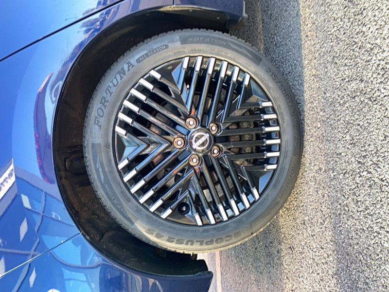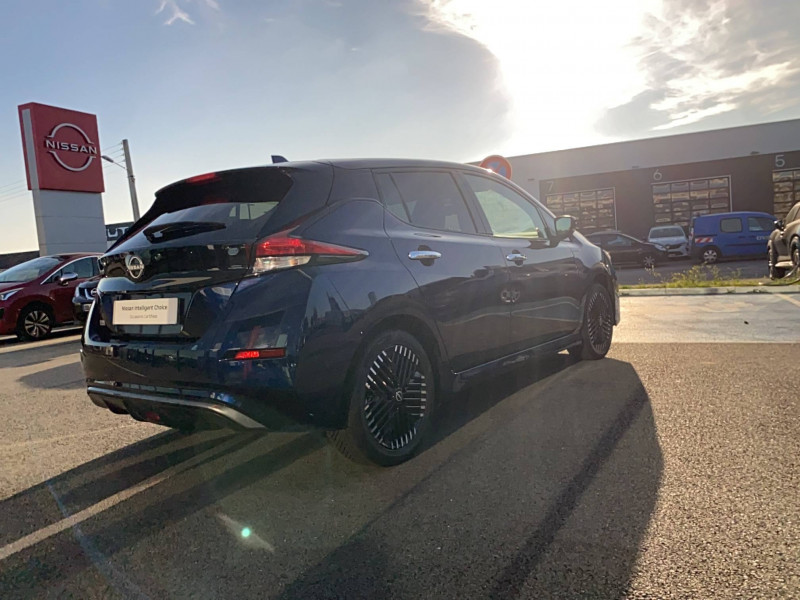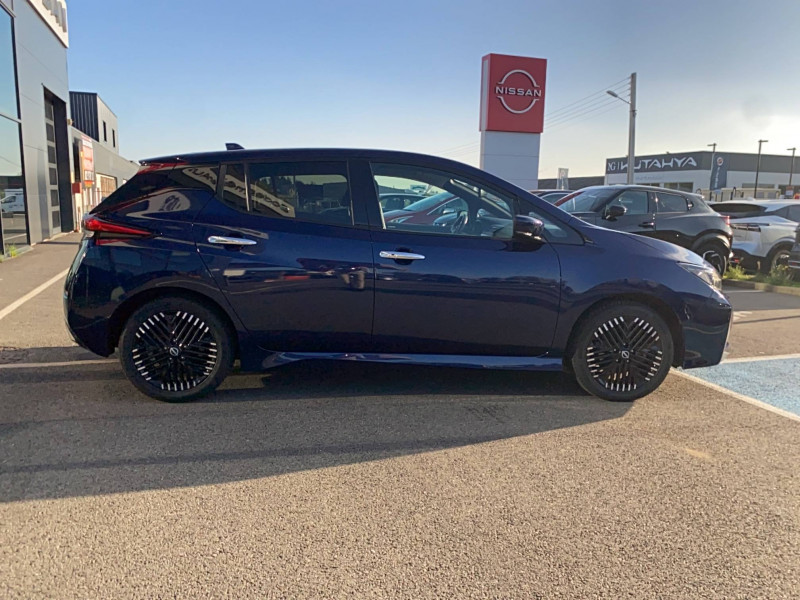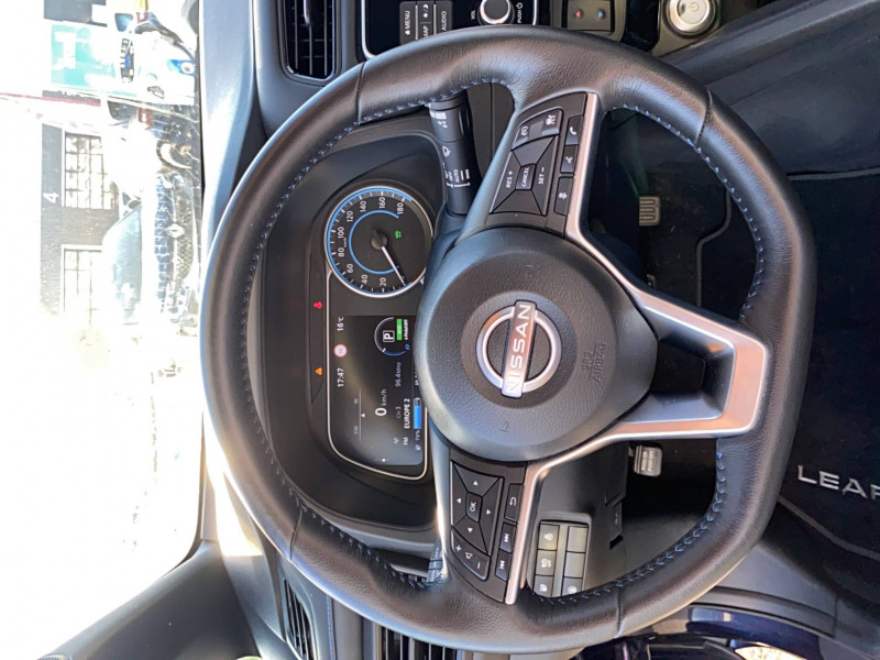 6 HP / ABS et EBD / Allumage automatique des feux de détresse en cas d'accident / Antenne aileron de requin / Câble 32A de 6 m (recharge sur borne publique ou Wallbox 7 kW T2 en 7h30 sur 40 kWh ou 11h30 sur 62 kWh) / Câble de 6 m (recharge sur prise domestique 230V en 21h sur batterie 40 kWh ou 32h sur batterie 62 kWh) / Chargeur embarqué de 6,6kW (pour recharge en 7h sur une wallbox de 32A) / Combiné d'instrumentation avec écran HD TFT 7" couleur / Commandes au volant (audio, Bluetooth, régulateur et limiteur de vitesses et contrôle de l'ordinate ur de bord) / Contrôle vocal Nissan / Eclairage de la trappe de recharge / Extinction temporisé des phares "Follow me home" / Feux AV halogènes avec signature lumineuse à LED / Feux de route intelligents / Feux diurne LED avec signature lumineuse / Freinage d'urgence intelligent (AEB) avec détection piéton / Indicateur de température extérieure / Kit de réparation pneumatique / Montant central de porte noir laqué / Nissan Connect Services / Ouverture de la trappe de recharge depuis la clé / Pack 100% Mobilité / Pare-soleil côté conducteur et passager avec miroir de courtoisie éclairé / Poches aumonières au dos des sièges AV / Poignées de portes chromées / Points d'ancrage de siège enfant ISOFIX à l'AV et 2 à l'AR / Port CHAdeMO pour chargeur rapide 50 kW (recharge de 20% à 80% en 60 min sur 40 kWh ou 90 min sur 62 kWh) / Port USB à l'AV (x1) et l'AR (x2) / Prise 12V sur console centrale AV / Prise auxiliaire Jack 3,5 mm / Programmation de la recharge / Rétroviseur intérieur électrochromatique / Rétroviseurs extérieurs couleur carrosserie avec clignotant à LED intégré / Sécurité enfants sur les portes AR / Sellerie mixte TEP/Tissu noir ou beige / Son d'alerte pour piétons désactivable / Surveillance des angles morts incluant voyant lumineux sur rétroviseurs extérieurs / Système audio Bluetooth, AM/FM, RDS, DAB, MP3, USB (sans CD) / Système "Chassis Control" (contrôle actif de trajectoire et de l'assiette) / Système d'alerte anticollision AR intelligent / Système de climatisation avec pompe à chaleur / Système d'ouverture et de démarrage sans clé "Intelligent key" / Technologie E-pedal / Trois appuis-tête aux places AR / Vitres latérales AR et vitre de hayon teintées / Volant chauffant / Nissan AVM Vision Intelligente à 360° & Radars de stationnement AV/AR - Caméras latérales, AV/AR avec repères de gabarit - Détection des objets en mouvement - Système de détection de fatigue intelligent - Caméras latérales situées dans les rétroviseurs extérieurs gauche et droit: Caméra AV, Détection des objets en mouvement, Radars de stationnement AV et AR, Système de détection de fatigue intelligent, Caméra de recul avec repères de gabarit dynamique, Caméras latérales / Nissan Connect 8.0: Apple Car Play et Android Auto, Caméra de recul avec repères de gabarit dynamique, Ecran tactile 8" pilotant la navigation et les services télématiques / Pack Confort: Volant chauffant, Sièges AV/AR chauffants / Pack Look: Jantes alliage 17", Vitres latérales AR et vitre de hayon teintées /