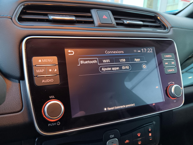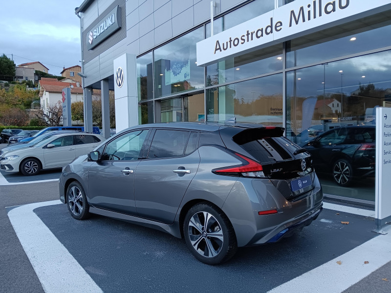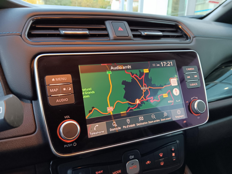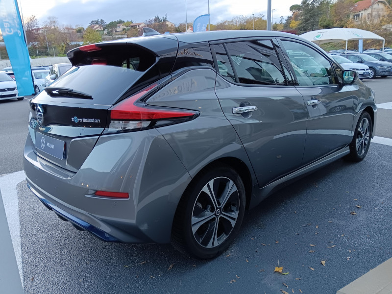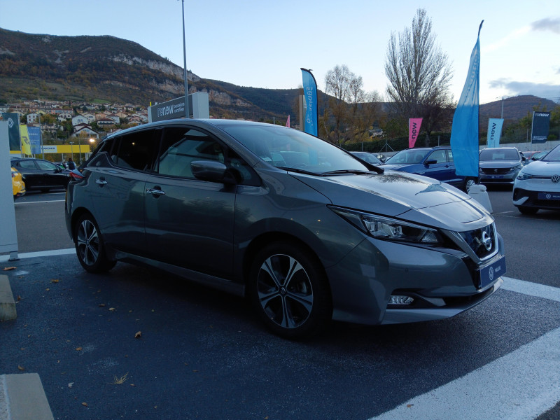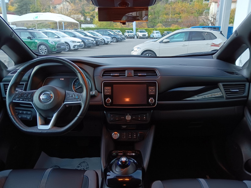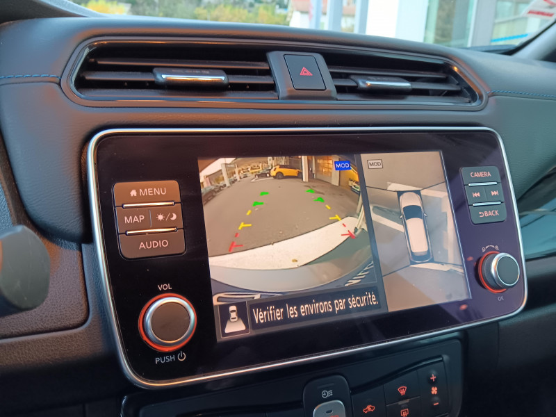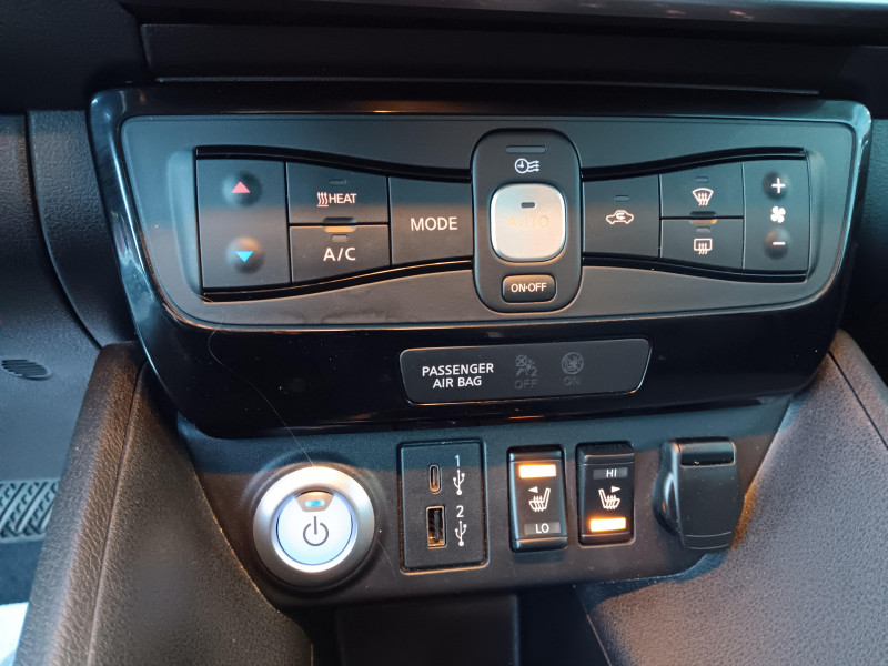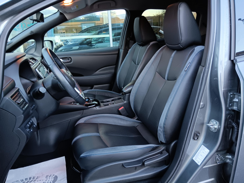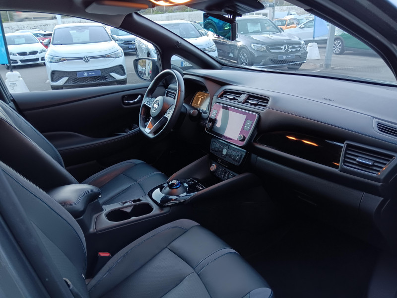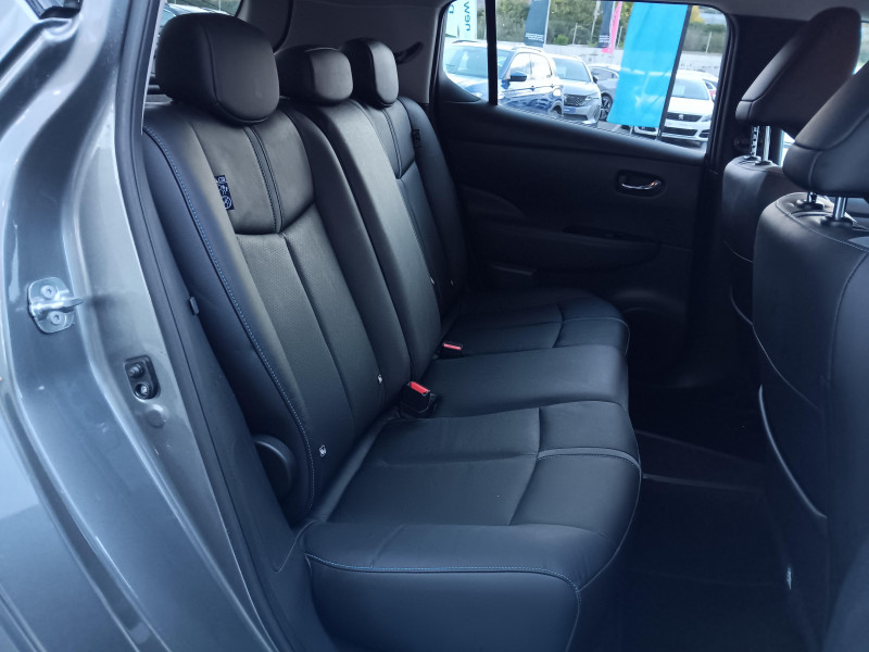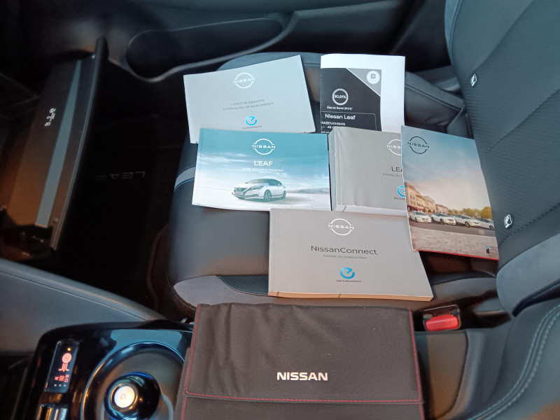 Allumage automatique des feux de détresse en cas d'accident / Feux AV à LED avec signature lumineuse à LED / Feux diurne LED avec signature lumineuse / Frein de stationnement électrique / Pack 100% Mobilité / Rétroviseurs extérieurs couleur carrosserie avec clignotant à LED intégré / Sellerie Cuir avec inserts en Suédine noir ou beige / Système de climatisation avec pompe à chaleur / ABS et EBD / Antenne aileron de requin / Chargeur embarqué de 6,6kW (pour recharge en 7h sur une wallbox de 32A) / Combiné d'instrumentation avec écran HD TFT 7" couleur / Commandes au volant (audio, Bluetooth, régulateur et limiteur de vitesses et contrôle de l'ordinate ur de bord) / Contrôle vocal Nissan / Câble 32A de 6 m (recharge sur borne publique ou Wallbox 7 kW T2 en 7h30 sur 40 kWh ou 11h30 sur 62 kWh) / Câble de 6 m (recharge sur prise domestique 230V en 21h sur batterie 40 kWh ou 32h sur batterie 62 kWh) / Eclairage de la trappe de recharge / Extinction temporisé des phares "Follow me home" / Feux de route intelligents / Freinage d'urgence intelligent (AEB) avec détection piéton / Indicateur de température extérieure / Kit de réparation pneumatique / Montant central de porte noir laqué / Nissan Connect Services / Ouverture de la trappe de recharge depuis la clé / Pare-soleil côté conducteur et passager avec miroir de courtoisie éclairé / Poches aumonières au dos des sièges AV / Poignées de portes chromées / Points d'ancrage de siège enfant ISOFIX à l'AV et 2 à l'AR / Port CHAdeMO pour chargeur rapide 50 kW (recharge de 20% à 80% en 60 min sur 40 kWh ou 90 min sur 62 kWh) / Port USB à l'AV (x1) et l'AR (x2) / Prise 12V sur console centrale AV / Prise auxiliaire Jack 3,5 mm / Programmation de la recharge / ProPILOT : technologie de conduite assistée / Rétroviseur intérieur à affichage numérique / Rétroviseur intérieur électrochromatique / Son d'alerte pour piétons désactivable / Surveillance des angles morts incluant voyant lumineux sur rétroviseurs extérieurs / Système "Chassis Control" (contrôle actif de trajectoire et de l'assiette) / Système audio Bluetooth, AM/FM, RDS, DAB, MP3, USB (sans CD) / Système audio BOSE Energy Efficient Series 7 HP / Système d'alerte anticollision AR intelligent / Système d'ouverture et de démarrage sans clé "Intelligent key" / Sécurité enfants sur les portes AR / Technologie E-pedal / Trois appuis-tête aux places AR / Vitres latérales AR et vitre de hayon teintées / Volant chauffant