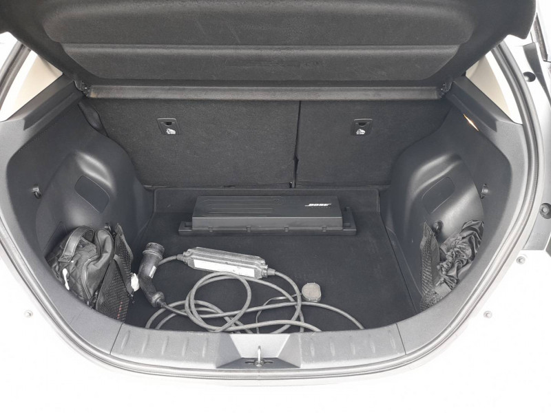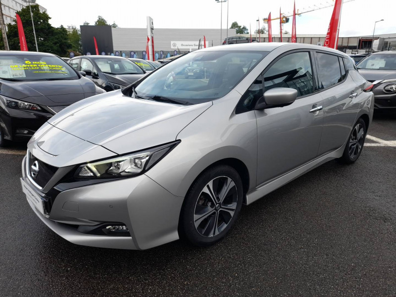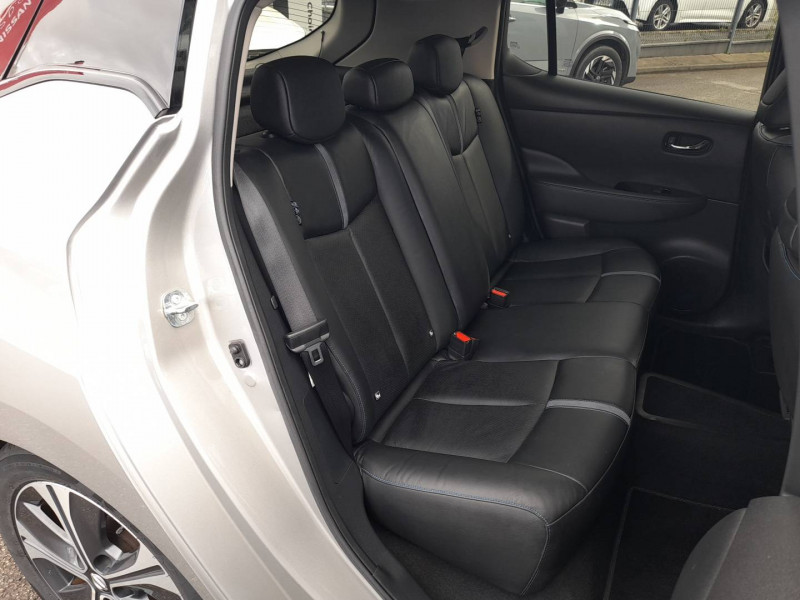 ABS et EBD / Allumage automatique des feux de détresse en cas d'accident / Antenne aileron de requin / Câble 32A de 6 m (recharge sur borne publique ou Wallbox 7 kW T2 en 7h30 sur 40 kWh ou 11h30 sur 62 kWh) / Câble de 6 m (recharge sur prise domestique 230V en 21h sur batterie 40 kWh ou 32h sur batterie 62 kWh) / Chargeur embarqué de 6,6kW (pour recharge en 7h sur une wallbox de 32A) / Combiné d'instrumentation avec écran HD TFT 7" couleur / Commandes au volant (audio, Bluetooth, régulateur et limiteur de vitesses et contrôle de l'ordinate ur de bord) / Contrôle vocal Nissan / Eclairage de la trappe de recharge / Extinction temporisé des phares "Follow me home" / Feux AV à LED avec signature lumineuse à LED / Feux de route intelligents / Feux diurne LED avec signature lumineuse / Freinage d'urgence intelligent (AEB) avec détection piéton / Frein de stationnement électrique / Indicateur de température extérieure / Kit de réparation pneumatique / Montant central de porte noir laqué / Nissan Connect Services / Ouverture de la trappe de recharge depuis la clé / Pack 100% Mobilité / Pare-soleil côté conducteur et passager avec miroir de courtoisie éclairé / Poches aumonières au dos des sièges AV / Poignées de portes chromées / Points d'ancrage de siège enfant ISOFIX à l'AV et 2 à l'AR / Port CHAdeMO pour chargeur rapide 50 kW (recharge de 20% à 80% en 60 min sur 40 kWh ou 90 min sur 62 kWh) / Port USB à l'AV (x1) et l'AR (x2) / Prise 12V sur console centrale AV / Prise auxiliaire Jack 3,5 mm / Programmation de la recharge / ProPILOT : technologie de conduite assistée / Rétroviseur intérieur à affichage numérique / Rétroviseur intérieur électrochromatique / Rétroviseurs extérieurs couleur carrosserie avec clignotant à LED intégré / Sécurité enfants sur les portes AR / Sellerie Cuir avec inserts en Suédine noir ou beige / Son d'alerte pour piétons désactivable / Surveillance des angles morts incluant voyant lumineux sur rétroviseurs extérieurs / Système audio Bluetooth, AM/FM, RDS, DAB, MP3, USB (sans CD) / Système audio BOSE Energy Efficient Series 7 HP / Système "Chassis Control" (contrôle actif de trajectoire et de l'assiette) / Système d'alerte anticollision AR intelligent / Système de climatisation avec pompe à chaleur / Système d'ouverture et de démarrage sans clé "Intelligent key" / Technologie E-pedal / Trois appuis-tête aux places AR / Vitres latérales AR et vitre de hayon teintées / Volant chauffant / Nissan AVM - Vision Intelligente à 360°: Caméra AV, Détection des objets en mouvement, Radars de stationnement AV et AR, Système de détection de fatigue intelligent, Caméra de recul avec repères de gabarit dynamique, Caméras latérales / Nissan Connect 8.0: Apple Car Play et Android Auto, Caméra de recul avec repères de gabarit dynamique, Ecran tactile 8" pilotant la navigation et les services télématiques / Pack Confort: Volant chauffant, Sièges AV/AR chauffants / Pack Look: Jantes alliage 17", Vitres latérales AR et vitre de hayon teintées /