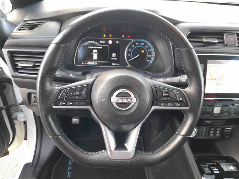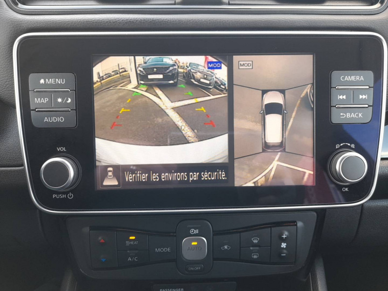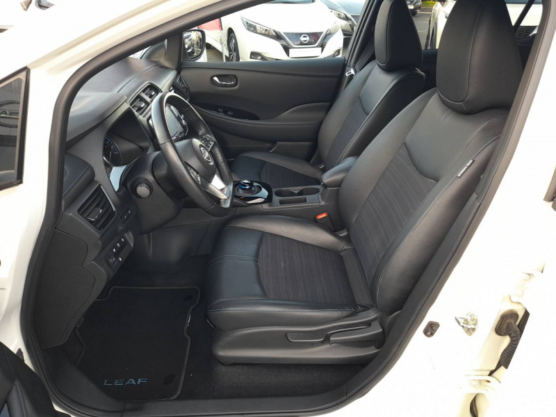6 HP / ABS et EBD / Allumage automatique des feux de détresse en cas d'accident / Antenne aileron de requin / Câble 32A de 6 m (recharge sur borne publique ou Wallbox 7 kW T2 en 7h30 sur 40 kWh ou 11h30 sur 62 kWh) / Câble de 6 m (recharge sur prise domestique 230V en 21h sur batterie 40 kWh ou 32h sur batterie 62 kWh) / Chargeur embarqué de 6,6kW (pour recharge en 7h sur une wallbox de 32A) / Combiné d'instrumentation avec écran HD TFT 7" couleur / Commandes au volant (audio, Bluetooth, régulateur et limiteur de vitesses et contrôle de l'ordinate ur de bord) / Contrôle vocal Nissan / Eclairage de la trappe de recharge / Extinction temporisé des phares "Follow me home" / Feux AV halogènes avec signature lumineuse à LED / Feux de route intelligents / Feux diurne LED avec signature lumineuse / Freinage d'urgence intelligent (AEB) avec détection piéton / Indicateur de température extérieure / Kit de réparation pneumatique / Montant central de porte noir laqué / Nissan Connect Services / Ouverture de la trappe de recharge depuis la clé / Pack 100% Mobilité / Pare-soleil côté conducteur et passager avec miroir de courtoisie éclairé / Poches aumonières au dos des sièges AV / Poignées de portes chromées / Points d'ancrage de siège enfant ISOFIX à l'AV et 2 à l'AR / Port CHAdeMO pour chargeur rapide 50 kW (recharge de 20% à 80% en 60 min sur 40 kWh ou 90 min sur 62 kWh) / Port USB à l'AV (x1) et l'AR (x2) / Prise 12V sur console centrale AV / Prise auxiliaire Jack 3,5 mm / Programmation de la recharge / Rétroviseur intérieur électrochromatique / Rétroviseurs extérieurs couleur carrosserie avec clignotant à LED intégré / Sécurité enfants sur les portes AR / Sellerie mixte TEP/Tissu noir ou beige / Son d'alerte pour piétons désactivable / Surveillance des angles morts incluant voyant lumineux sur rétroviseurs extérieurs / Système audio Bluetooth, AM/FM, RDS, DAB, MP3, USB (sans CD) / Système "Chassis Control" (contrôle actif de trajectoire et de l'assiette) / Système d'alerte anticollision AR intelligent / Système de climatisation avec pompe à chaleur / Système d'ouverture et de démarrage sans clé "Intelligent key" / Technologie E-pedal / Trois appuis-tête aux places AR / Vitres latérales AR et vitre de hayon teintées / Volant chauffant / Nissan AVM - Vision Intelligente à 360°: Caméra AV, Détection des objets en mouvement, Radars de stationnement AV et AR, Système de détection de fatigue intelligent, Caméra de recul avec repères de gabarit dynamique, Caméras latérales / Nissan Connect 8.0: Apple Car Play et Android Auto, Caméra de recul avec repères de gabarit dynamique, Ecran tactile 8" pilotant la navigation et les services télématiques / Pack Confort: Volant chauffant, Sièges AV/AR chauffants / Pack Look: Jantes alliage 17", Vitres latérales AR et vitre de hayon teintées /