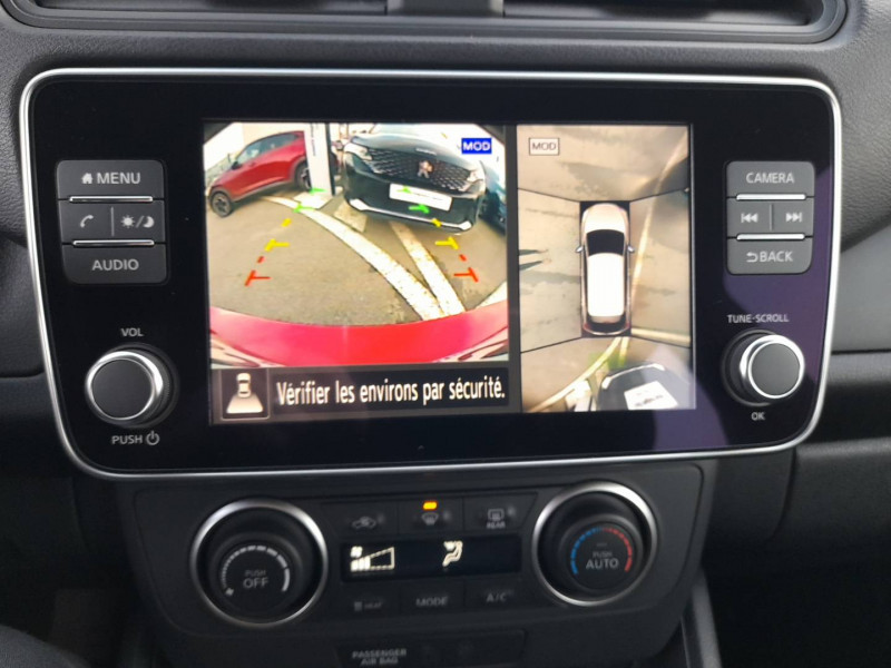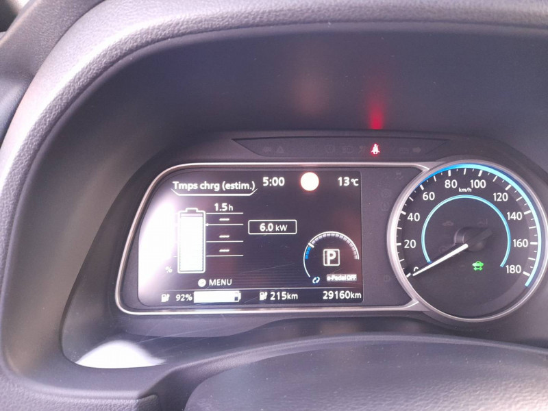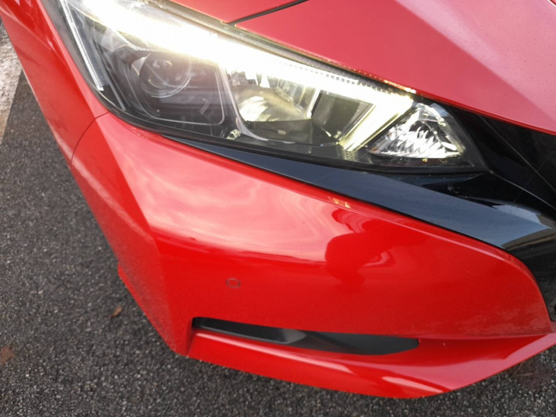 6 HP / ABS et EBD / Allumage automatique des feux de détresse en cas d'accident / Câble 32A de 6 m (recharge sur borne publique ou Wallbox 7 kW T2 en 7h30 sur 40 kWh ou 11h30 sur 62 kWh) / Câble de 6 m (recharge sur prise domestique 230V en 21h sur batterie 40 kWh ou 32h sur batterie 62 kWh) / Chargeur embarqué de 6,6kW (pour recharge en 7h sur une wallbox de 32A) / Combiné d'instrumentation avec écran HD TFT 7" couleur / Commandes au volant (audio, Bluetooth, régulateur et limiteur de vitesses et contrôle de l'ordinate ur de bord) / Eclairage de la trappe de recharge / Ecran tactile multimedia 8"compatible Apple Car Play et Android Auto et caméra de recul / Extinction temporisé des phares "Follow me home" / Feux AV halogènes avec signature lumineuse à LED / Feux de route intelligents / Feux diurne LED avec signature lumineuse / Freinage d'urgence intelligent (AEB) avec détection piéton / Indicateur de température extérieure / Kit de réparation pneumatique / Ouverture de la trappe de recharge depuis la clé / Pare-soleil côté conducteur et passager avec miroir de courtoisie / Poches aumonières au dos des sièges AV / Poignées de portes chromées / Points d'ancrage de siège enfant ISOFIX à l'AV et 2 à l'AR / Port CHAdeMO pour chargeur rapide 50 kW (recharge de 20% à 80% en 60 min sur 40 kWh ou 90 min sur 62 kWh) / Port USB à l'AV (x1) et l'AR (x2) / Prise 12V sur console centrale AV / Prise auxiliaire Jack 3,5 mm / Programmation de la recharge / Rétroviseurs extérieurs couleur carrosserie avec clignotant à LED intégré / Sécurité enfants sur les portes AR / Sellerie tissu Noir ou Gris Clair / Surveillance des angles morts incluant voyant lumineux sur rétroviseurs extérieurs / Système audio Bluetooth, AM/FM, RDS, DAB, MP3, USB (sans CD) / Système "Chassis Control" (contrôle actif de trajectoire et de l'assiette) / Système d'alerte anticollision AR intelligent / Système d'avertissement acoustique du véhicule (AVAS) / Système d'ouverture et de démarrage sans clé "Intelligent key" / Technologie E-pedal / Trois appuis-tête aux places AR / Pack 100% Mobilité: Badge Nissan Charge offert pendant 3 ans, 2 câbles de 6 m pour se recharger sur prise et sur borne publique ou Wallbox 7 kW T2, Switch Car : pour profiter d'un véhicule de remplacement thermique avec kilométrage illimitéà tarif préférentiel, Adhésion gratuite au programme de parrainage Ambassadeurs, Offre d'assurance collaborative dédiée /