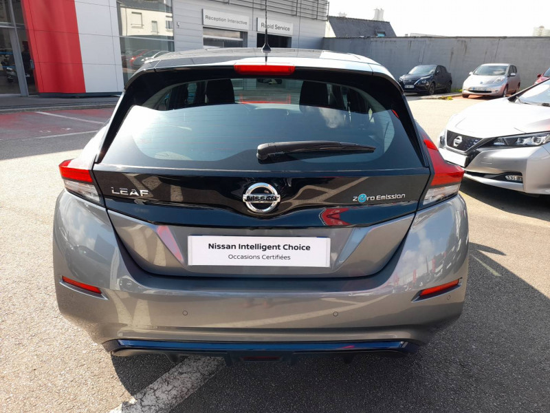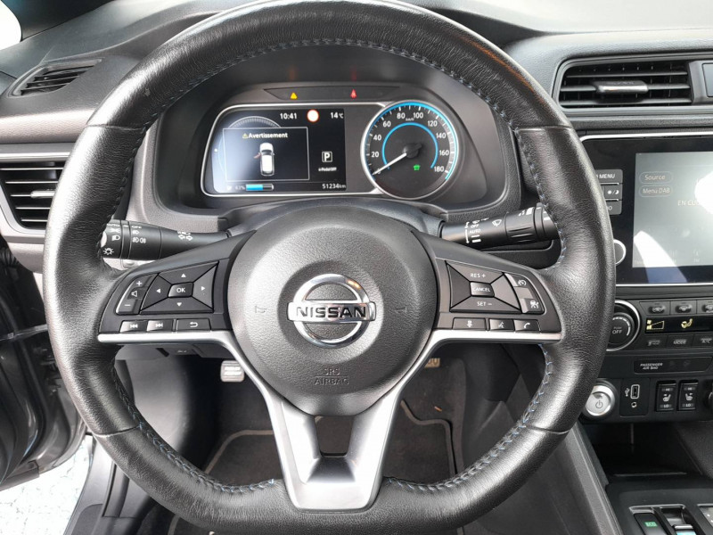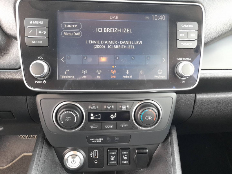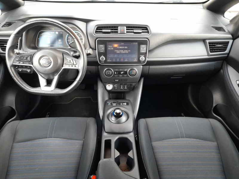 ABS et EBD / Câble 32A de 6m (pour recharge en 7h) / Câble de 6m (pour recharge en 21h) / Chargeur embarqué de 6,6kW (pour recharge en 7h sur une wallbox de 32A) / Combiné d'instrumentation avec écran HD TFT 7" couleur / Connecteur pour chargeur rapide CHAdeMO (recharge à 80% en 40 min) / Déclenchement de la climatisation à distance / Déclenchement de la recharge à distance / Feux diurne LED avec signature lumineuse / Freinage d'urgence intelligent (AEB) avec détection piéton / Nissan Connect 7.0" : Ecran tactile couleur 7,0", Caméra de recul avec repères de gabarit dynamiques Pilotage des services télématiques, Indication des points de charge avec mise à jour automatique, Système de navigation multimédia avec fonction Info Trafic, cartographie Europe 3D, indicateur d'éco-conduite, Système audio Bluetooth® (téléphone et musique), Radio numérique DAB, Connexion smartphone (Apple CarPlay et Android Auto) / Poches aumonières au dos des sièges AV / Poignées de portes chromées / Points d'ancrage pour sièges enfants ISOFIX à l'AR / Pompe à chaleur / Programmation de la recharge / Rétroviseurs extérieurs couleur carrosserie avec clignotant à LED intégré / Sellerie tissu Noir ou Gris Clair / Système audio CD/RDS 6HP avec commandes au volant et connexion USB pour iPod, lecteur MP3 / Système "Chassis Control" (contrôle actif de trajectoire et de l'assiette) / Système d'alerte anticollision AR intelligent / Système d'ouverture et de démarrage sans clé "Intelligent key" / Technologie E-pedal /
