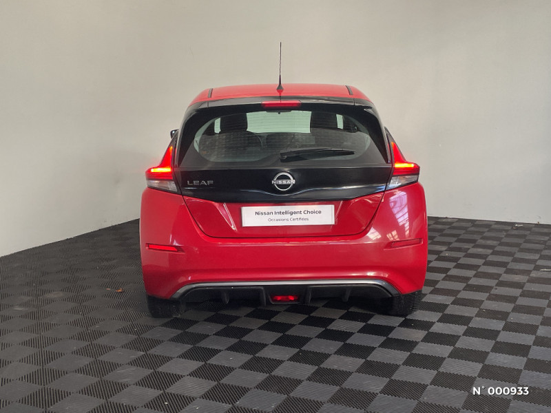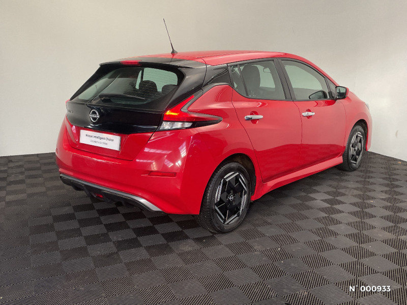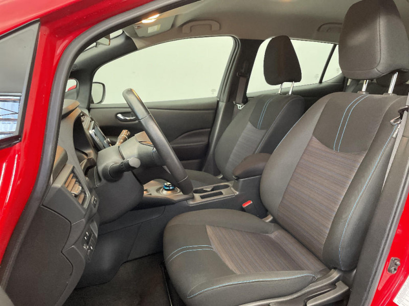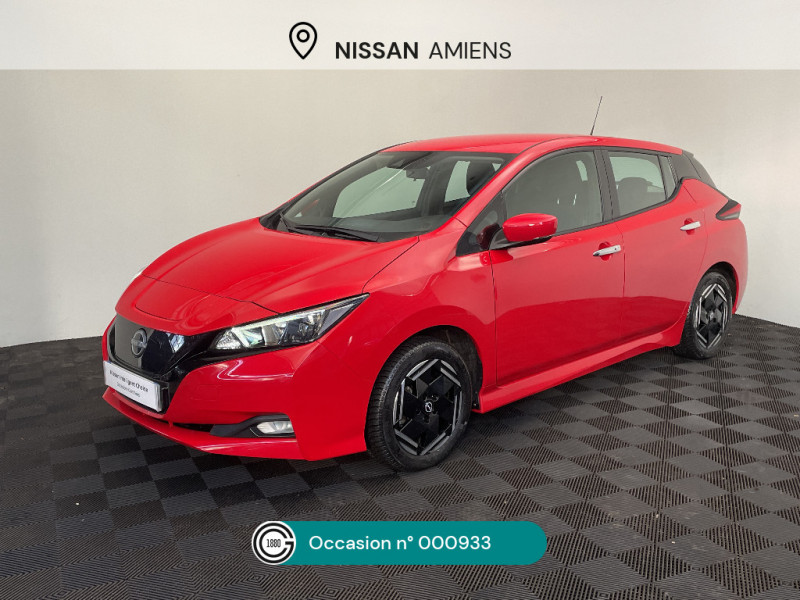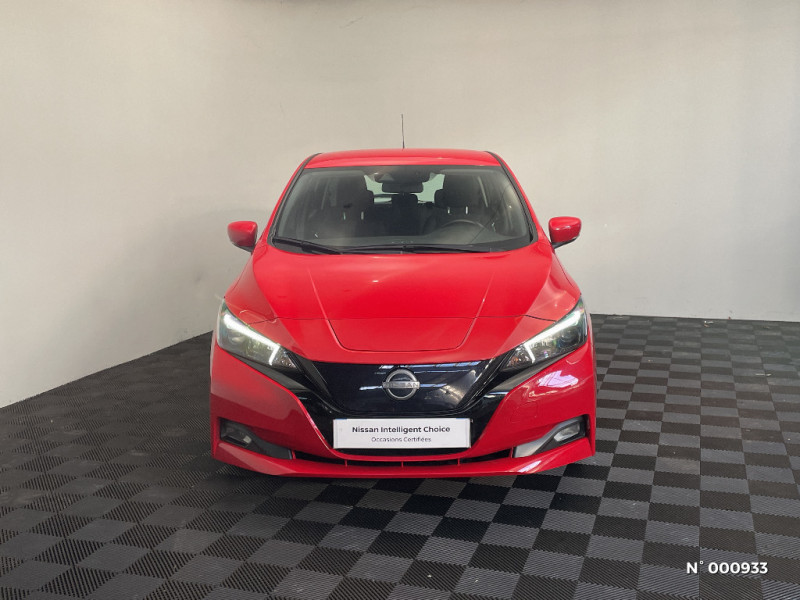 Extinction temporisé des phares "Follow me home" / Pack 100% Mobilité / Ouverture de la trappe de recharge depuis la clé / Pare-soleil côté conducteur et passager avec miroir de courtoisie / Poches aumonières au dos des sièges AV / Poignées de portes chromées / Points d'ancrage de siège enfant ISOFIX à l'AV et 2 à l'AR / Port CHAdeMO pour chargeur rapide 50 kW (recharge de 20% à 80% en 60 min sur 40 kWh ou 90 min sur 62 kWh) / Port USB à l'AV (x1) et l'AR (x2) / Prise auxiliaire Jack 3,5 mm / ABS et EBD / Allumage automatique des feux de détresse en cas d'accident / Câble de 6 m (recharge sur prise domestique 230V en 21h sur batterie 40 kWh ou 32h sur batterie 62 kWh) / Câble 32A de 6 m (recharge sur borne publique ou Wallbox 7 kW T2 en 7h30 sur 40 kWh ou 11h30 sur 62 kWh) / Système audio Bluetooth, AM/FM, RDS, DAB, MP3, USB (sans CD) / Système "Chassis Control" (contrôle actif de trajectoire et de l'assiette) / Système d'alerte anticollision AR intelligent / Système d'avertissement acoustique du véhicule (AVAS) / Système de climatisation avec pompe à chaleur / Système d'ouverture et de démarrage sans clé "Intelligent key" / Technologie E-pedal / Trois appuis-tête aux places AR / 6 HP / Feux AV halogènes avec signature lumineuse à LED / Feux de route intelligents / Feux diurne LED avec signature lumineuse / Freinage d'urgence intelligent (AEB) avec détection piéton / Indicateur de température extérieure / Kit de réparation pneumatique / Nissan Connect Services / Nissan Connect 8.0 / Rétroviseurs extérieurs couleur carrosserie avec clignotant à LED intégré / Sécurité enfants sur les portes AR / Sellerie tissu Noir ou Gris Clair / Son d'alerte pour piétons désactivable / Surveillance des angles morts incluant voyant lumineux sur rétroviseurs extérieurs / Prise 12V sur console centrale AV / Programmation de la recharge / Chargeur embarqué de 6,6kW (pour recharge en 7h sur une wallbox de 32A) / Combiné d'instrumentation avec écran HD TFT 7" couleur / Commandes au volant (audio, Bluetooth, régulateur et limiteur de vitesses et contrôle de l'ordinate ur de bord) / Contrôle vocal Nissan / Eclairage de la trappe de recharge / Ecran tactile multimedia 8"compatible Apple Car Play et Android Auto et caméra de recul
